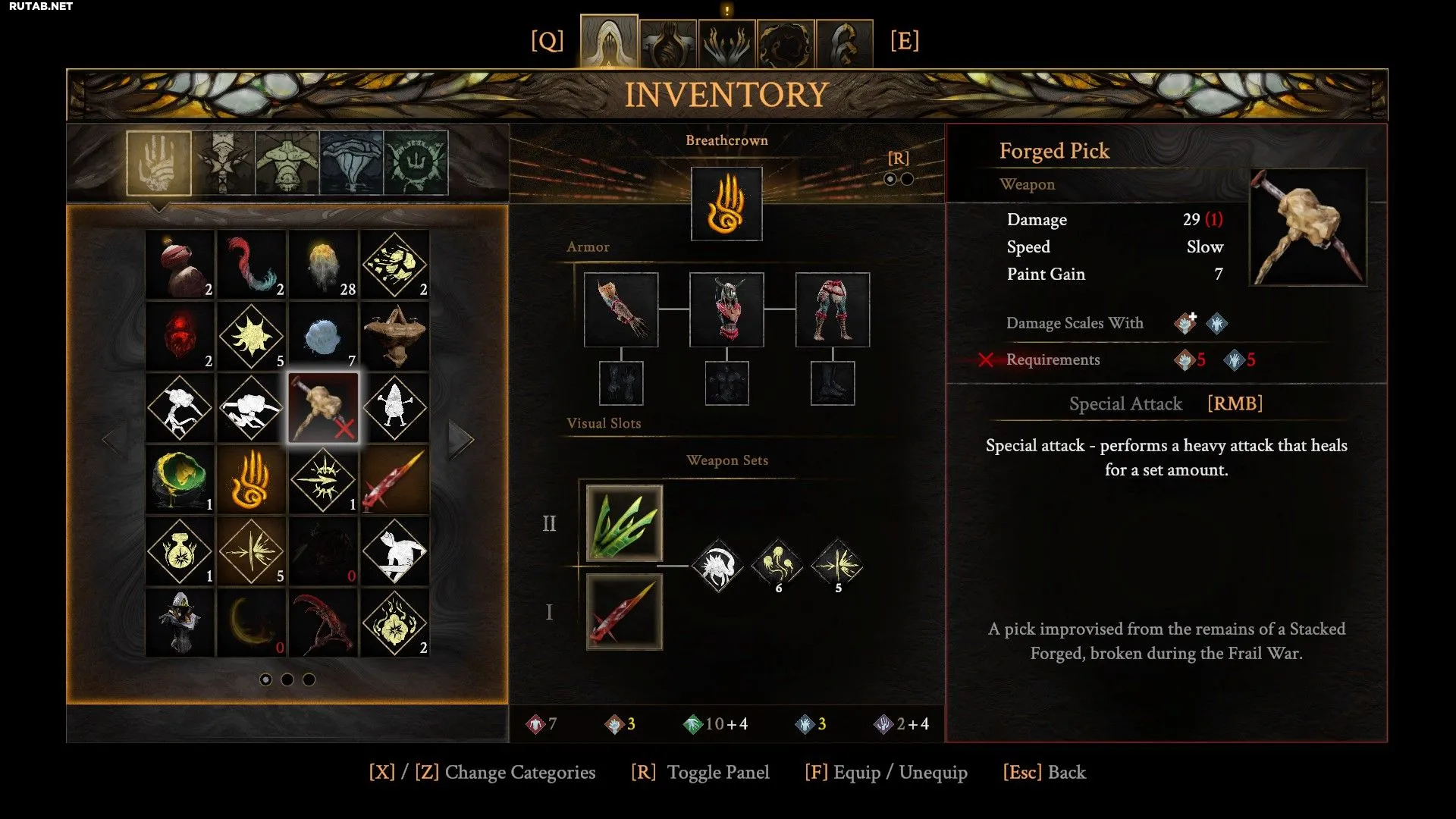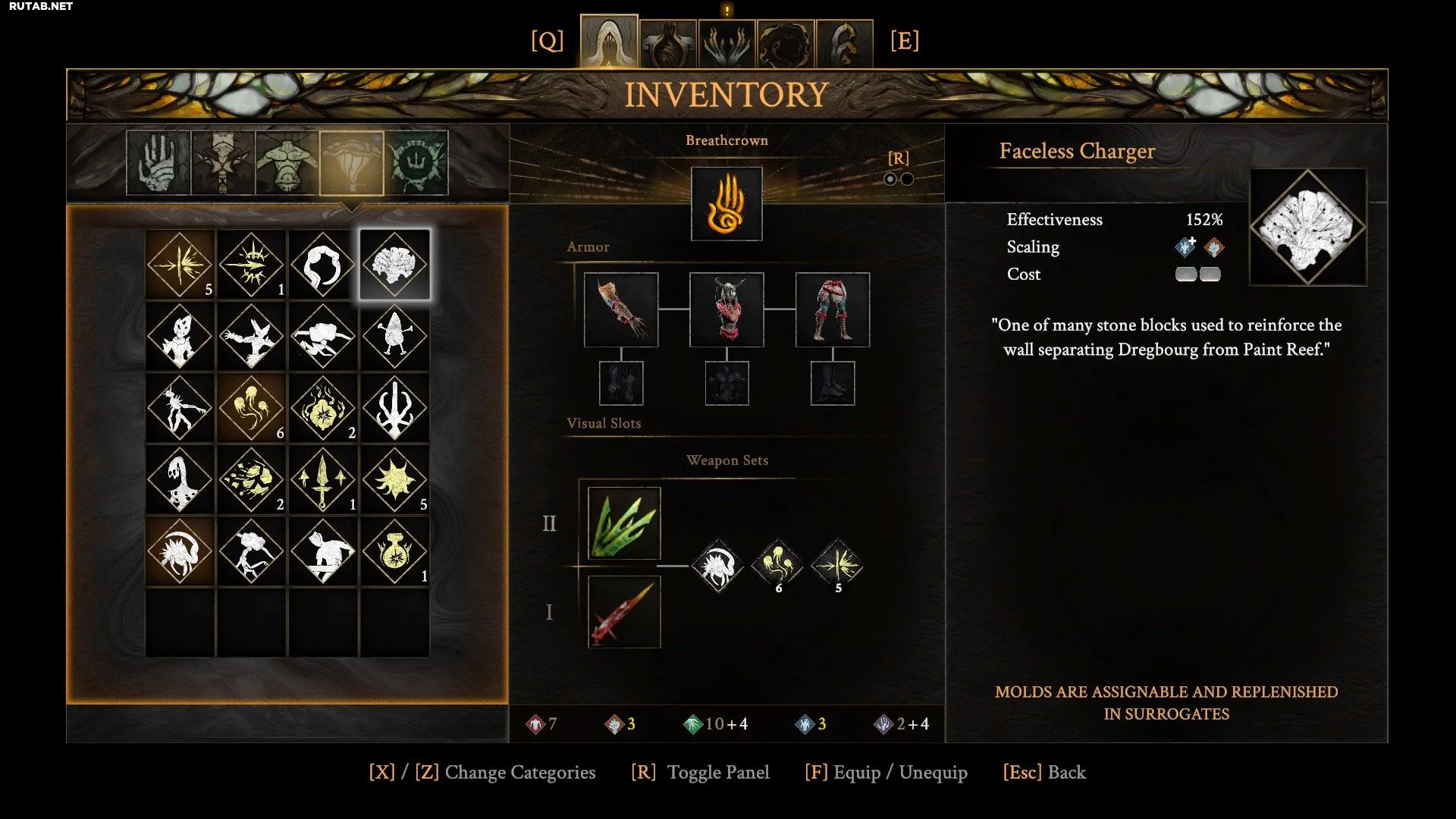 Наконец, Вместимость Дыхания. Эта жёлтая полоса представляет жизненную силу нашего Кузнеца и возможность восстановления здоровья (клавиша E). Лечиться можно только при полностью заполненной ячейке Вместимости Дыхания. Увеличение этого параметра через взаимодействие с Альвеолами (особыми конструкциями, спрятанными на картах) позволяет сохранять дополнительный заряд лечения. Это, по сути, единственный способ исцеления в бою и вне его, кроме как перерождения у Суррогата, которое, как и в любой Souls-игре, сбрасывает зону и возрождает врагов.