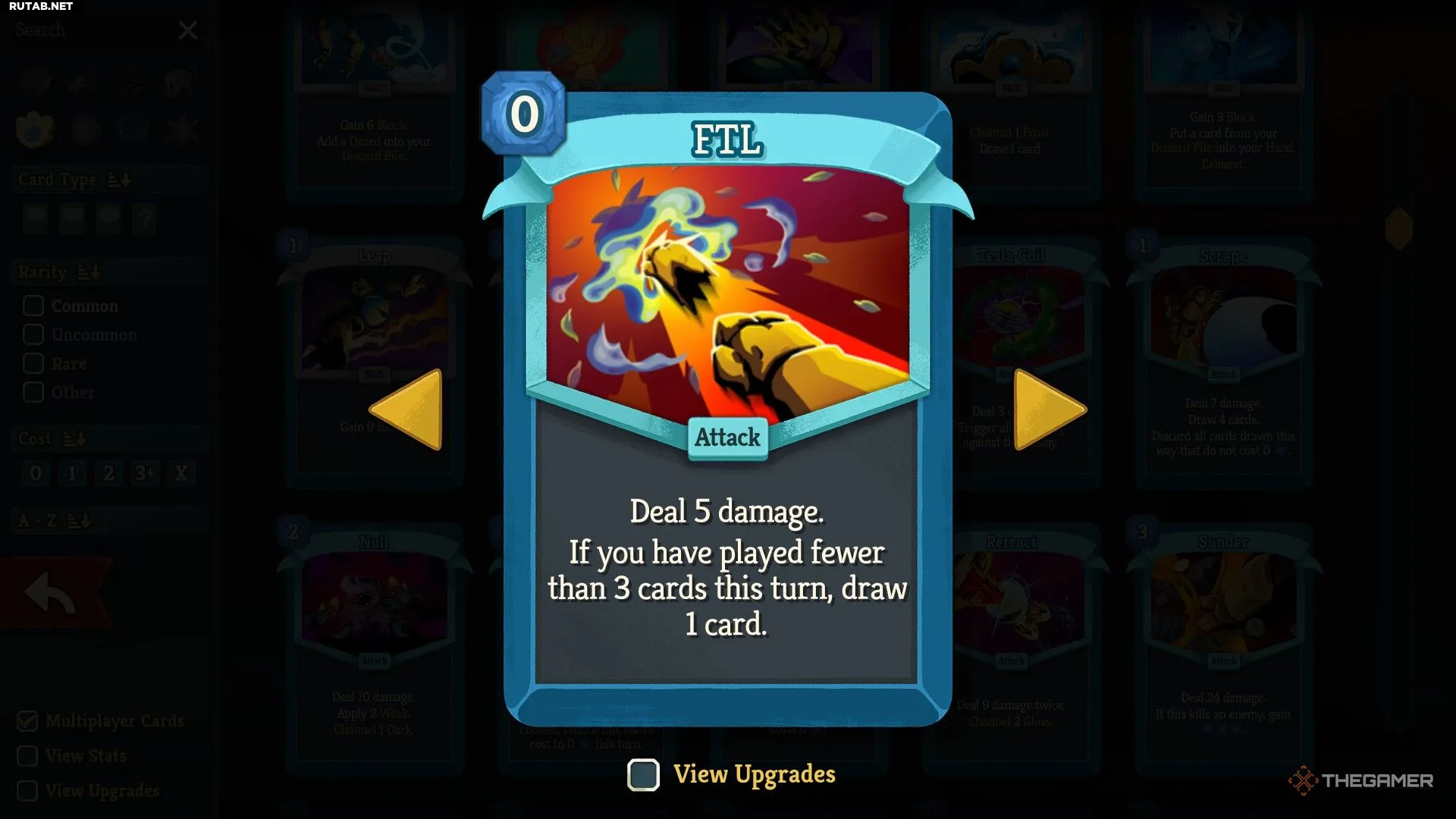 - FTL (Стоимость: 0) — Наносит 5 урона. Если в этом ходу вы разыграли меньше трёх карт, берёте 1 карту.
