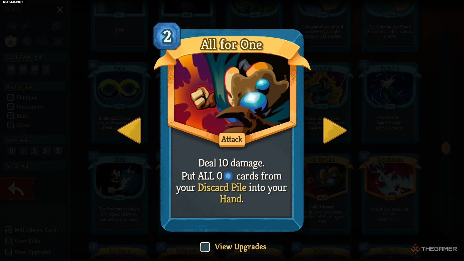 - Всё за одного (Стоимость: 2) — Наносит 10 урона. Возвращает все карты стоимостью 0 из вашего сброса в руку.