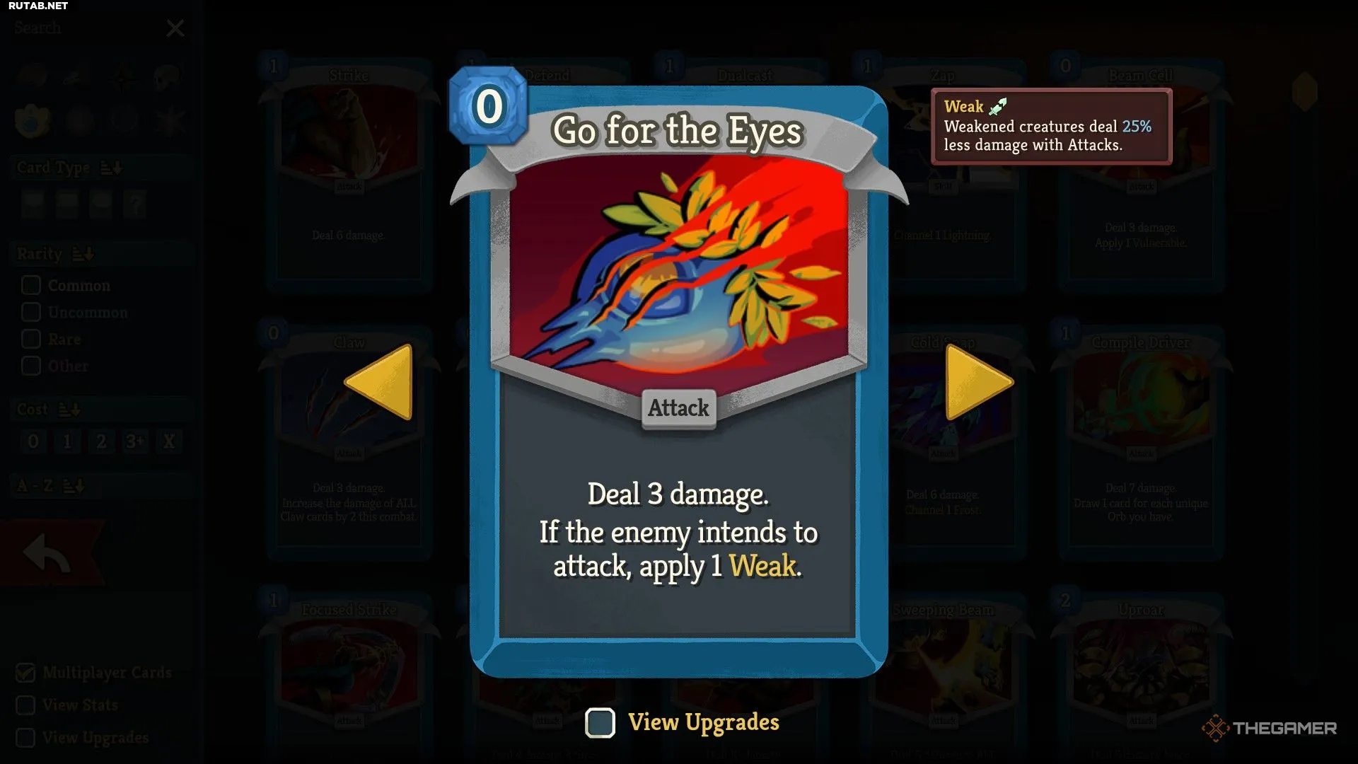 У Дефекта есть и другие карты с нулевой стоимостью, наносящие урон, например, «Целься в глаза» (также накладывает 1 Слабость) и «FTL» (позволяет взять 1 карту, если в текущем ходу вы разыграли меньше трёх карт).