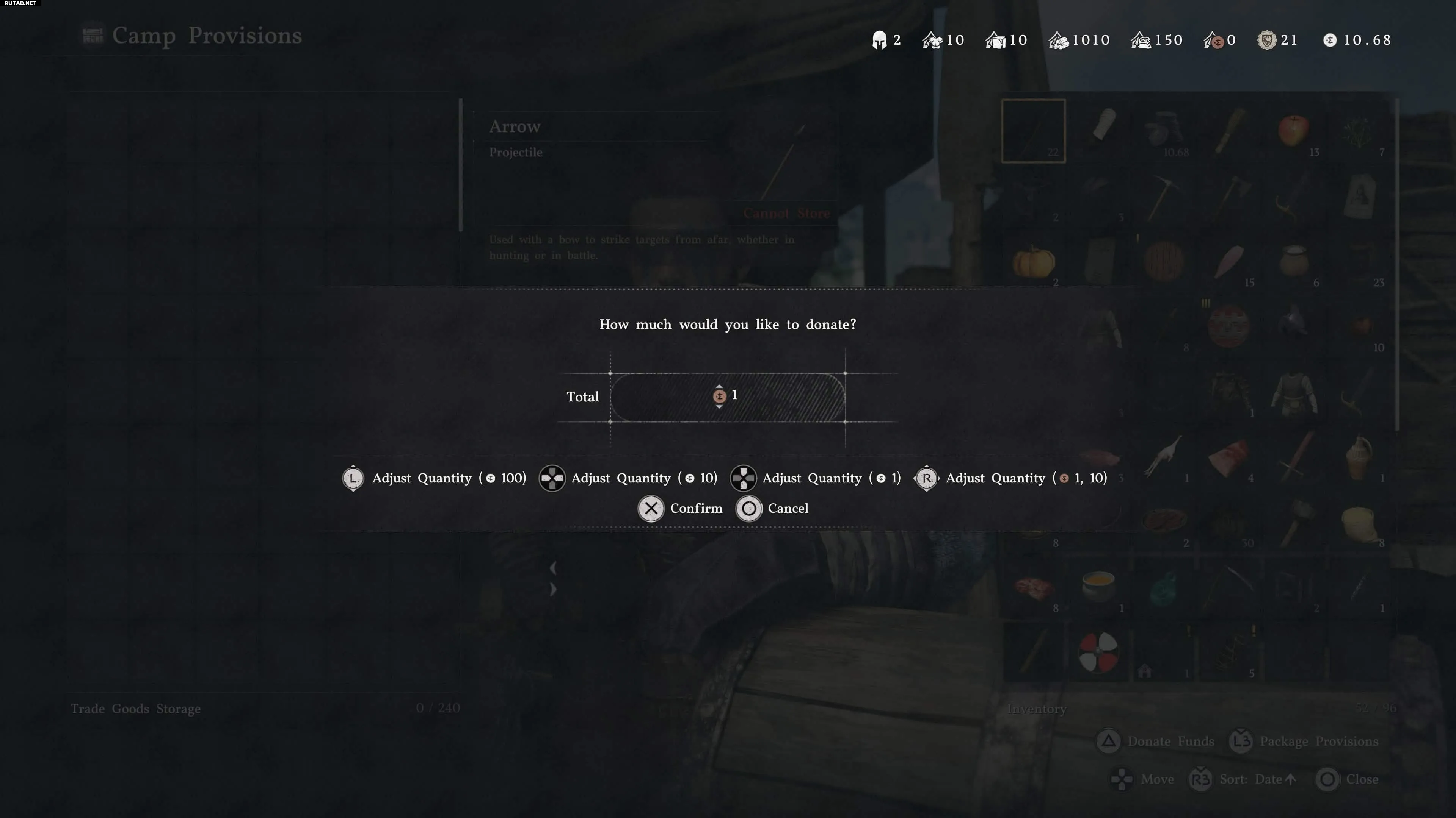 Это работает аналогично припасам: пожертвования увеличивают количество материалов, доступных вашим товарищам и лагерю, что позволяет браться за большее количество миссий. Кроме того, по мере увеличения пожертвований вы можете получать различные награды.