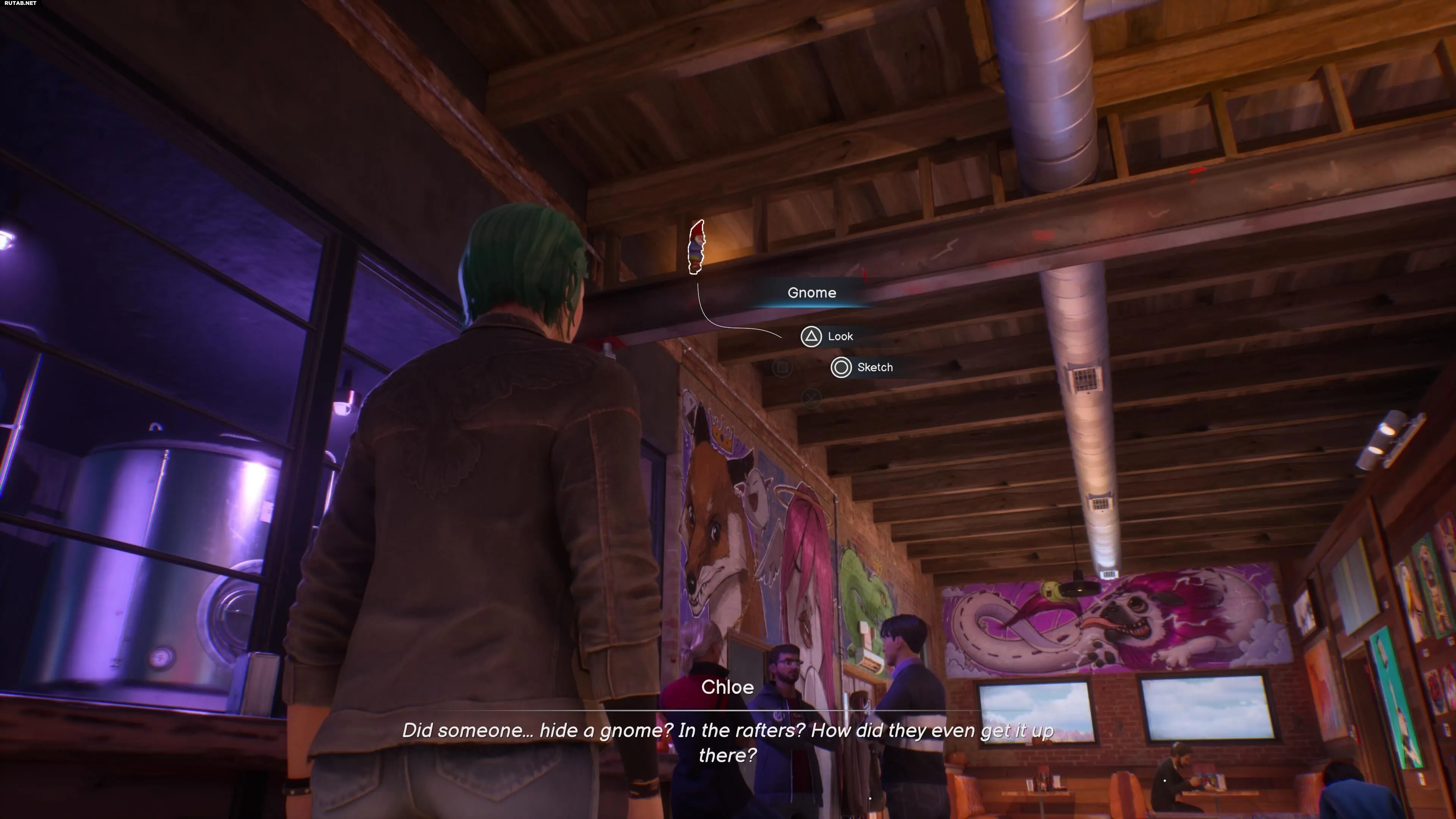 Где найти: Вернувшись в бар перед протестом, посмотрите наверх, на балки возле пивоваренных танков, чтобы заметить гнома. Нажмите на опцию зарисовки. Здесь же можно получить достижение «Не крыса», убедив Джоуи, что вы часть протеста.
