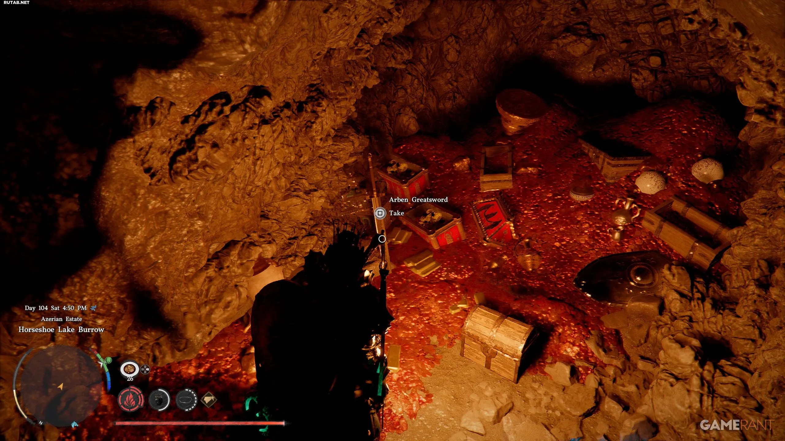 - Внутри пещеры идите на юг, чтобы найти двуручный меч Арбен, прислонённый к стене среди кучи сокровищ.