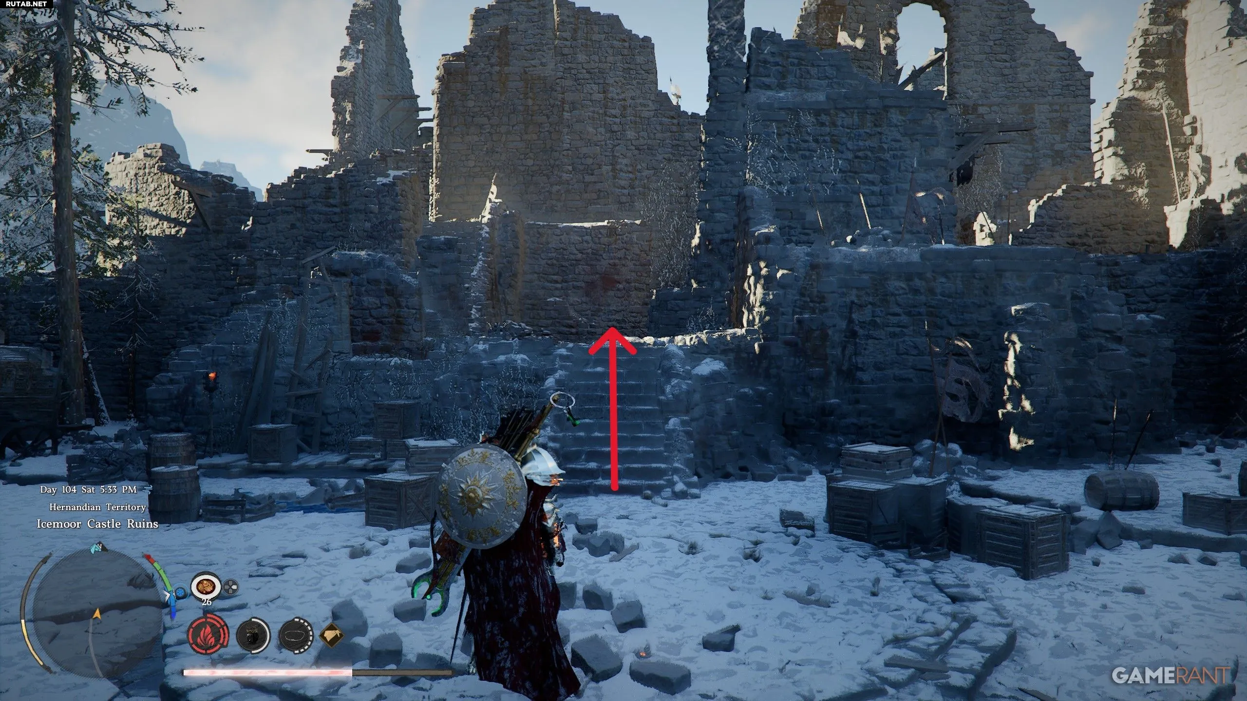 - Добравшись до руин, направляйтесь на север, чтобы найти лестницу.