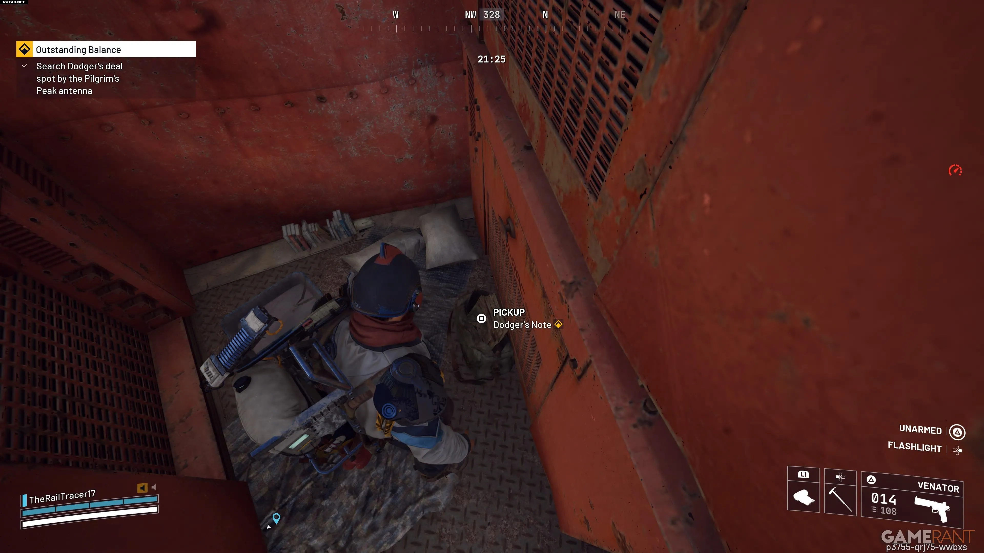 Следующая точка — место сделки возле «Пика Пилигрима». Направляйтесь туда и найдите зиплайн, ведущий на крышу. К нему можно подняться снаружи, обойдя основное здание к «Коммуникационной вышке», или пройти через здание и открыть дверь рядом с комнатой, где находится ключ от этой вышки.