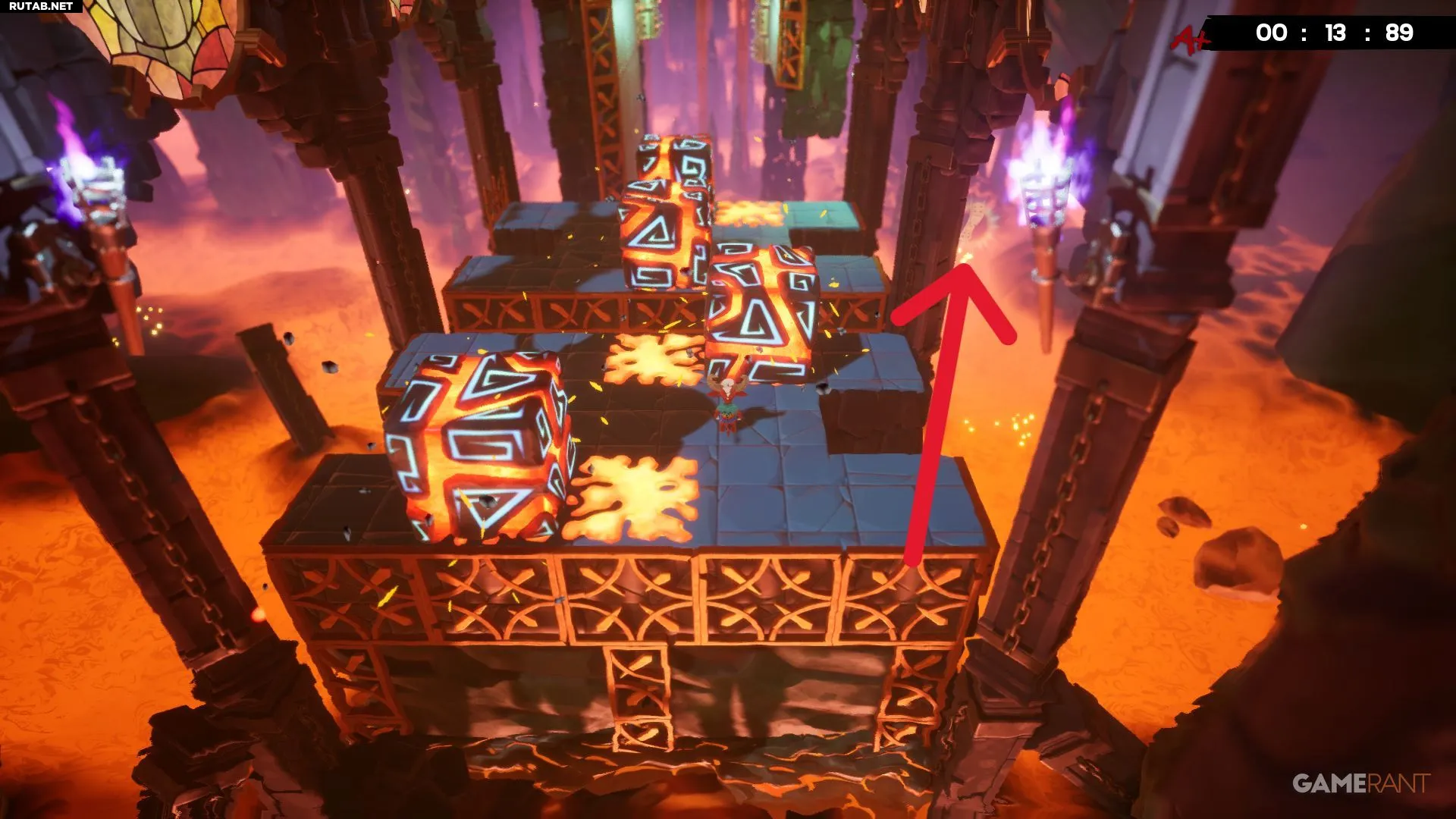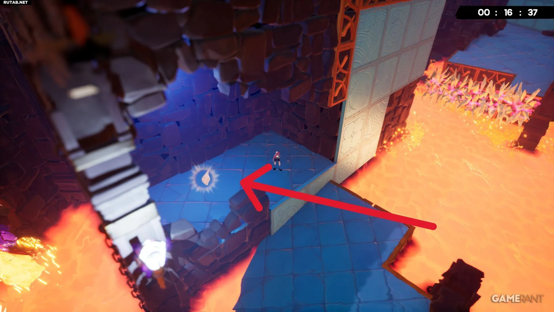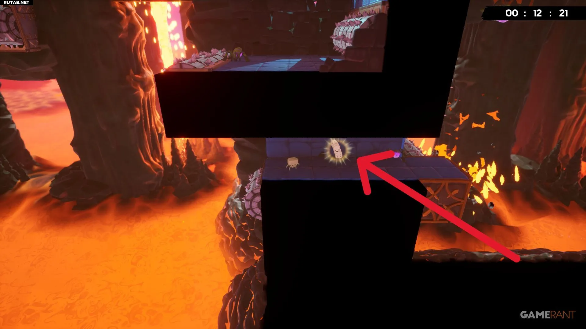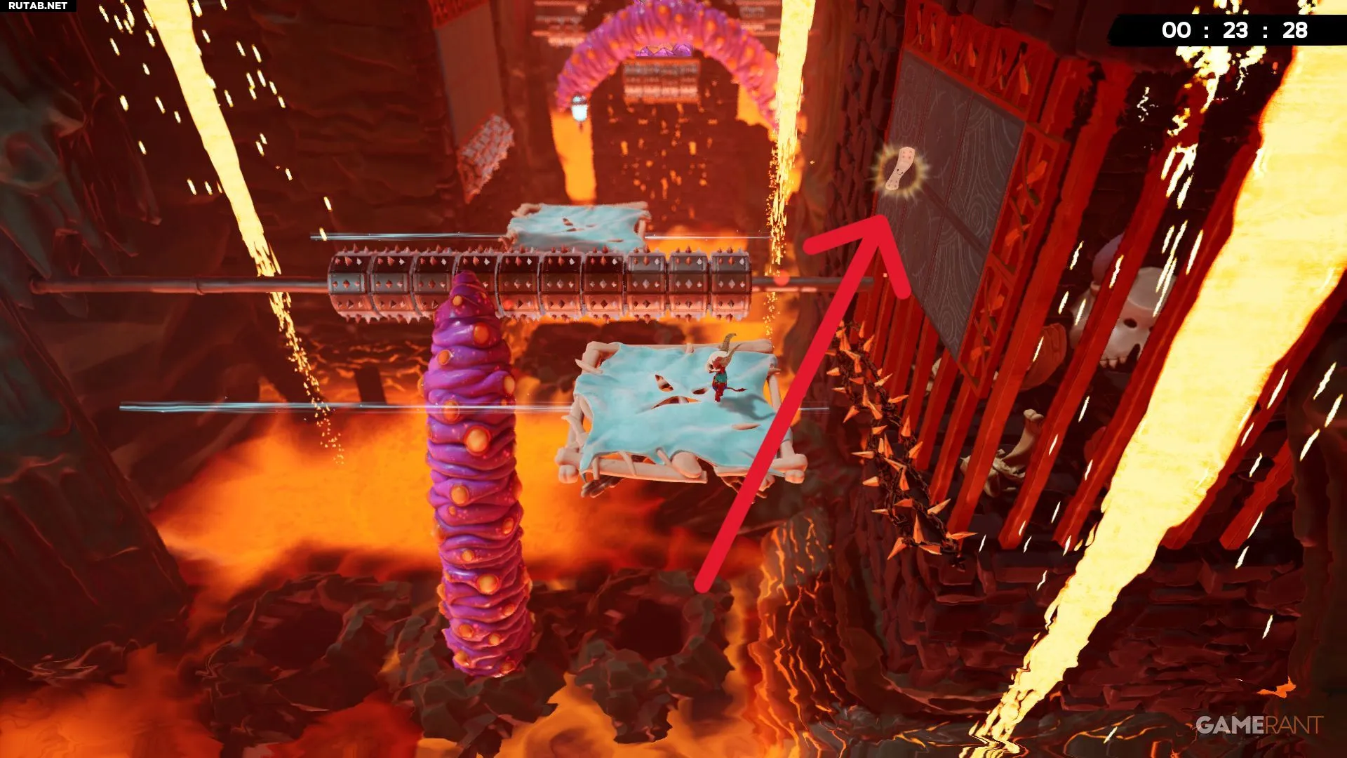Бинт на уровне «Магмовые пустоши» можно заметить почти сразу. Первое препятствие — это блоки, переворачивающиеся в разные стороны. Справа от этой большой платформы бинт находится по другую сторону колонны.