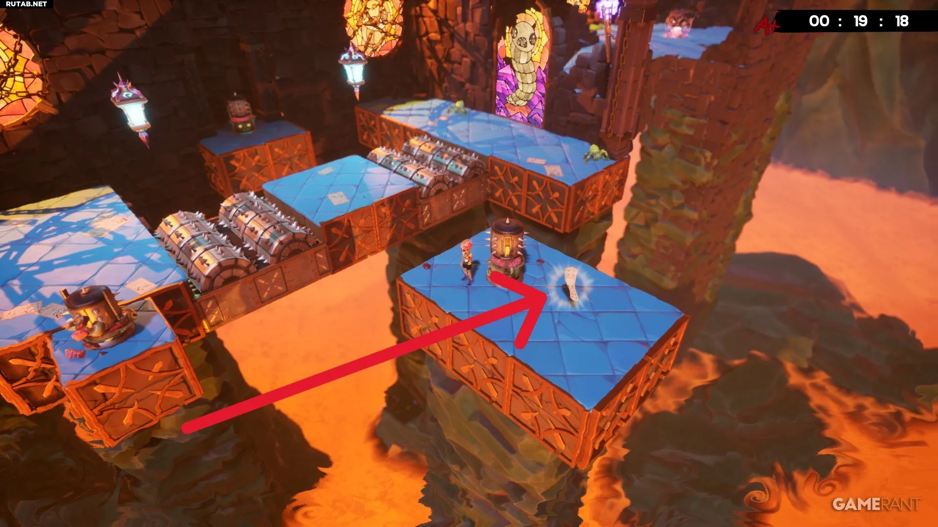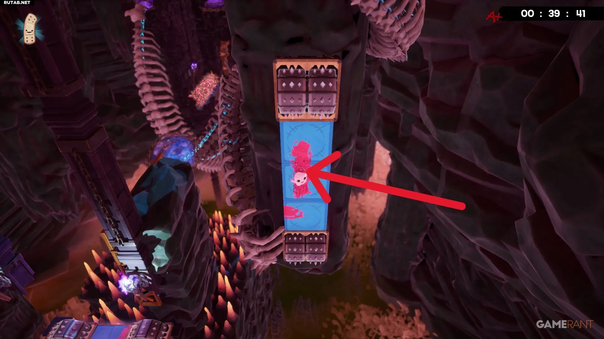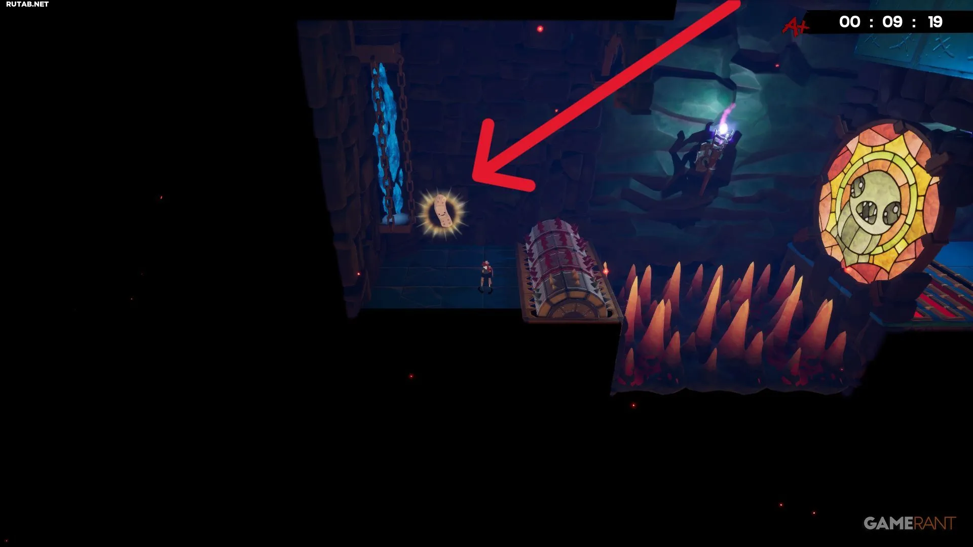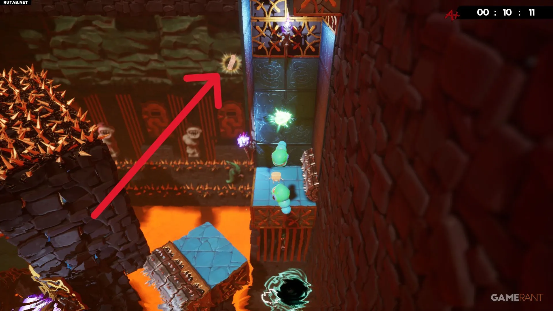 Разбив жёлтое витражное окно на уровне «Лавовая пытка», вы окажетесь недалеко от бинта. Он лежит в небольшой нише слева, и чтобы его забрать, придётся увернуться от катящихся шипастых шаров. Учитывая, что лава поднимается, времени на раздумья не будет — схватите бинт и бегите. К счастью, финиш уже близко, и с быстрым персонажем, таким как Эд, здесь даже можно получить оценку «A+».