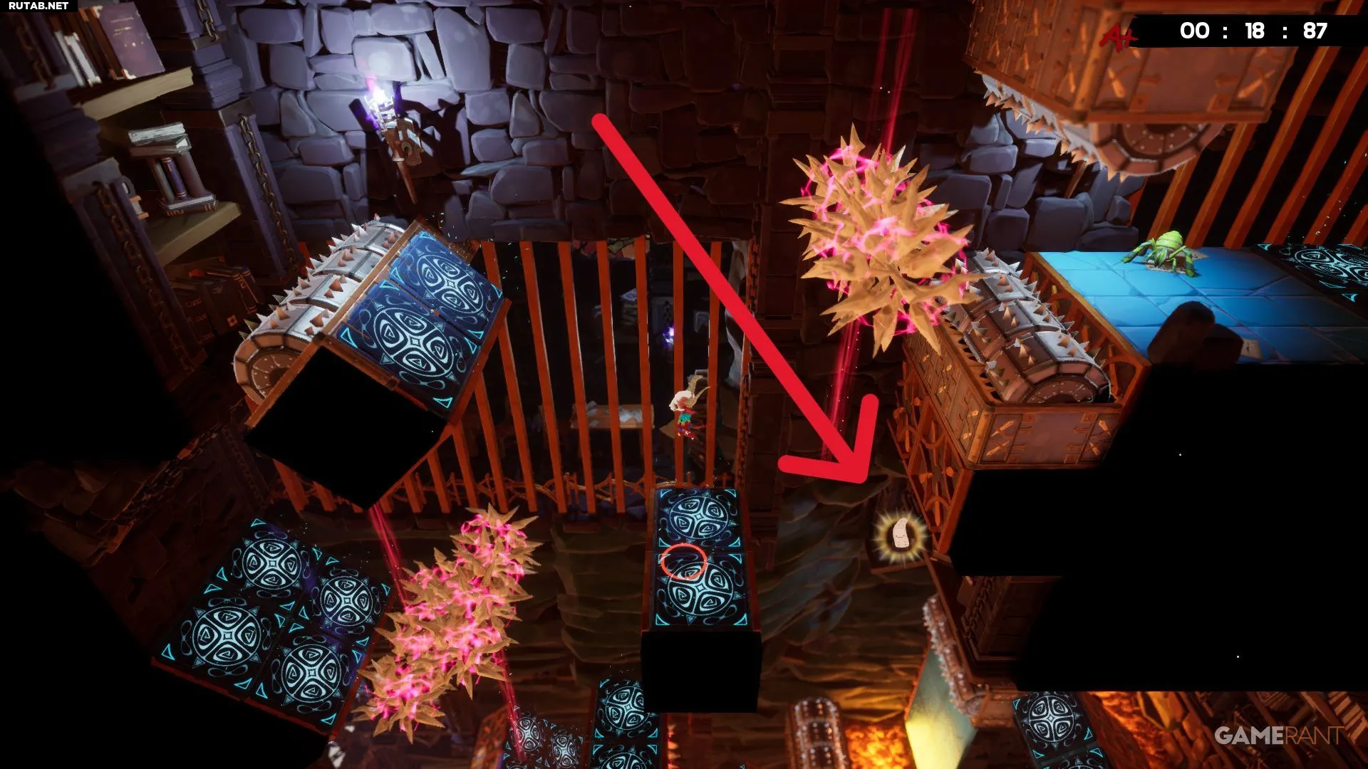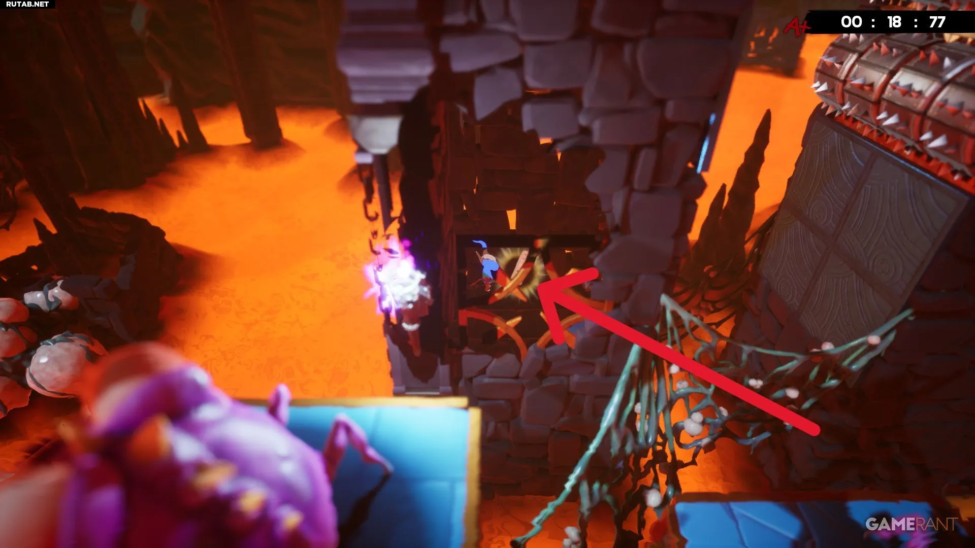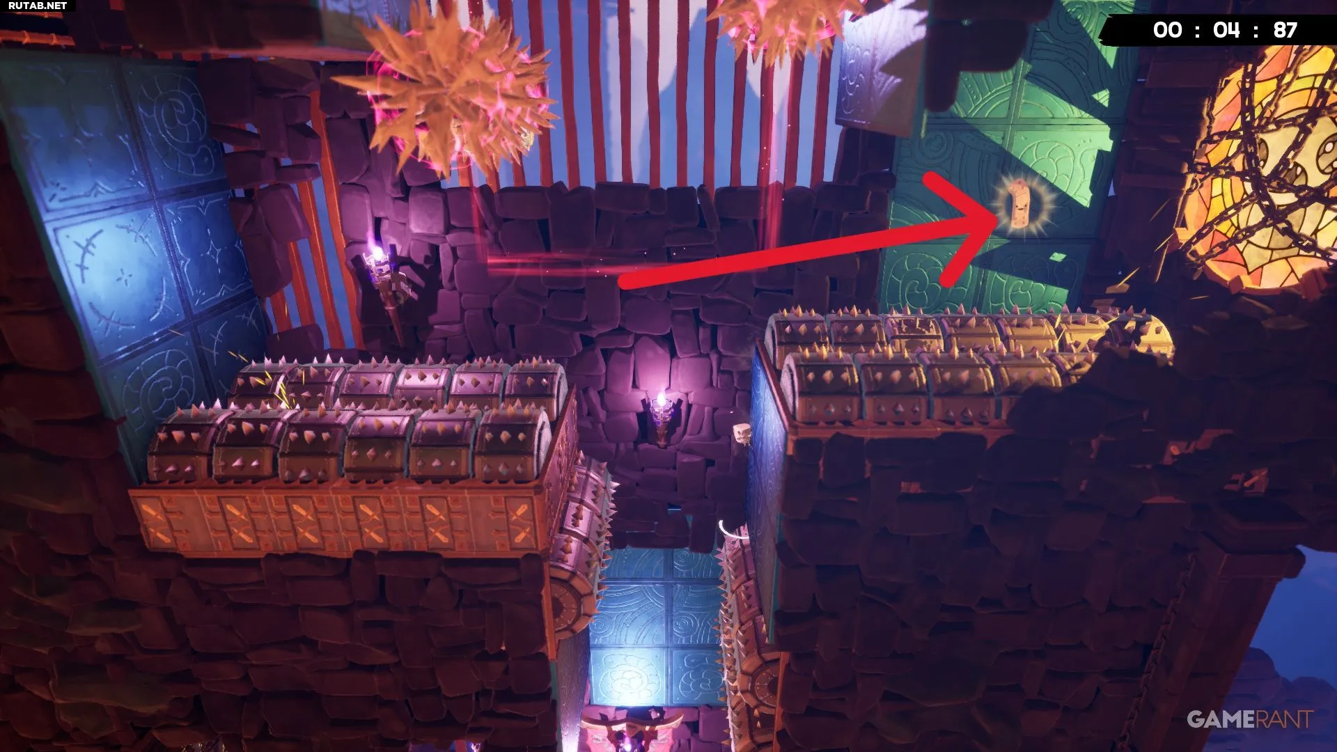 Разбив жёлтое витражное окно на уровне «Лавовая пытка», вы окажетесь недалеко от бинта. Он лежит в небольшой нише слева, и чтобы его забрать, придётся увернуться от катящихся шипастых шаров. Учитывая, что лава поднимается, времени на раздумья не будет — схватите бинт и бегите. К счастью, финиш уже близко, и с быстрым персонажем, таким как Эд, здесь даже можно получить оценку «A+».