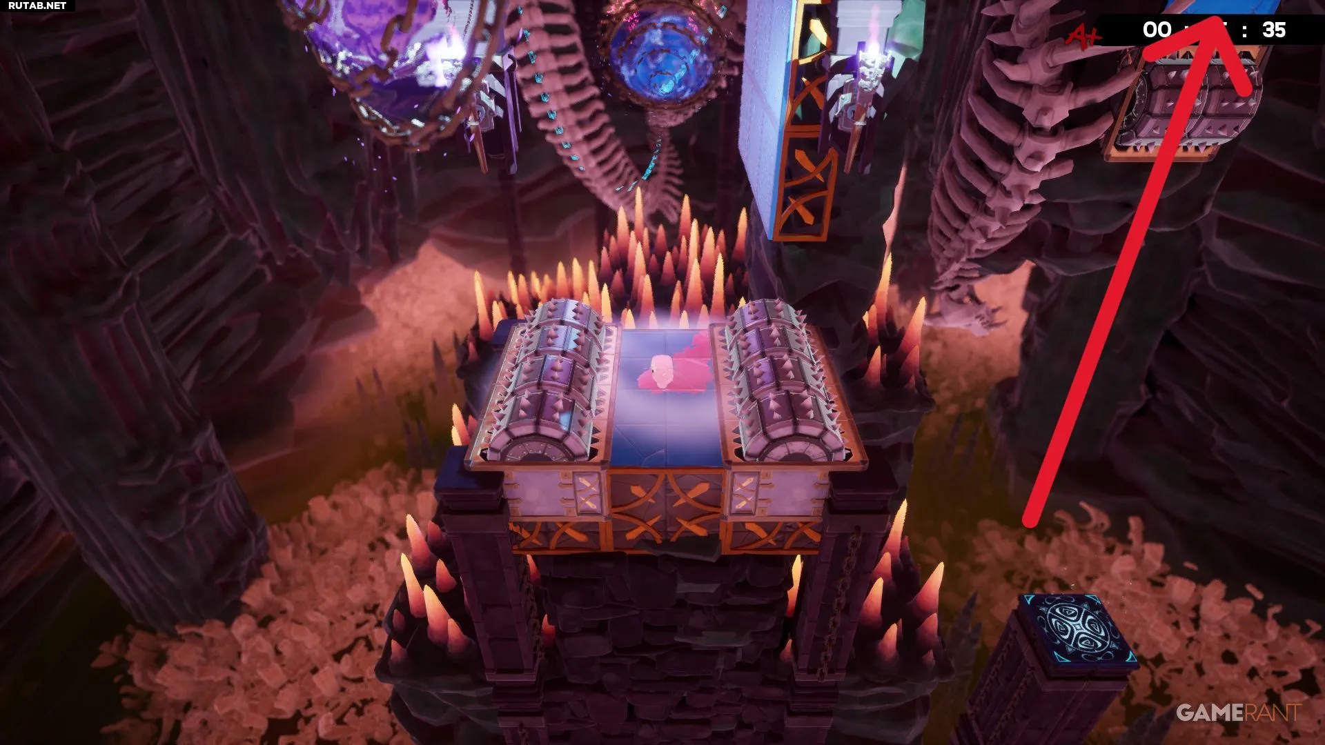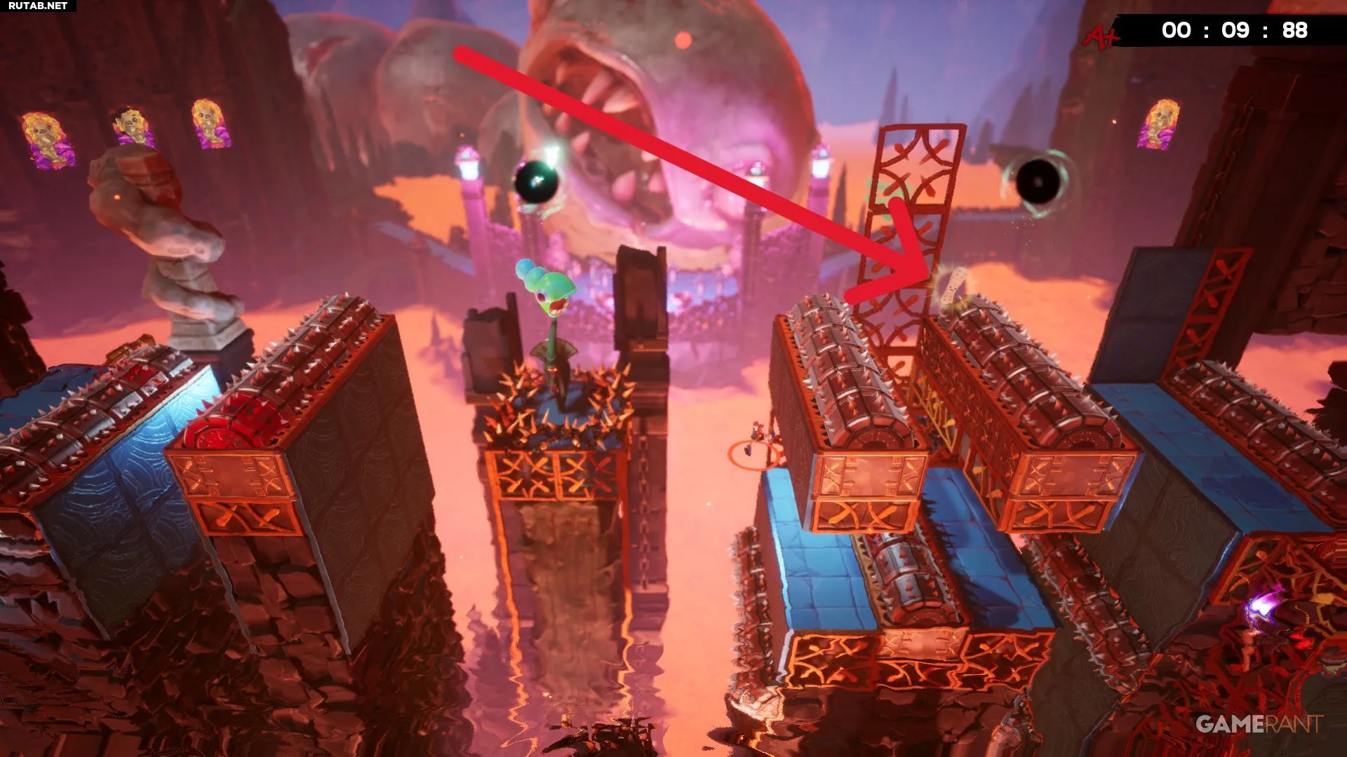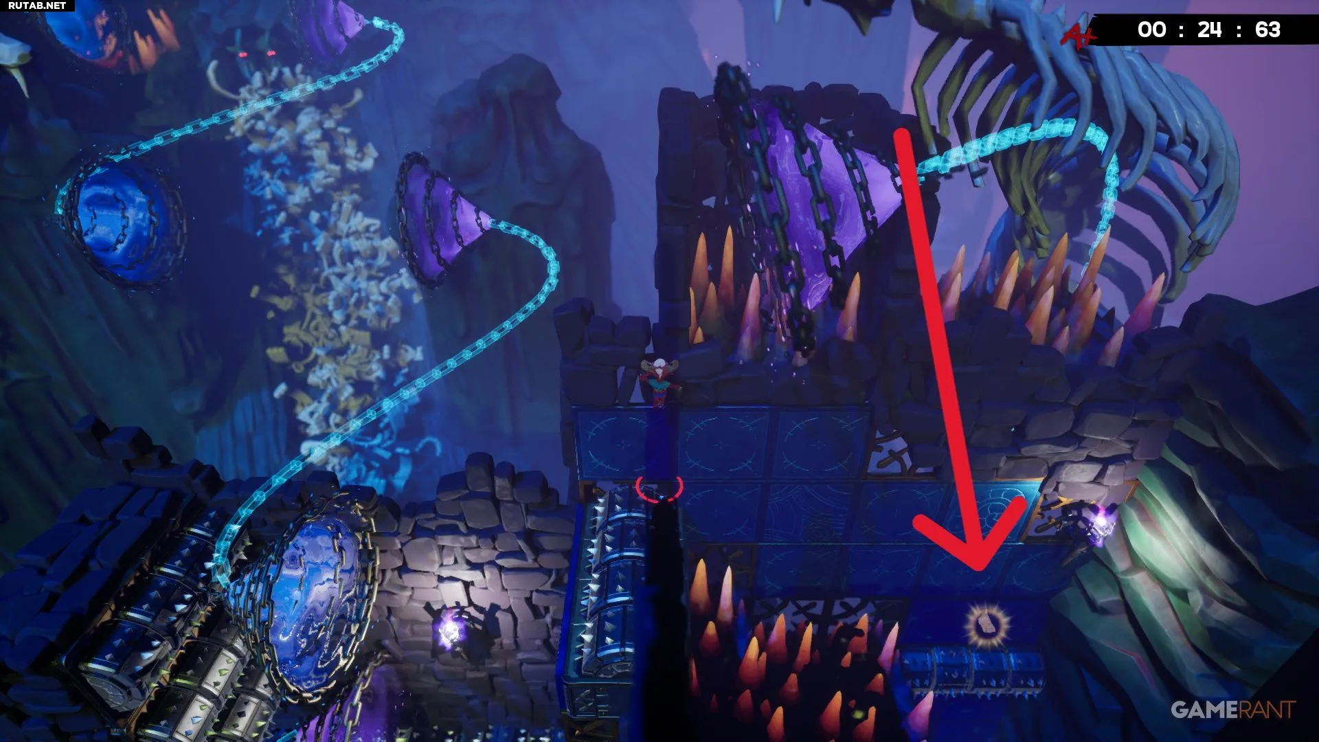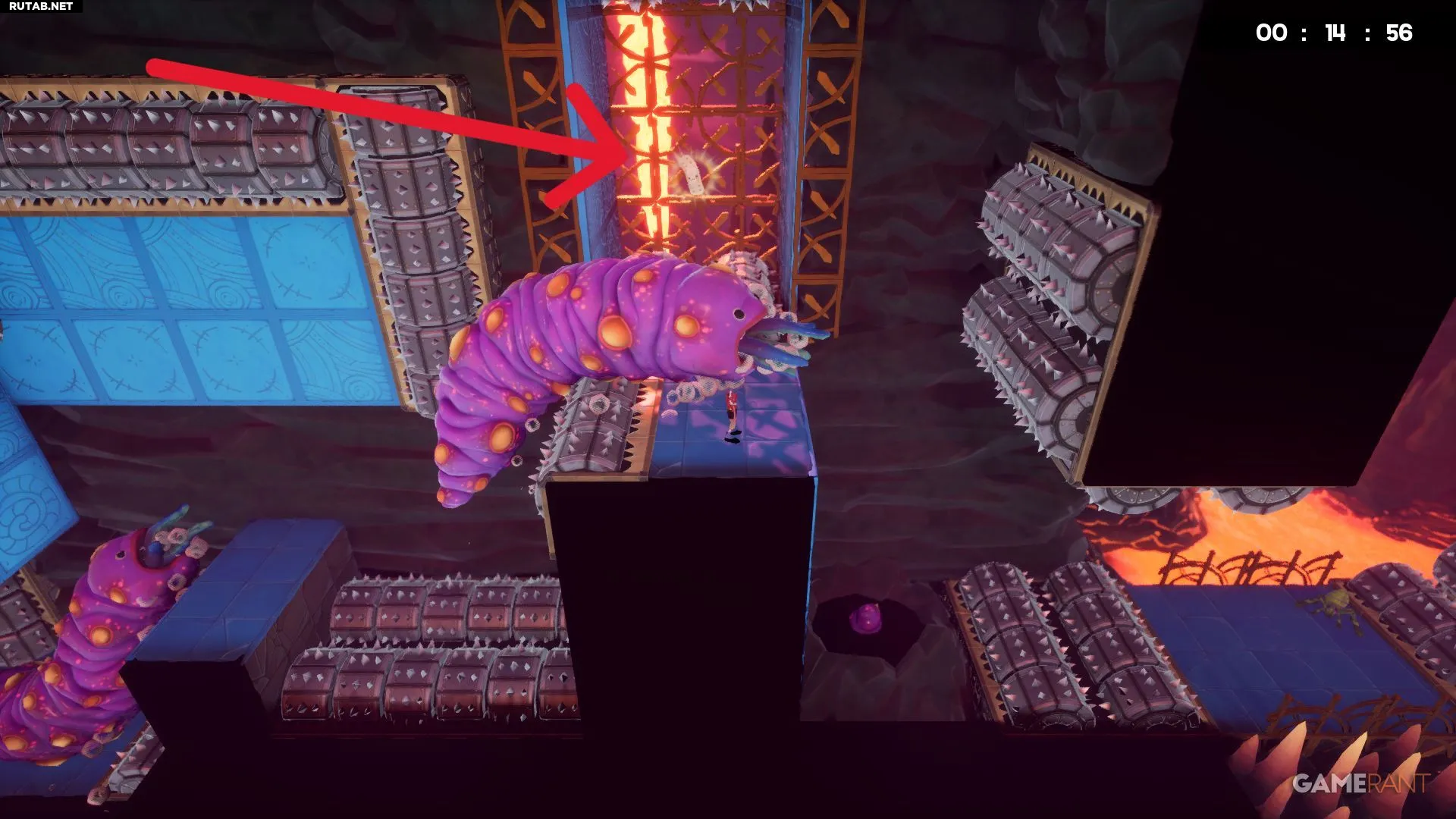 Разбив жёлтое витражное окно на уровне «Лавовая пытка», вы окажетесь недалеко от бинта. Он лежит в небольшой нише слева, и чтобы его забрать, придётся увернуться от катящихся шипастых шаров. Учитывая, что лава поднимается, времени на раздумья не будет — схватите бинт и бегите. К счастью, финиш уже близко, и с быстрым персонажем, таким как Эд, здесь даже можно получить оценку «A+».