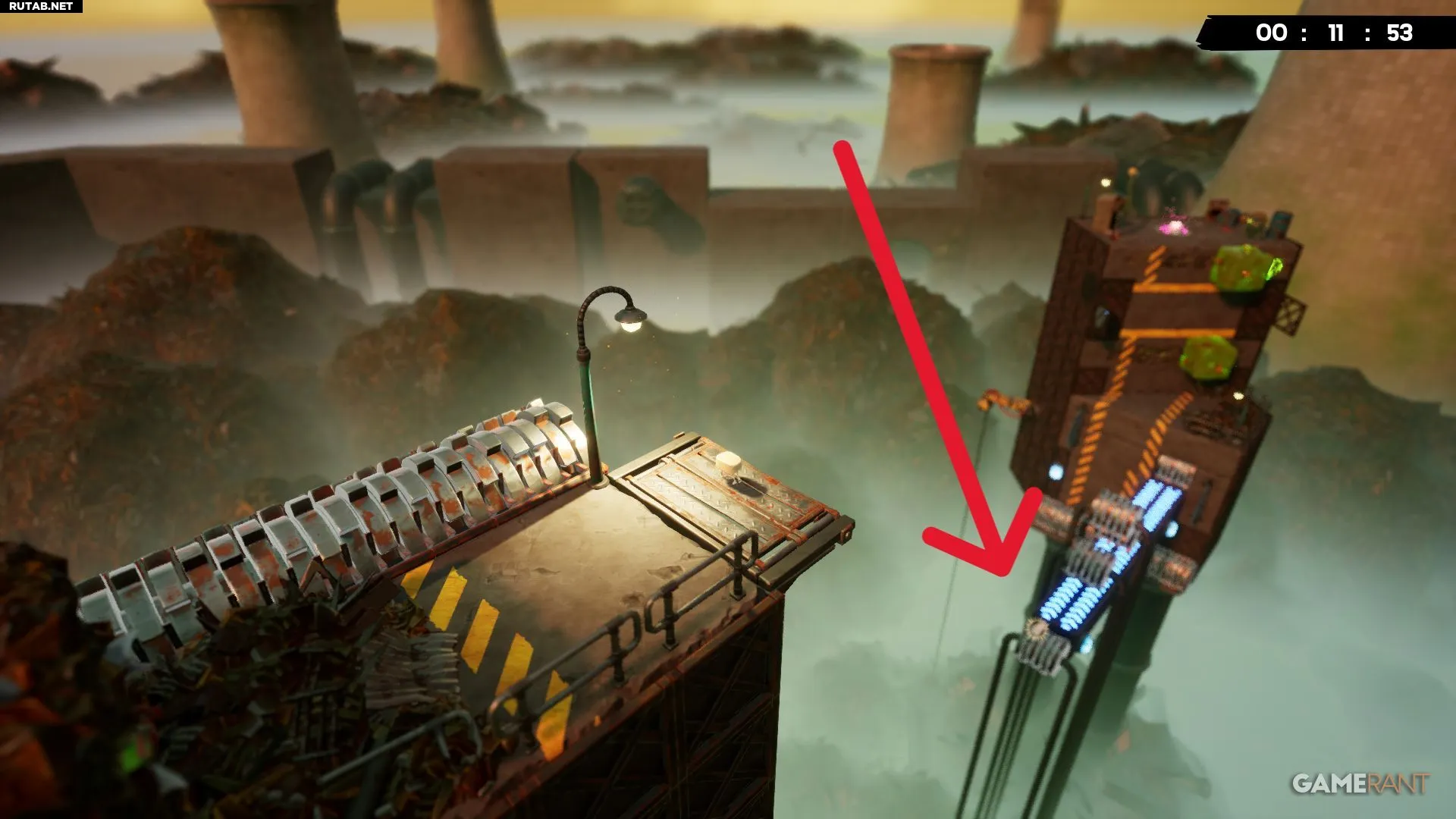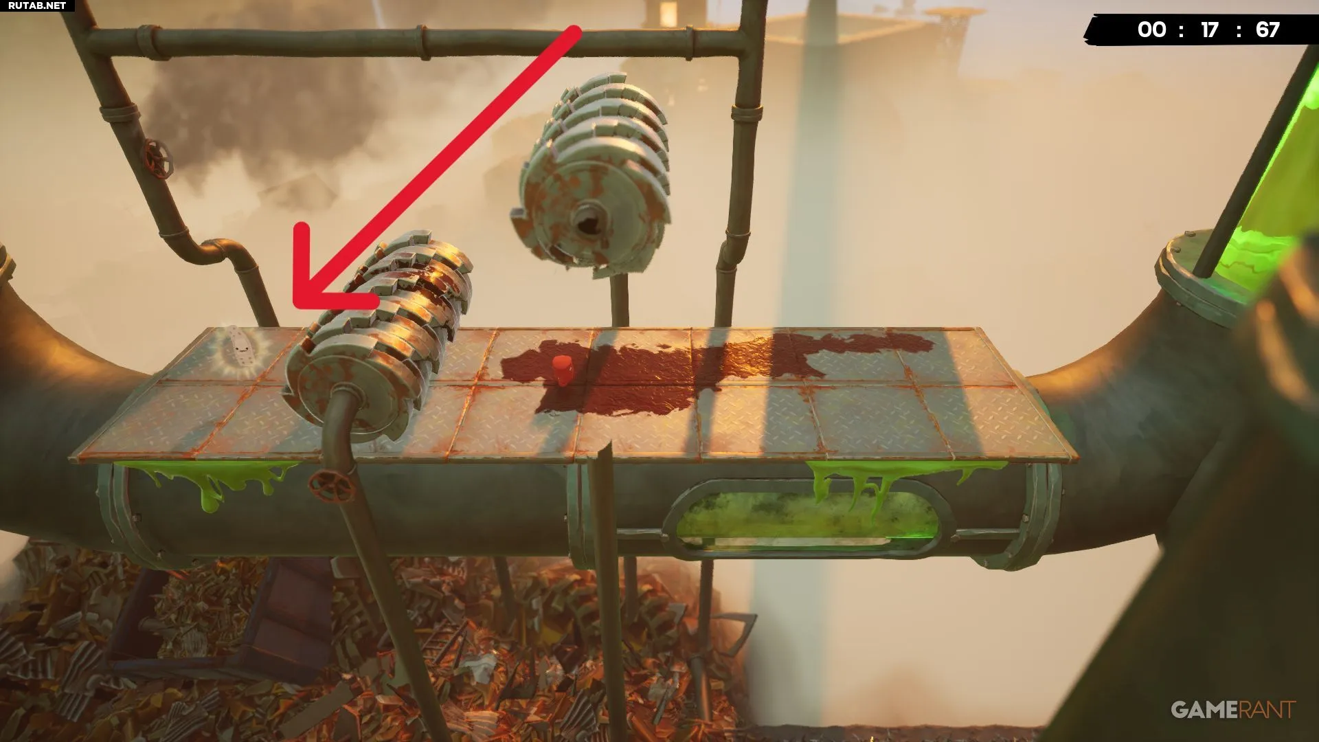 Довольно скоро на уровне игроки приземлятся на исчезающий мусор между двумя измельчителями. Оставайтесь на месте, пока пол не исчезнет, так как под ним ждёт бинт.