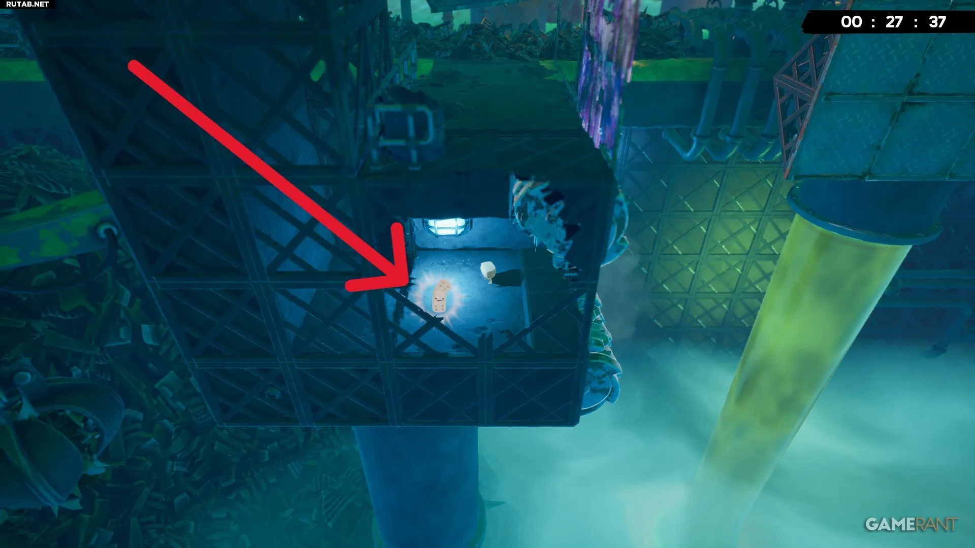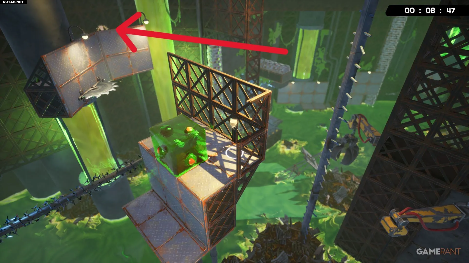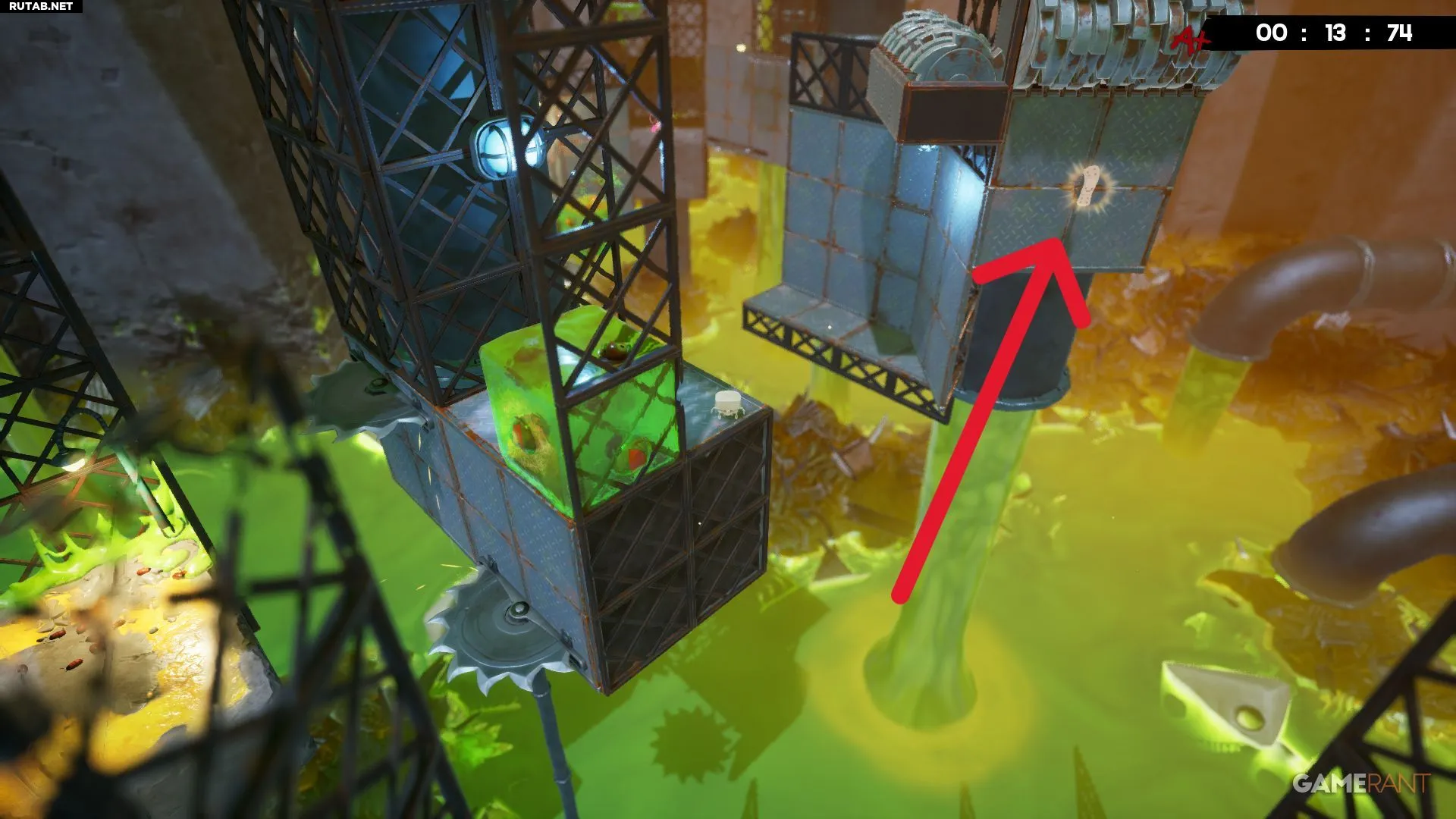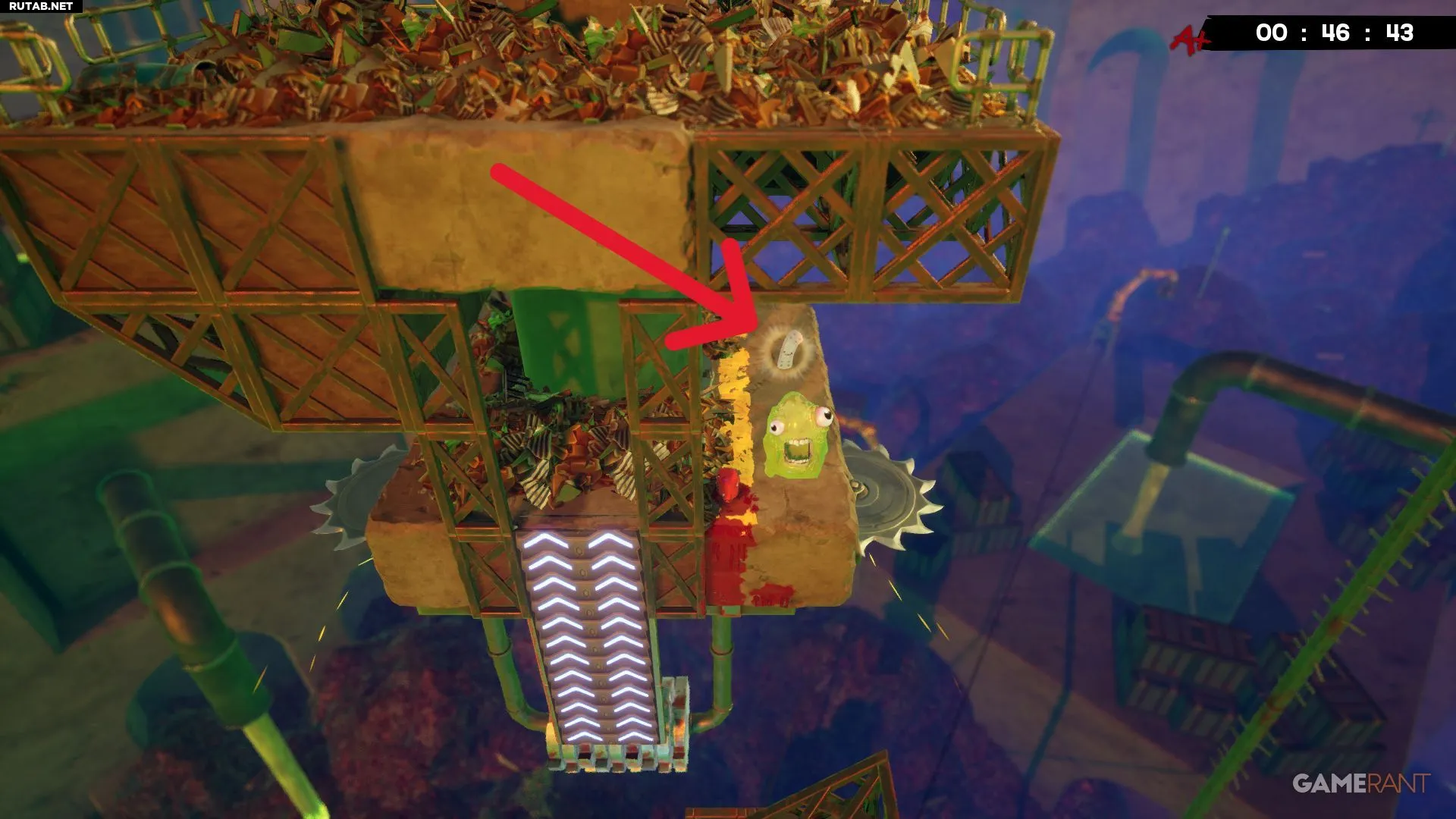 Примерно на середине уровня «Токсичные неприятности» вы будете прыгать между двумя платформами с собственными разъедающими кубами. Следующий прыжок довольно длинный, но бинт будет виден справа, прямо под измельчителем.