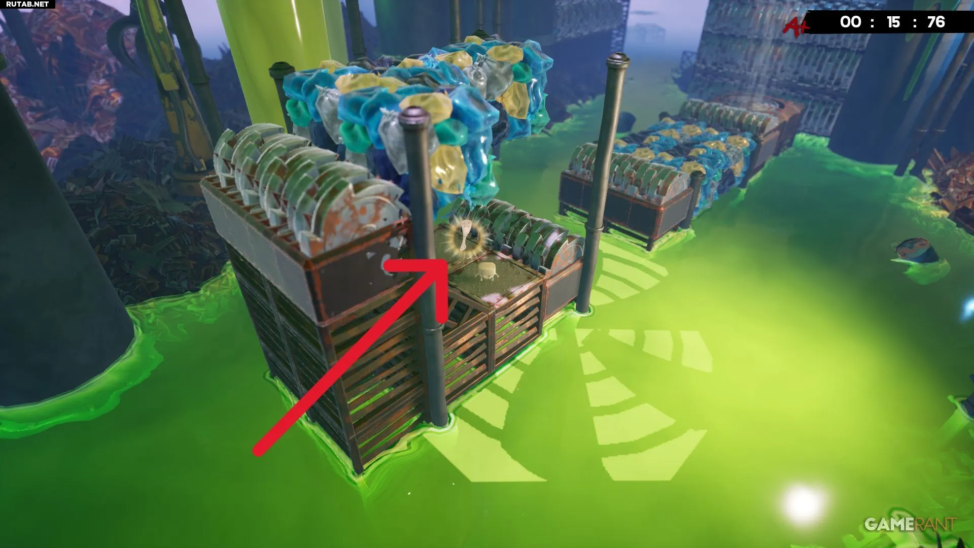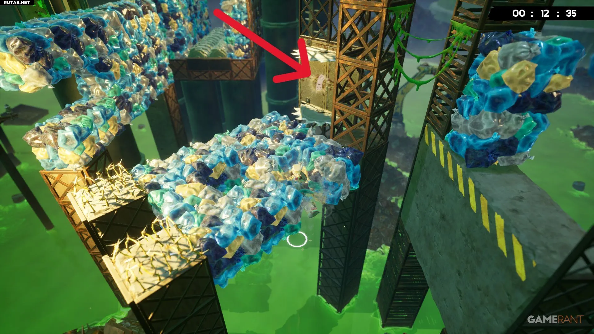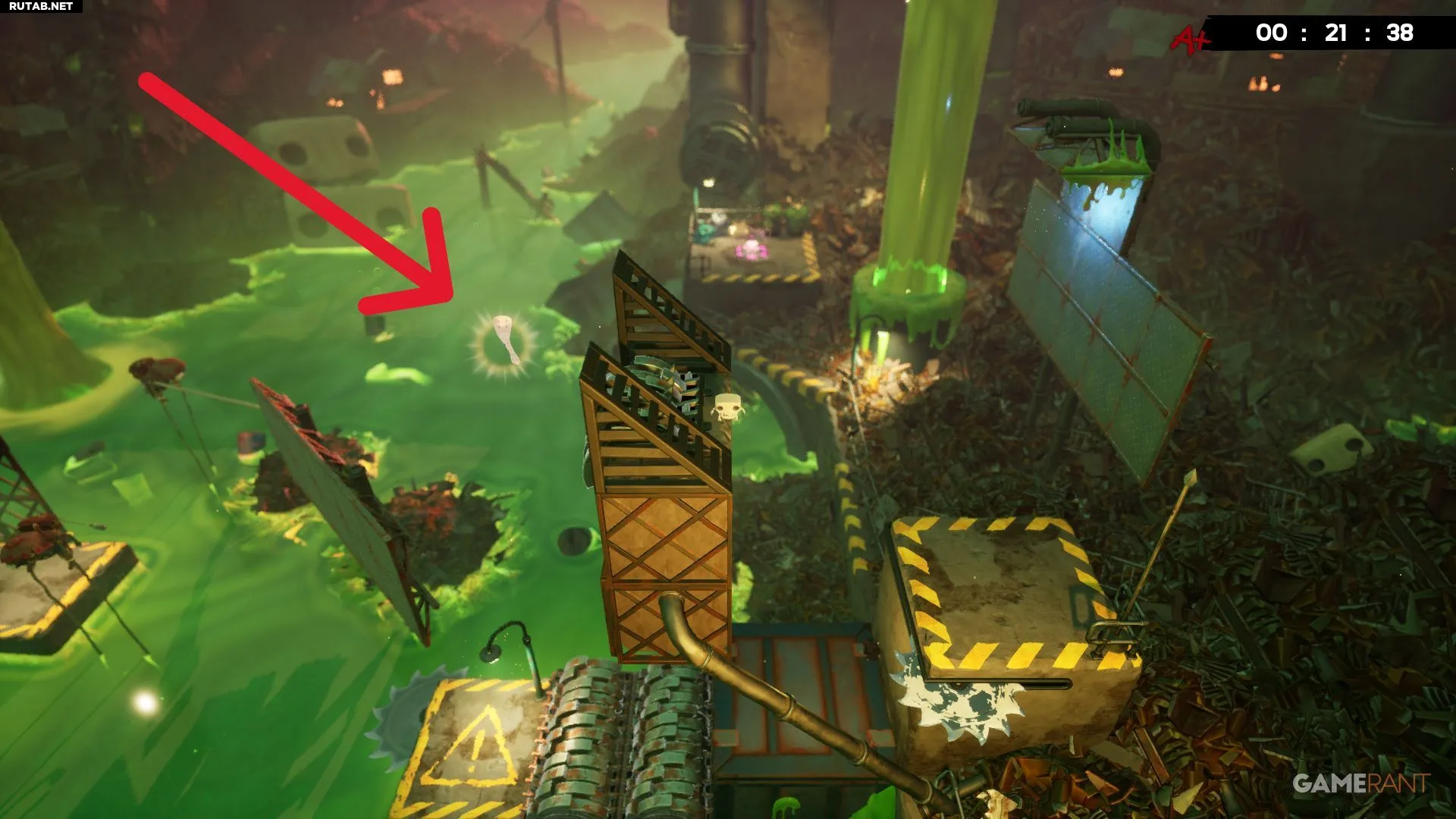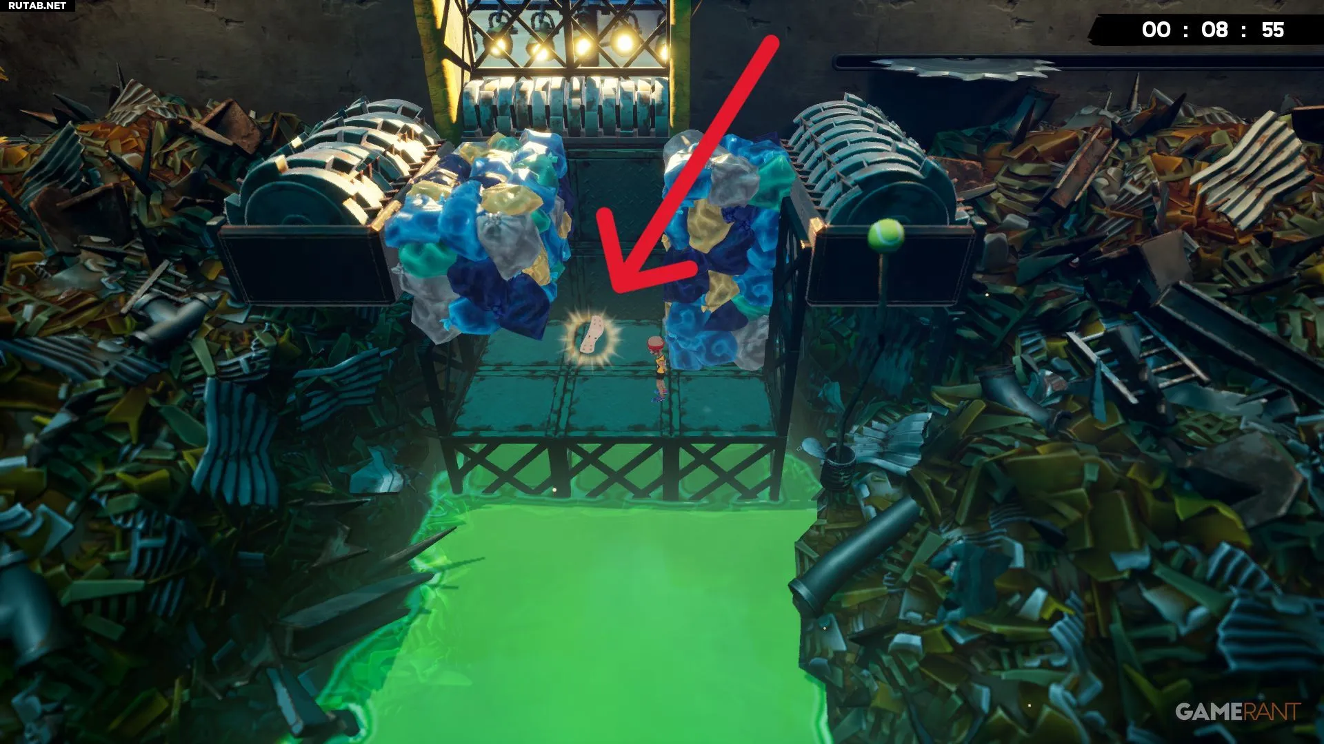 Примерно на середине уровня «Токсичные неприятности» вы будете прыгать между двумя платформами с собственными разъедающими кубами. Следующий прыжок довольно длинный, но бинт будет виден справа, прямо под измельчителем.