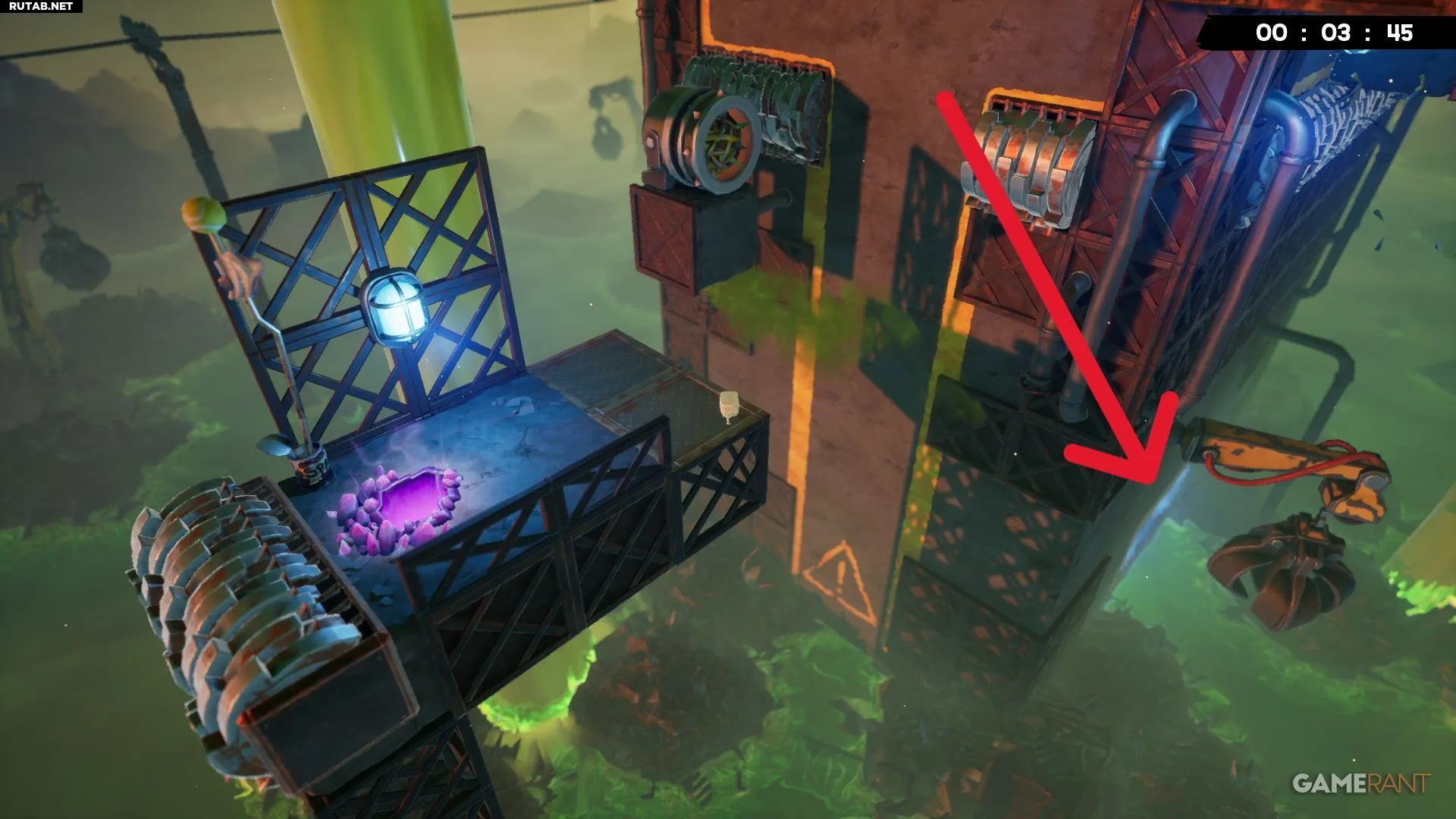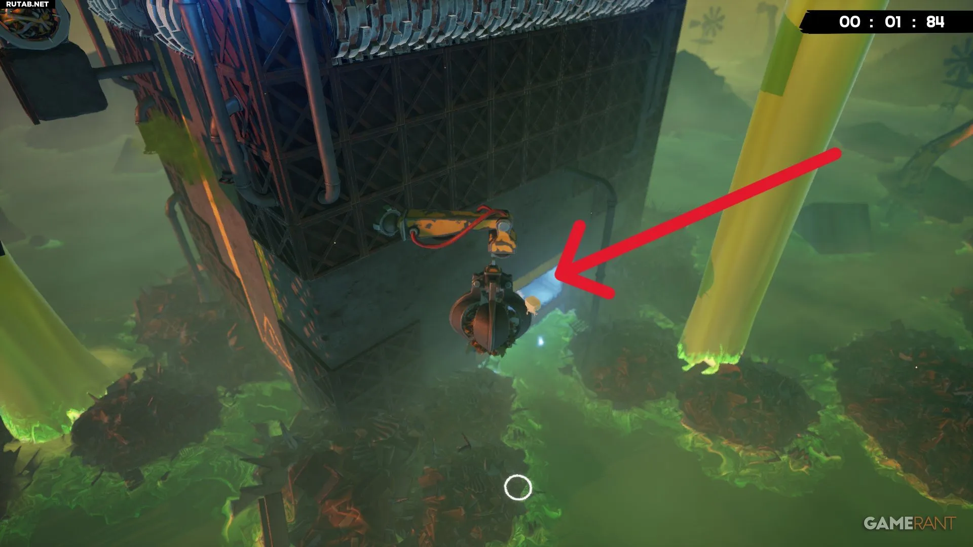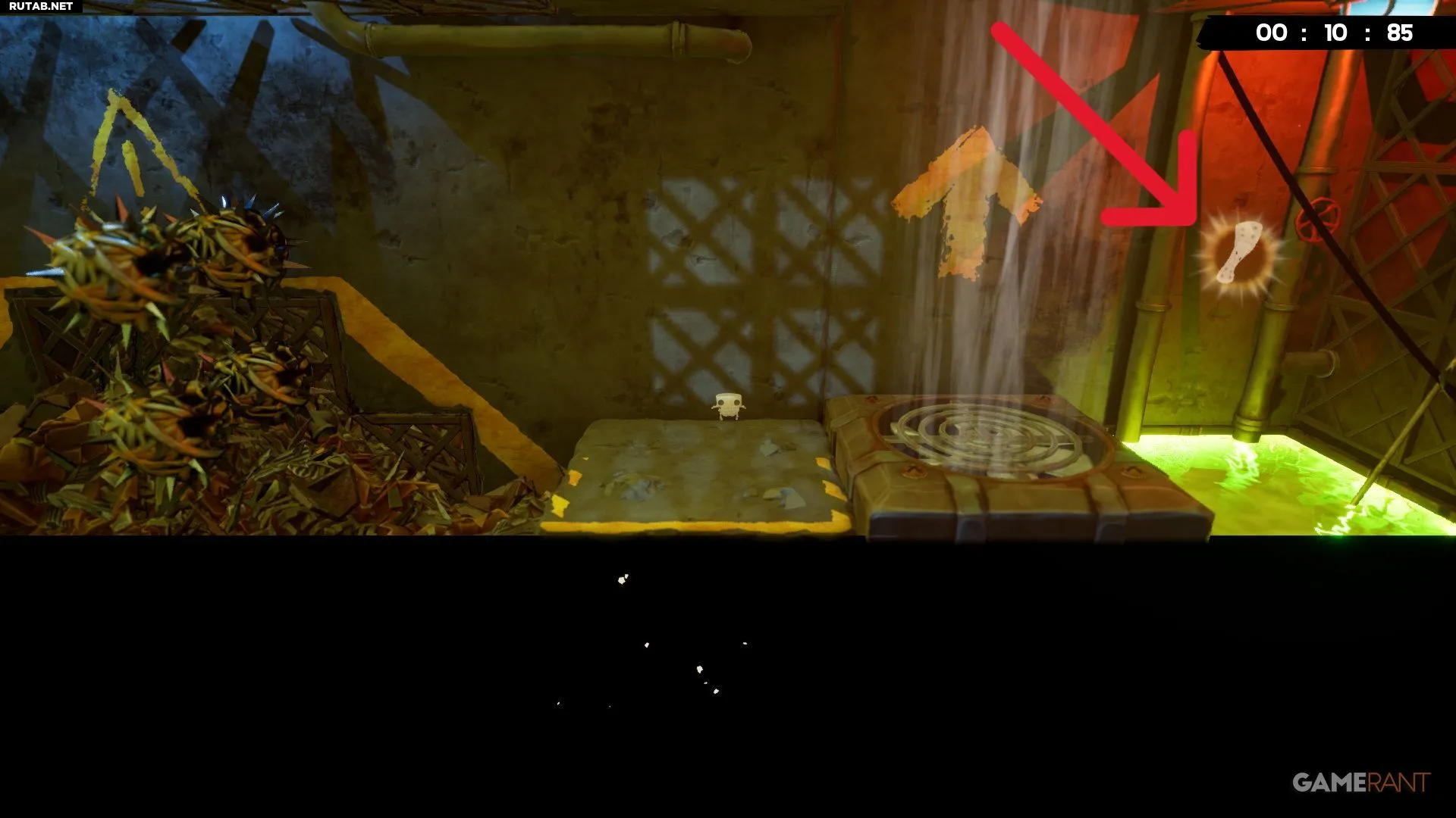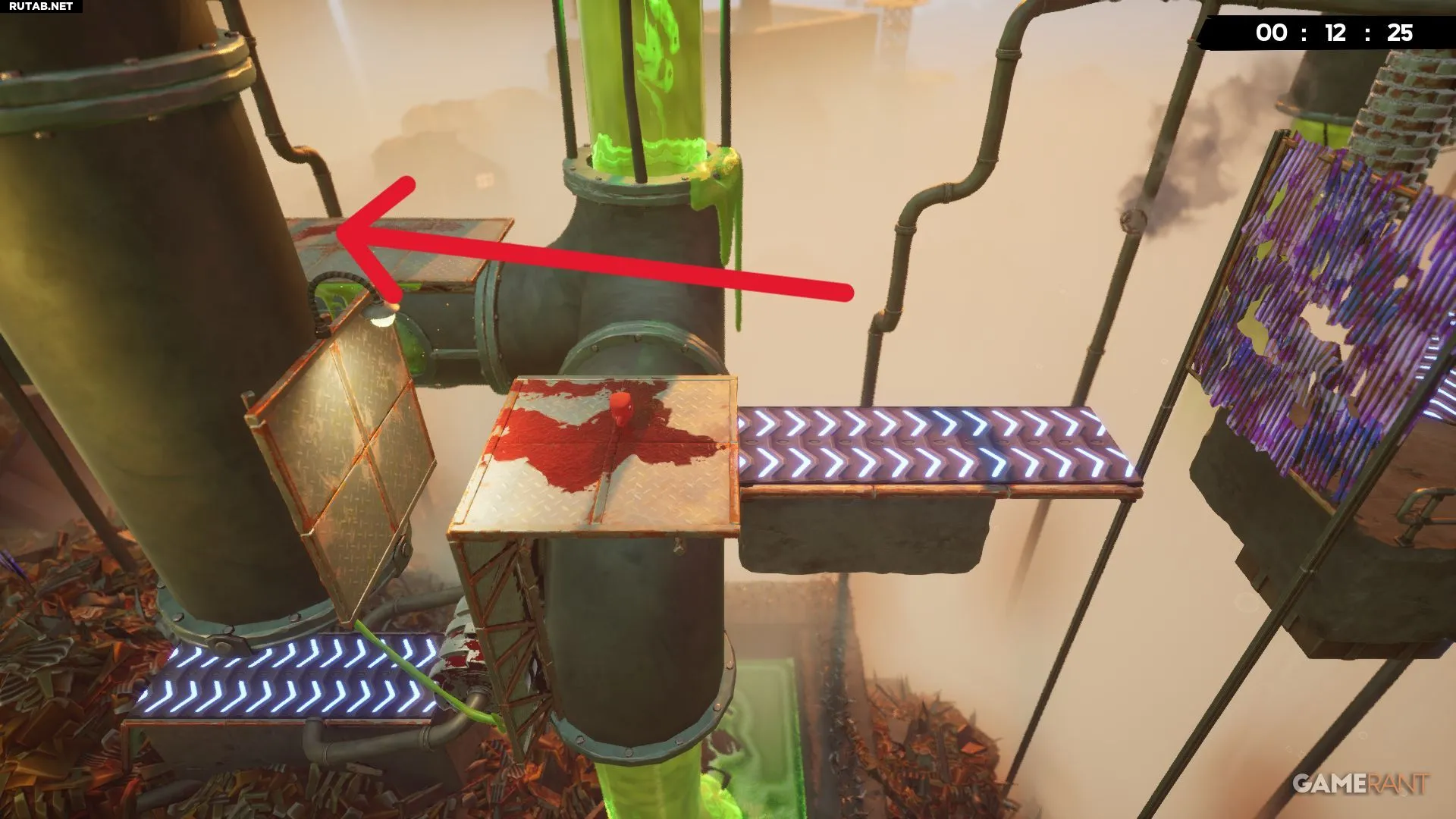 Примерно на середине уровня «Токсичные неприятности» вы будете прыгать между двумя платформами с собственными разъедающими кубами. Следующий прыжок довольно длинный, но бинт будет виден справа, прямо под измельчителем.
