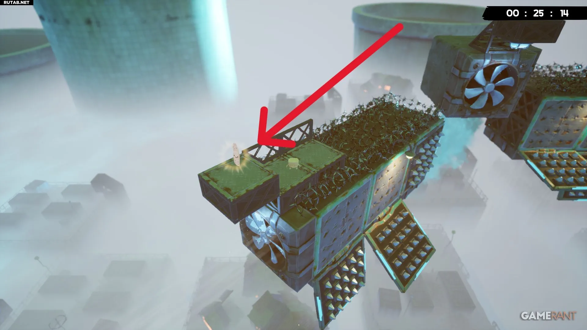 На финальном участке уровня «Попутный ветер» игроки используют ветер, чтобы подняться вверх, но прямо над ними находятся два измельчителя, что заставляет отскочить от стены слева. После приземления бинт будет прямо внизу, посередине большой металлической конструкции.