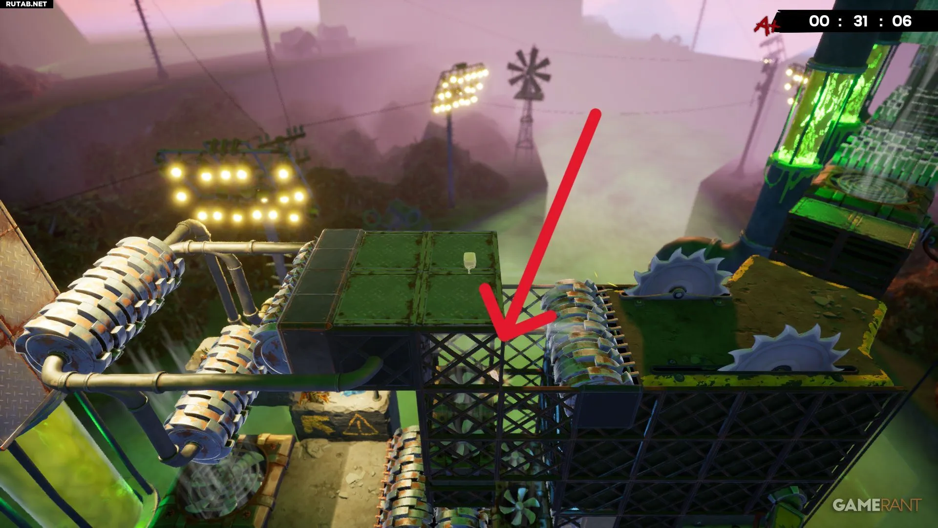 Дождитесь третьей платформы из исчезающего мусора примерно на середине уровня «Слизневый вентилятор». Под ней находится металлическая платформа с бинтом, а также несколько измельчителей, которых нужно избегать.