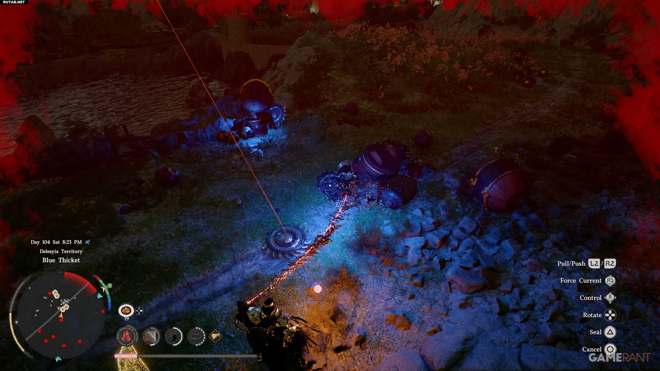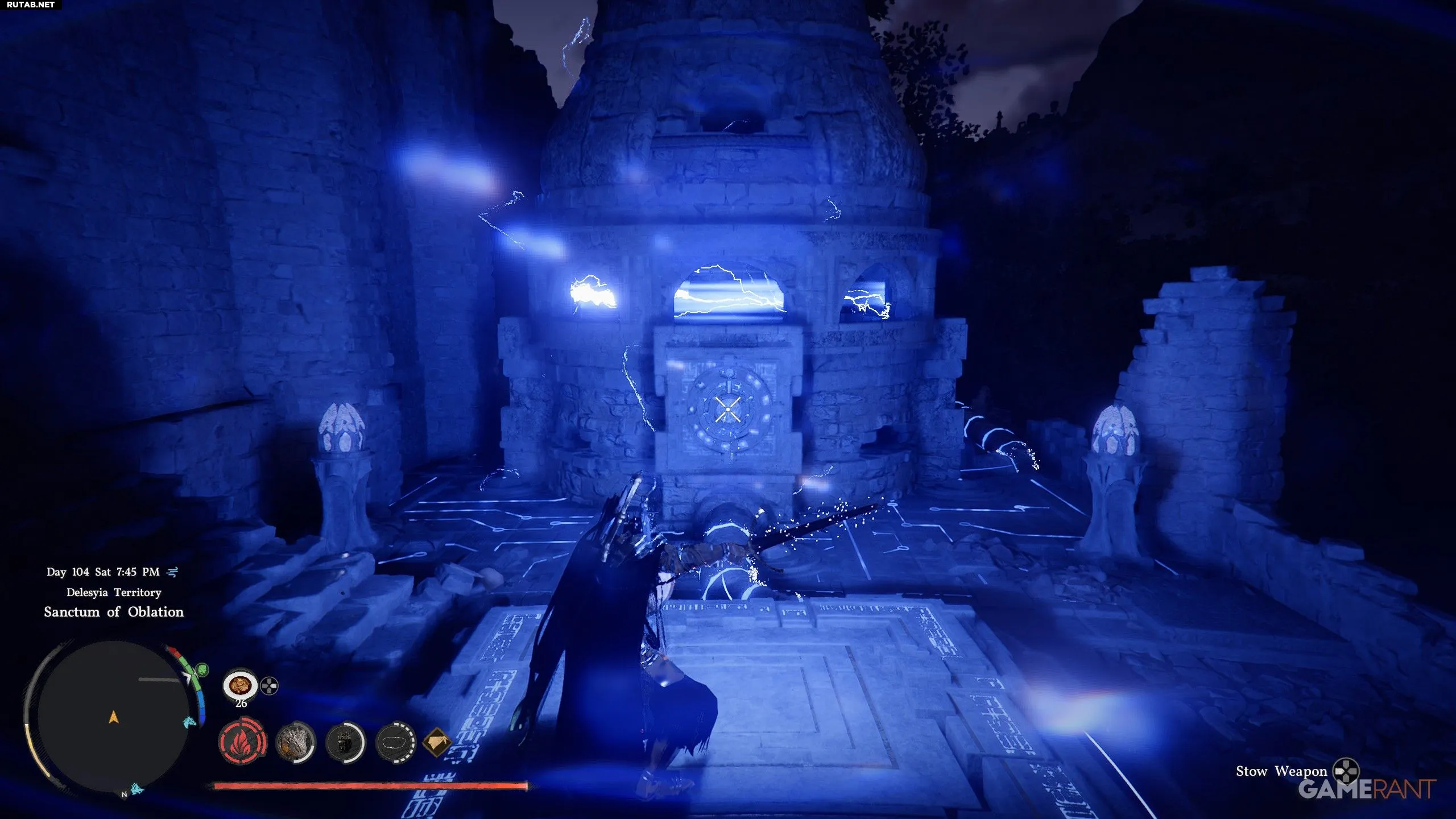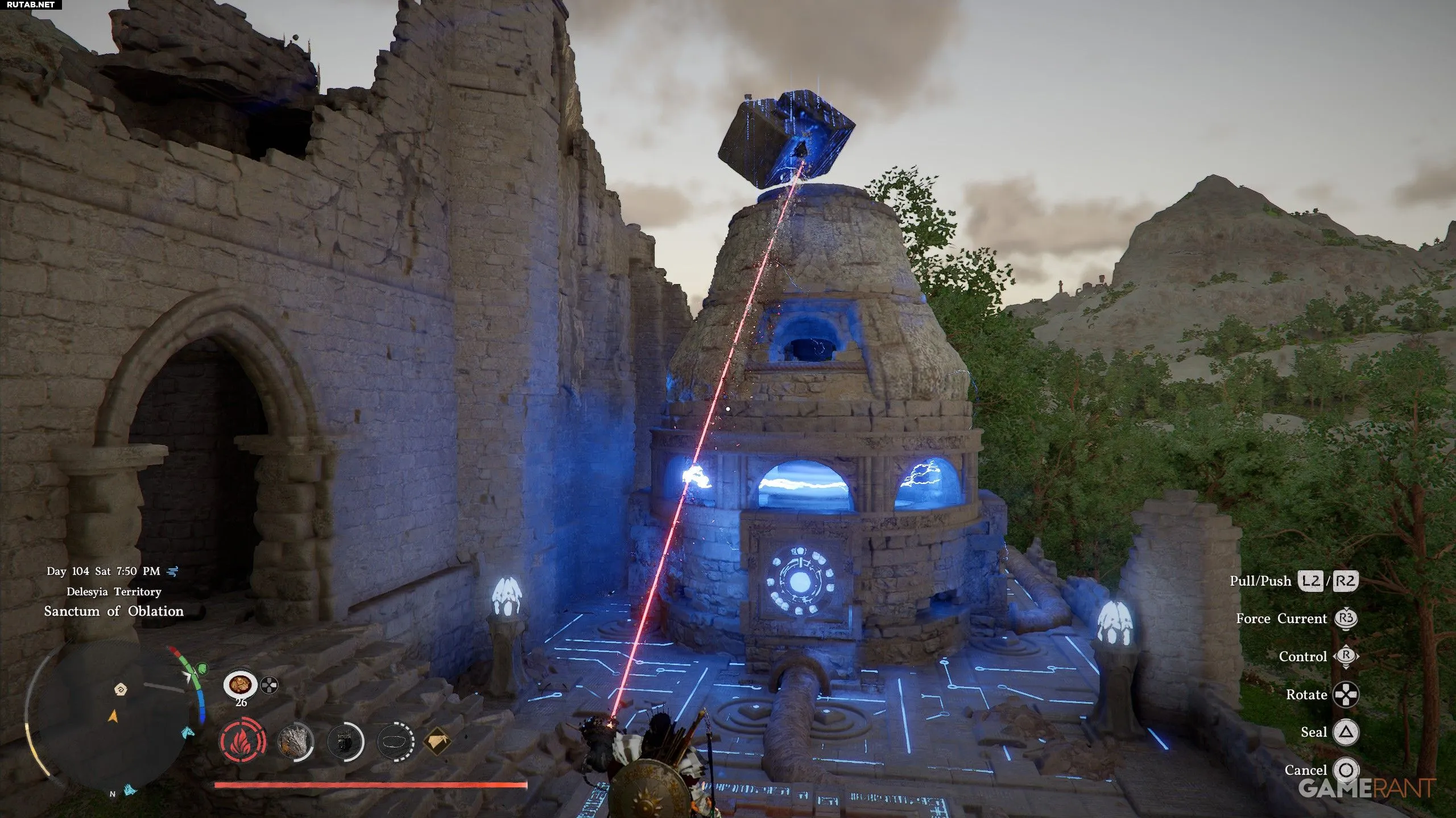- Внутри святилища используйте Ослепляющую вспышку (L1+R1+L1) на центральном синем кристалле и нажимайте L1 каждый раз, когда стрелка на циферблате приближается к синему кристаллу.