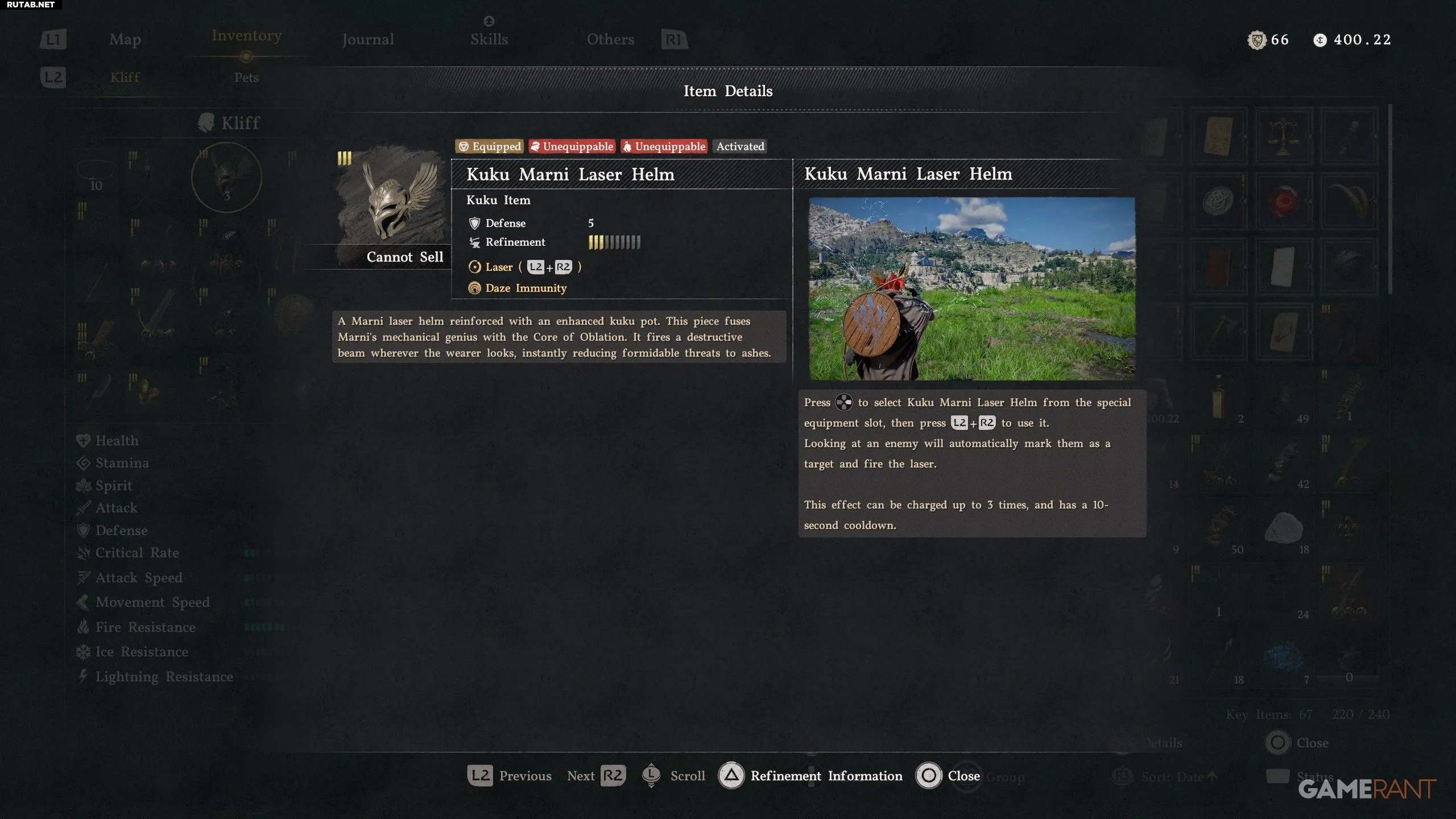 Когда все необходимые предметы будут у вас в инвентаре, вернитесь к Гримниру в мастерской Килнден в Хернанде, где вы сможете создать шлем «Куку Лазер Марни». Эта улучшенная версия значительно лучше: её можно оттачивать для повышения защиты, а также она позволяет делать три лазерных выстрела вместо одного.