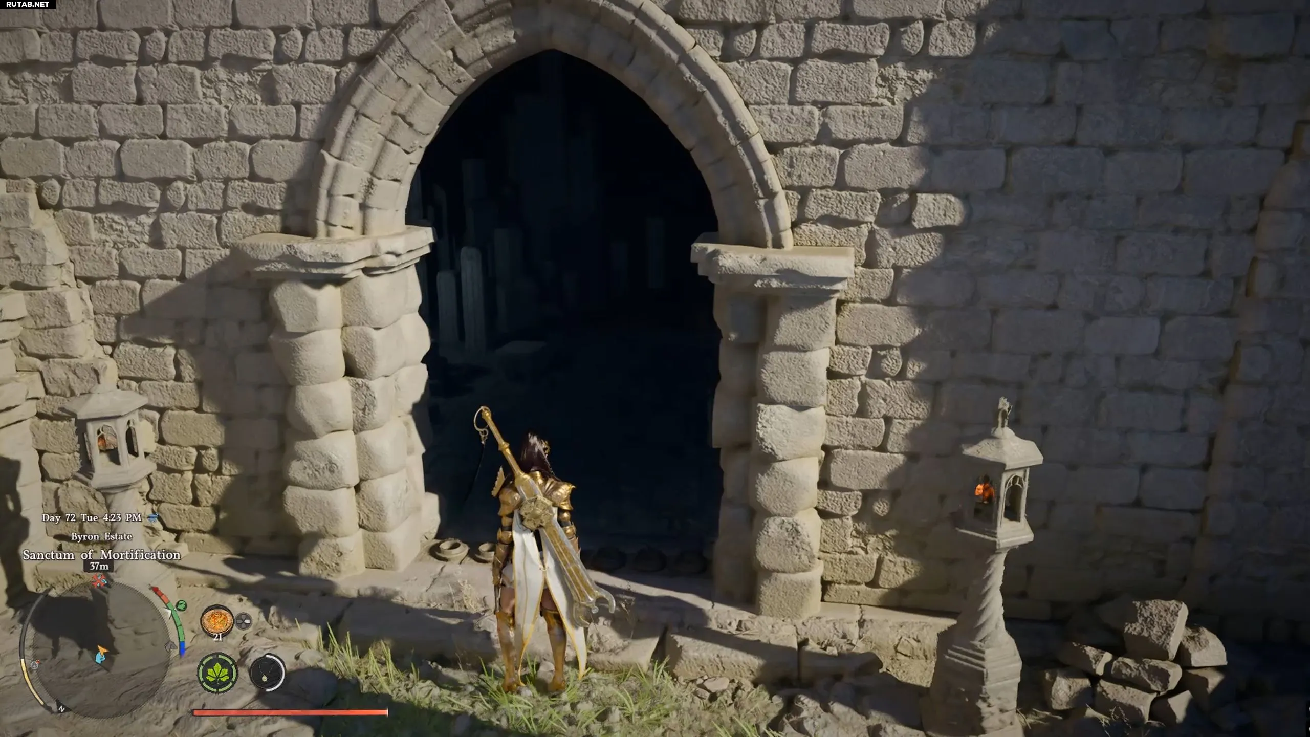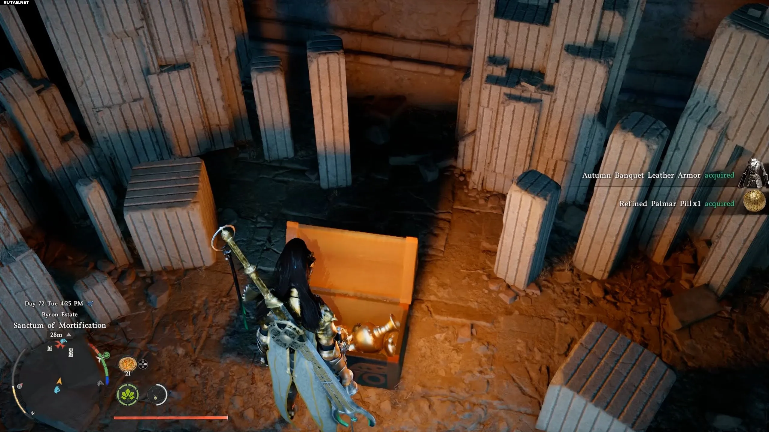 Последняя часть комплекта «Осенний пир» находится в Святилище Мучения. Оказавшись рядом с генератором, повернитесь на север и обойдите здание, чтобы найти закрытые ворота. Зажгите два фонаря по обе стороны от них, чтобы открыть проход. Войдите внутрь и откройте сундук с Кожаным доспехом «Осенний пир».