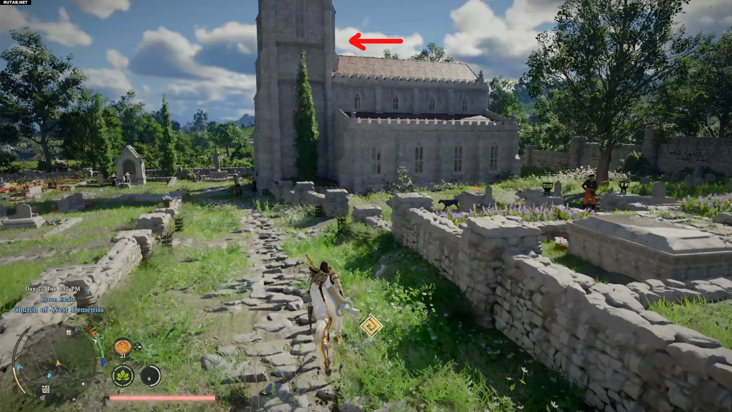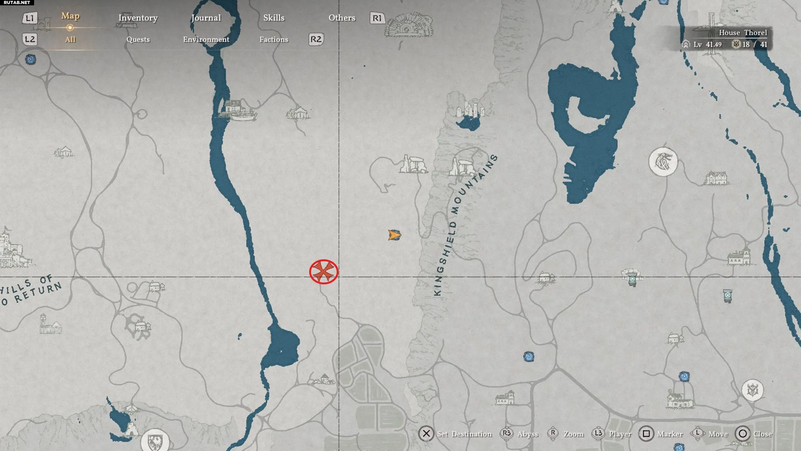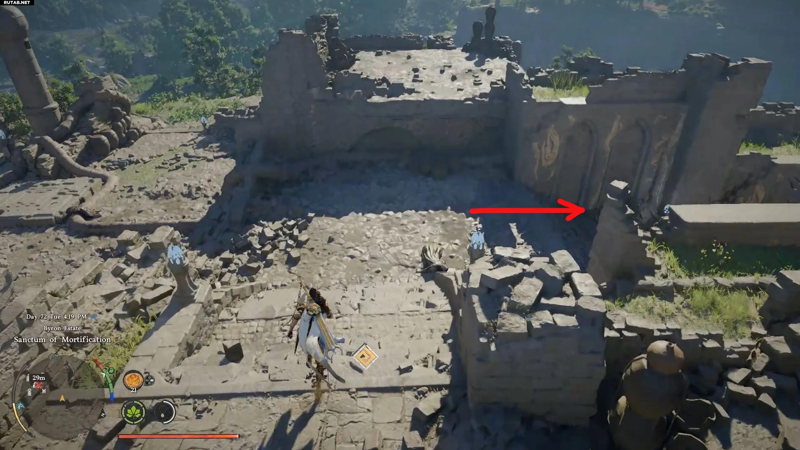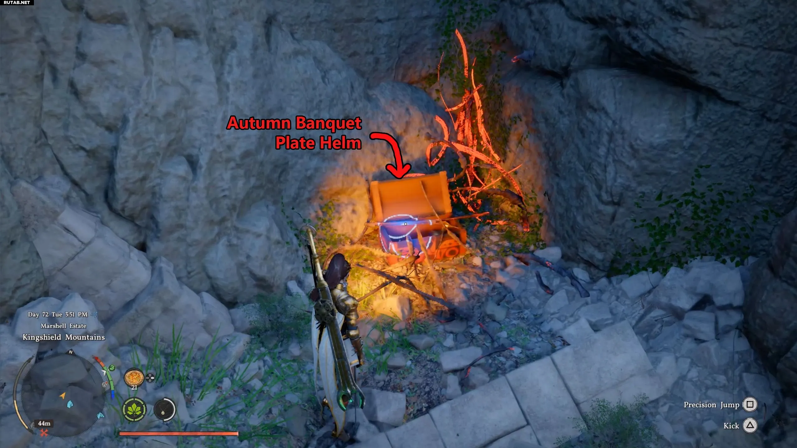 К западу от Королевских Щитовых гор есть грунтовая дорога, ведущая на север. Достигнув конца, вы найдете яму, заполненную обломками колонн и деревьями. Подойдите к жилам и используйте огненную стрелу или навык «Ослепляющая вспышка», чтобы сжечь их. Откройте сундук, чтобы получить Пластинчатый шлем «Осенний пир».