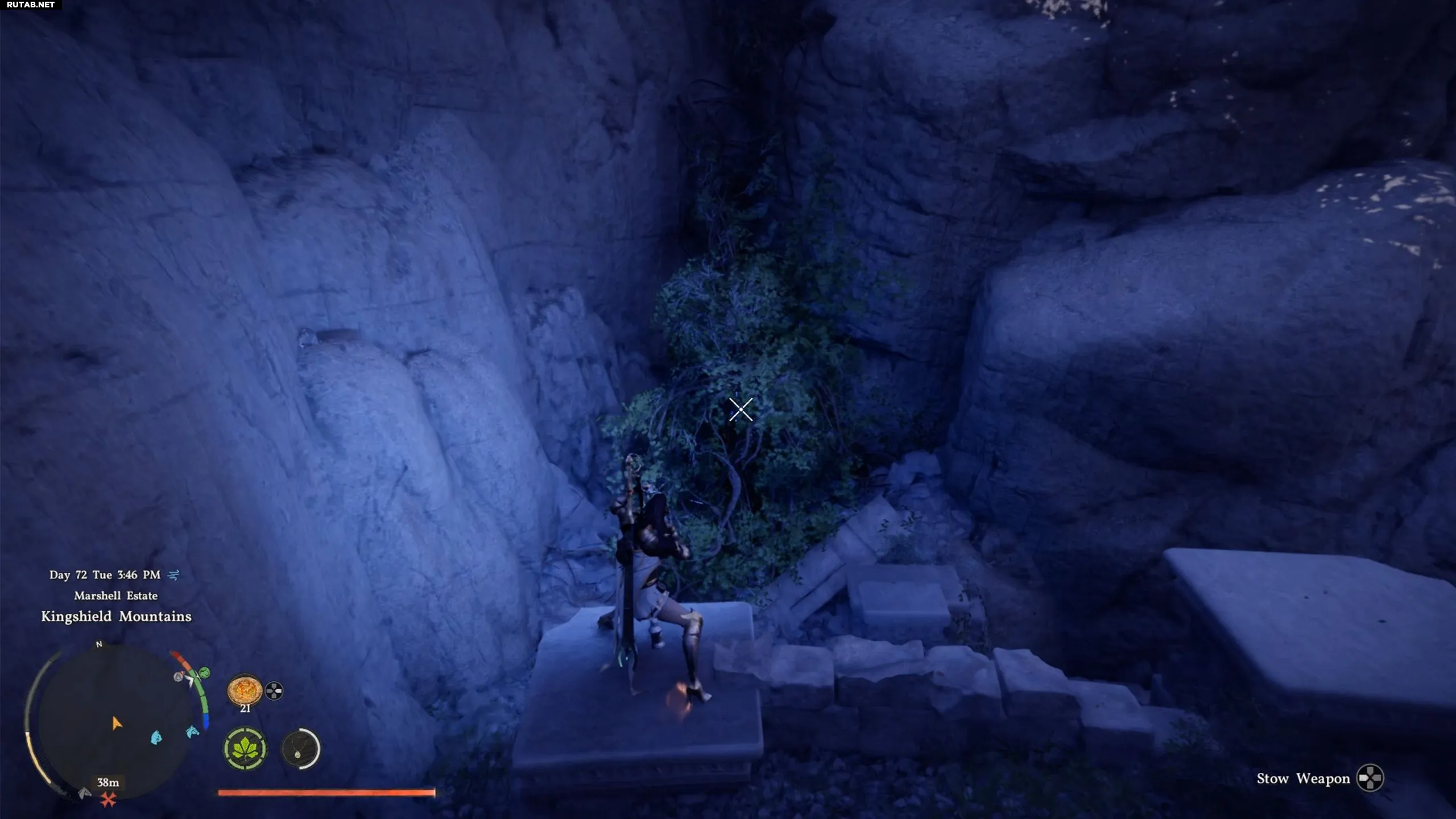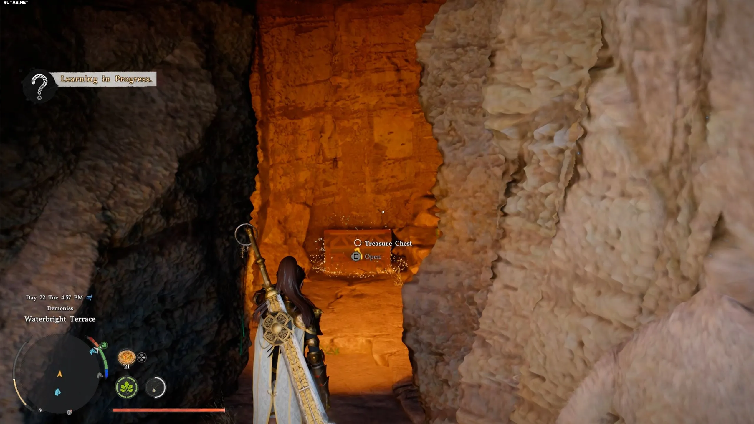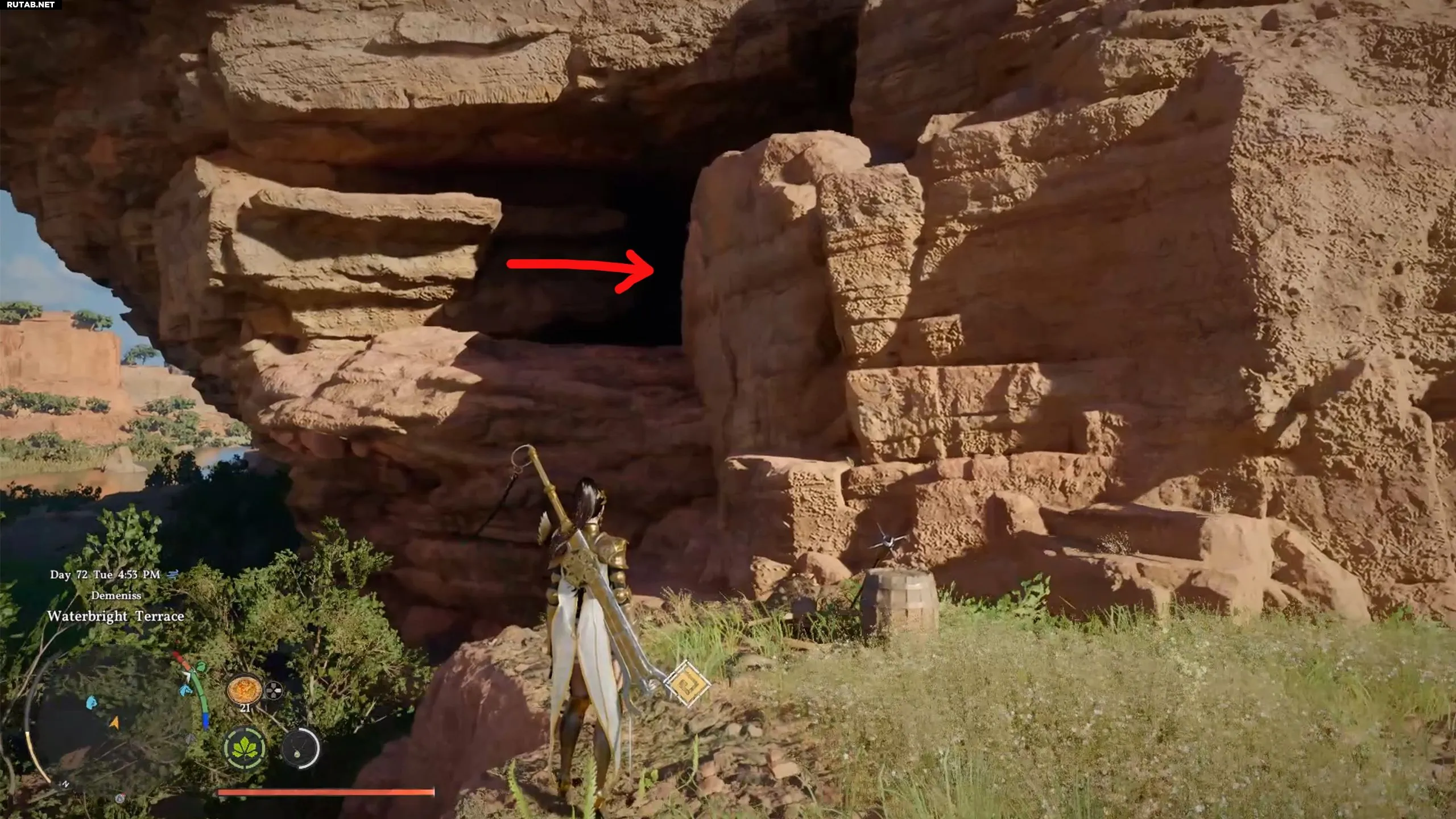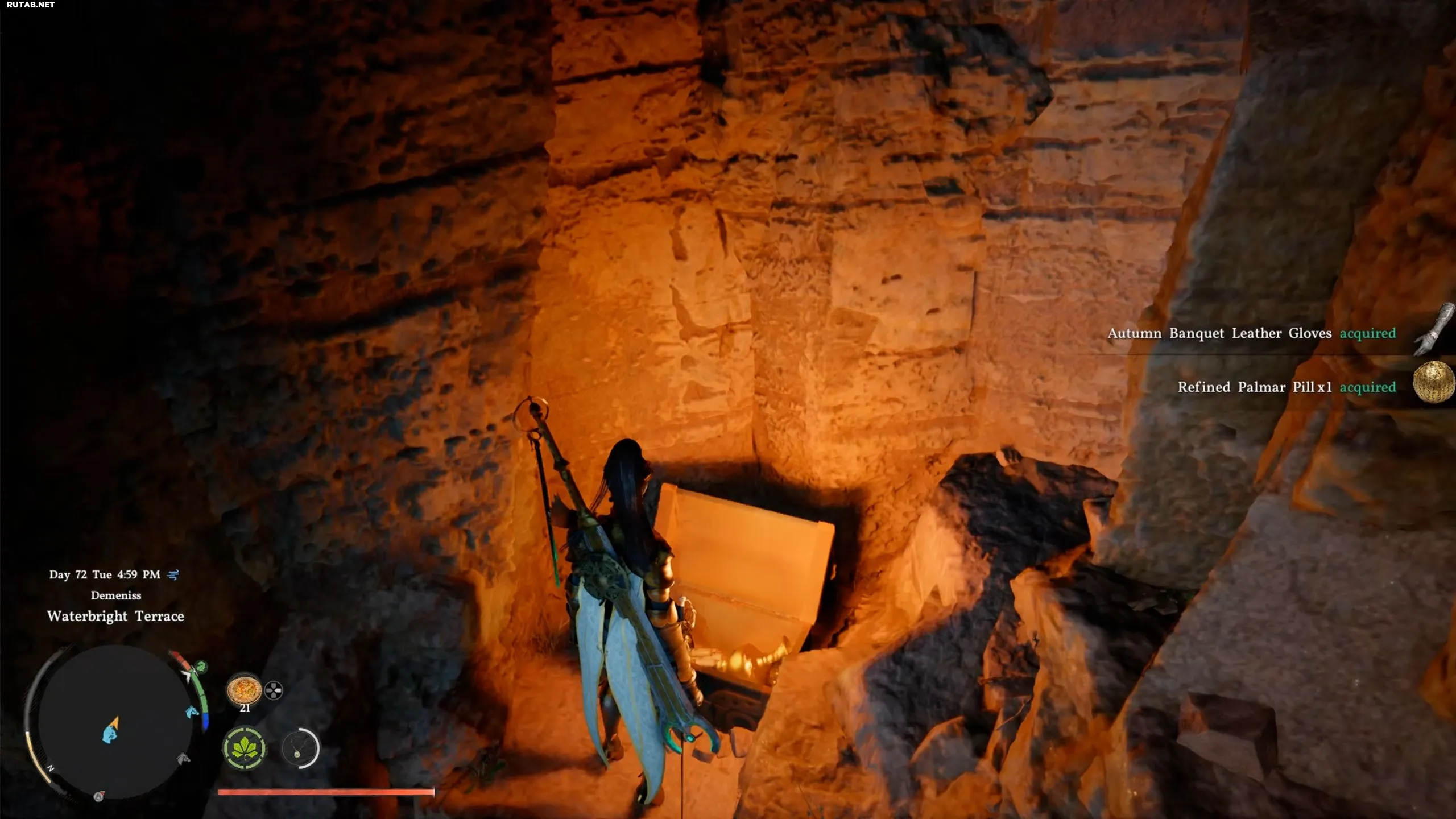 Идите на север от Холма Ветров, что к северо-востоку от Золотых равнин, и подойдите к реке. На одном из нижних холмов повернитесь на юго-восток, чтобы увидеть небольшую щель между скалами. Пригнитесь и пролезьте под скалами, чтобы найти потайной сундук с Кожаными перчатками «Осенний пир».