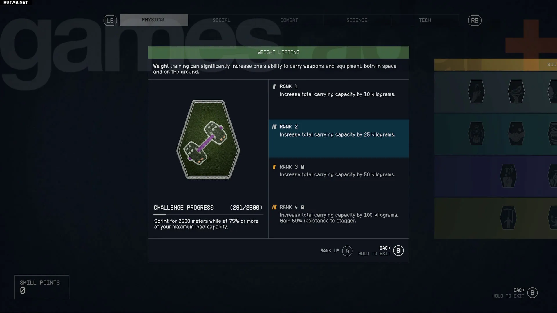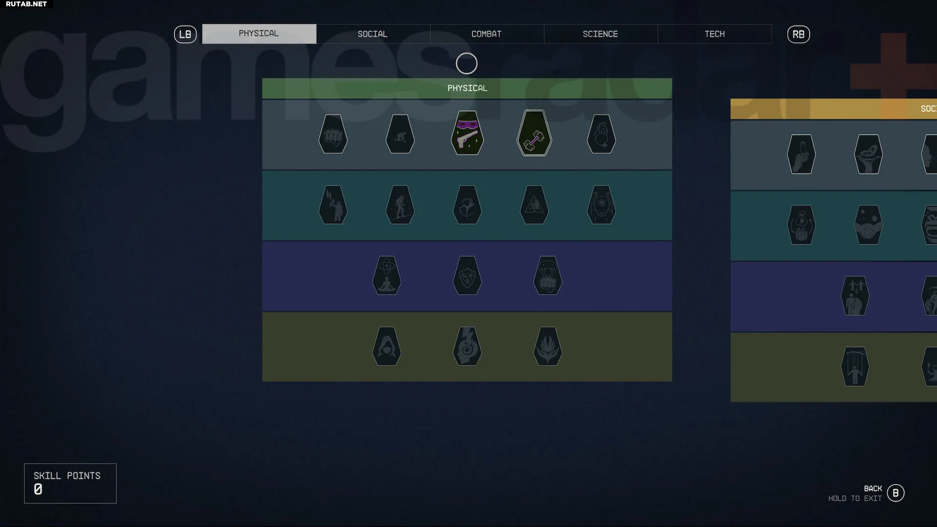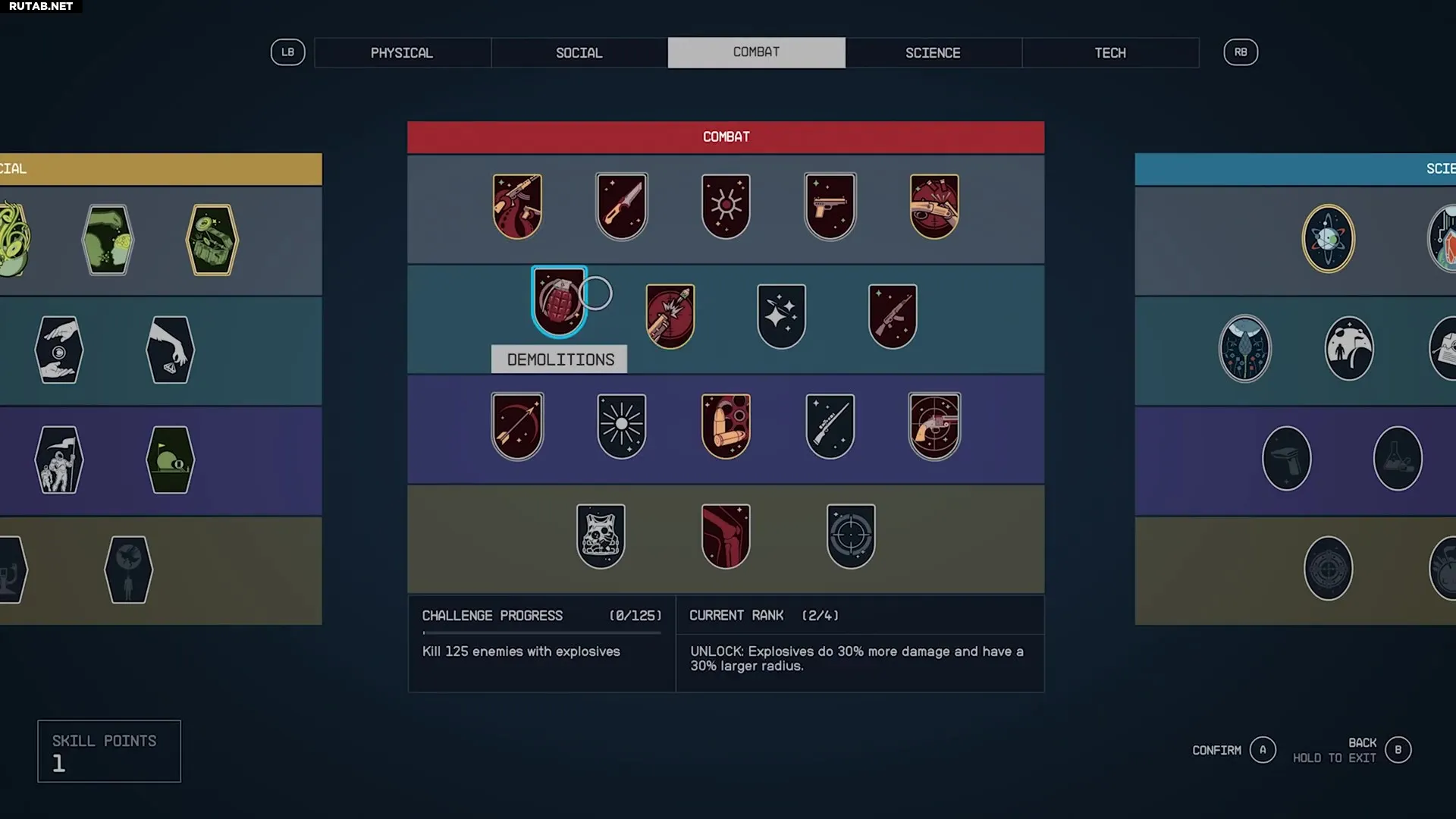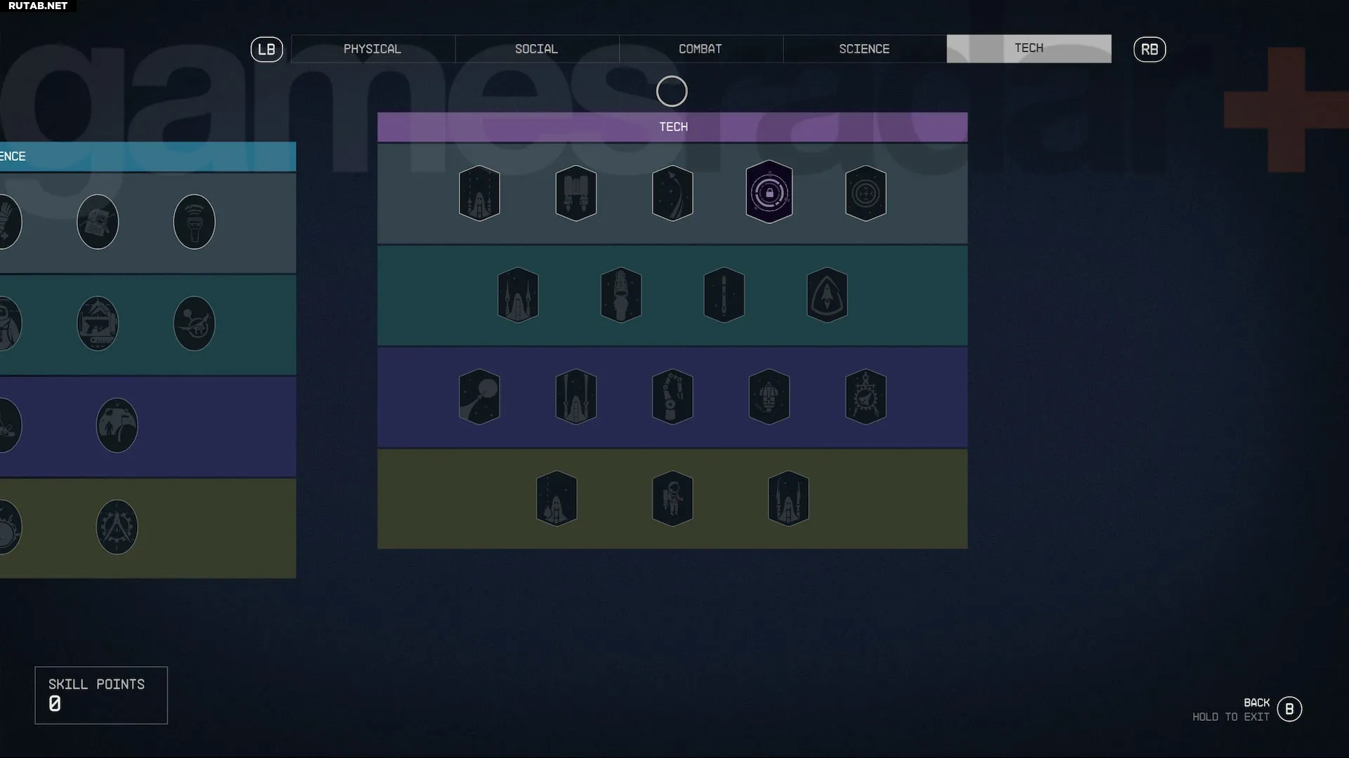 Каждая категория навыков в Starfield разделена на четыре уровня. Все навыки 1-го уровня доступны по умолчанию, но последующие уровни в каждой категории открываются путем траты 4, 8 и 12 очков навыков соответственно в этой же категории. Каждый отдельный навык также имеет четыре ранга: первый открывается автоматически при разблокировке умения, а следующие три зарабатываются выполнением определенных испытаний — об этом подробнее позже.