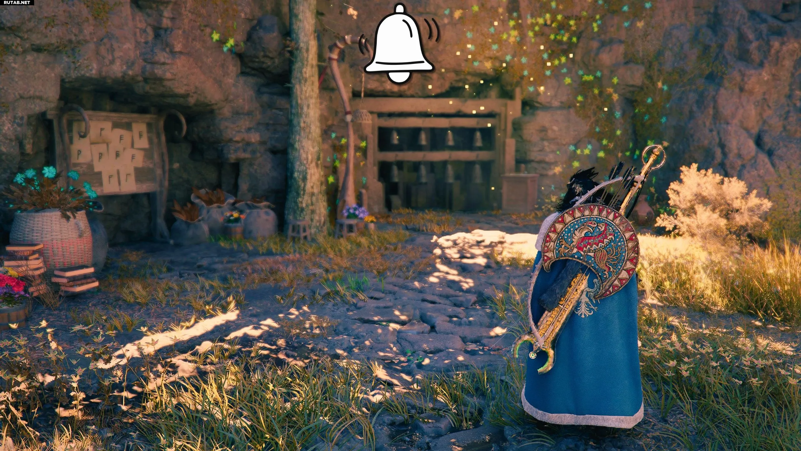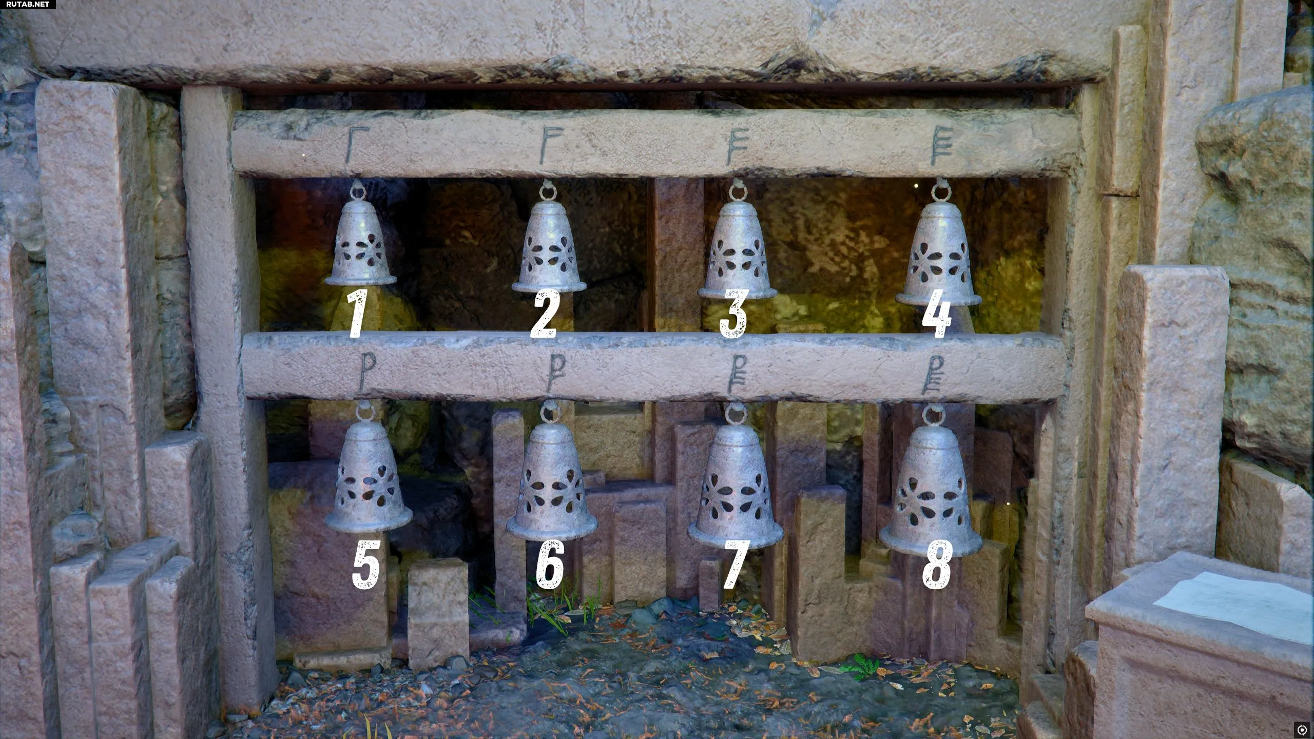 Возьмите молоток с бочки рядом со стойкой. Нацельтесь на нужный колокол (LB/L1/CTRL) и ударьте. Если возникнут сложности, можно попробовать звонить в колокола, стреляя в них из лука.