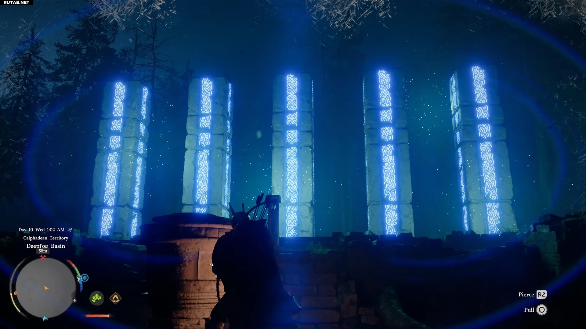 Каждое отверстие на малом пьедестале управляет разным набором больших столбов. Перед началом рекомендуется создать сохранение. Чтобы взаимодействовать с отверстиями, используйте специальный удар копьём (R1 + Triangle на PlayStation или R1 + Y на Xbox), обычный удар мечом не сработает.