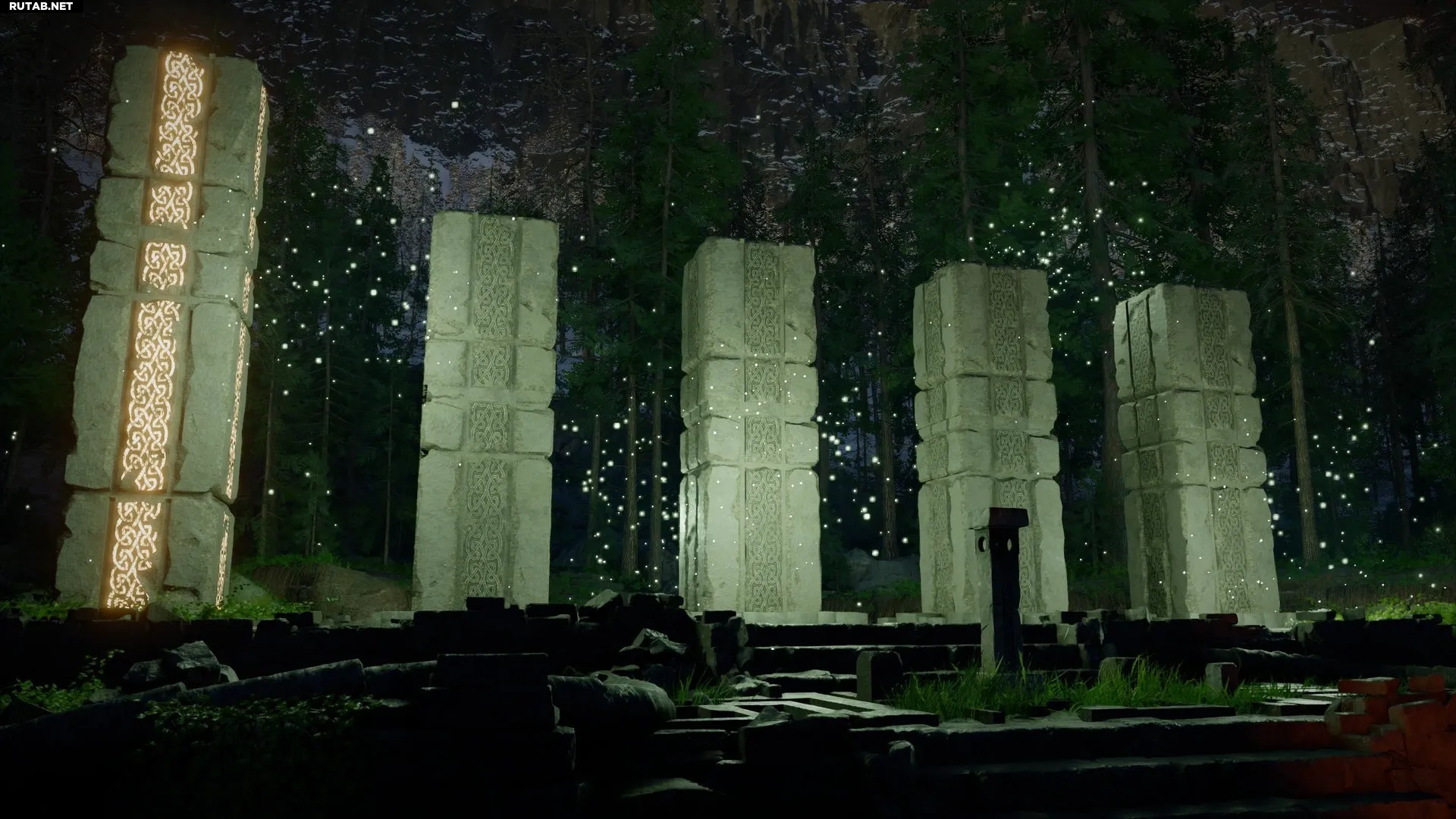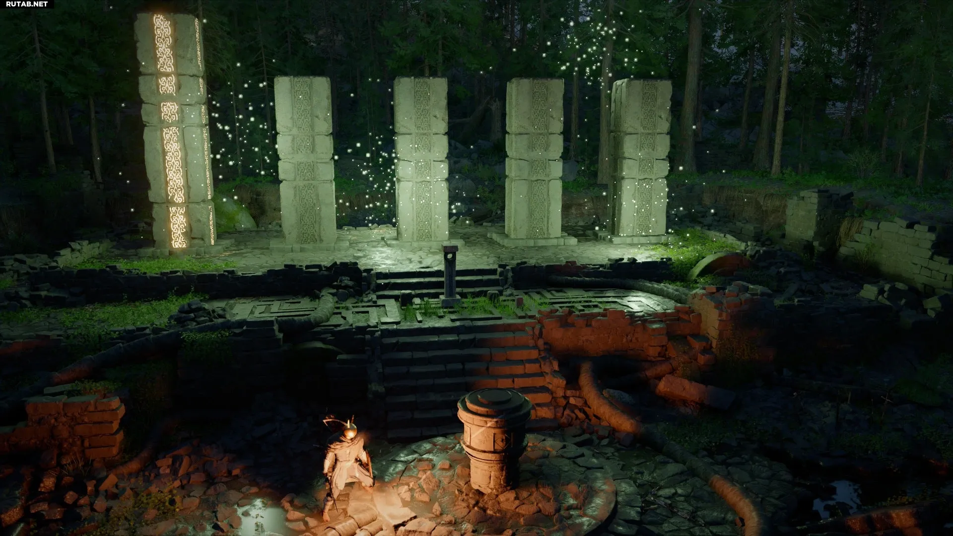 Подойдя к руинам, вы увидите один небольшой круглый пьедестал с четырьмя отверстиями и пять высоких столбов, крайний левый из которых светится жёлтым. Цель — использовать малый пьедестал, чтобы поднять и выровнять все пять больших столбов.