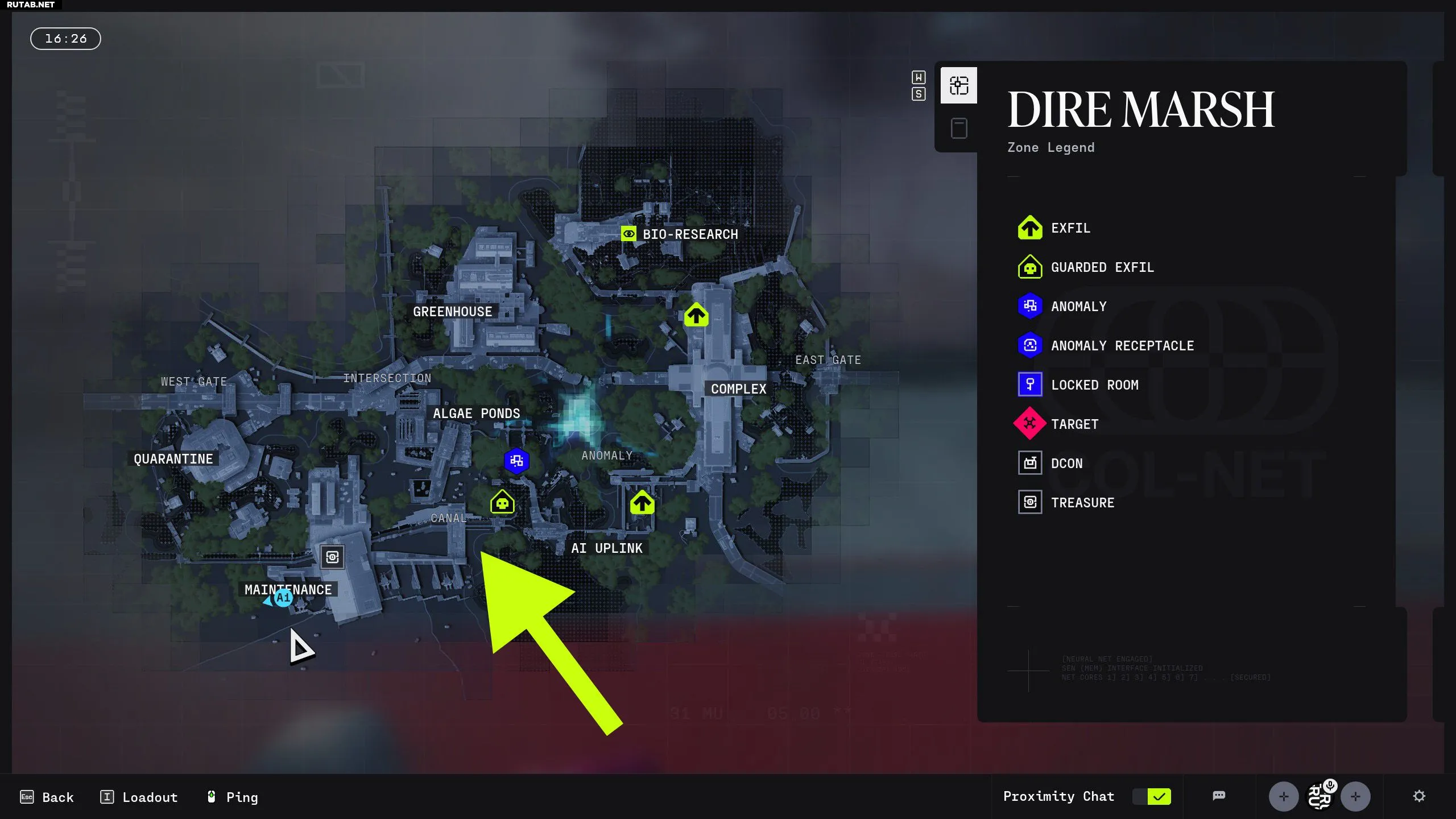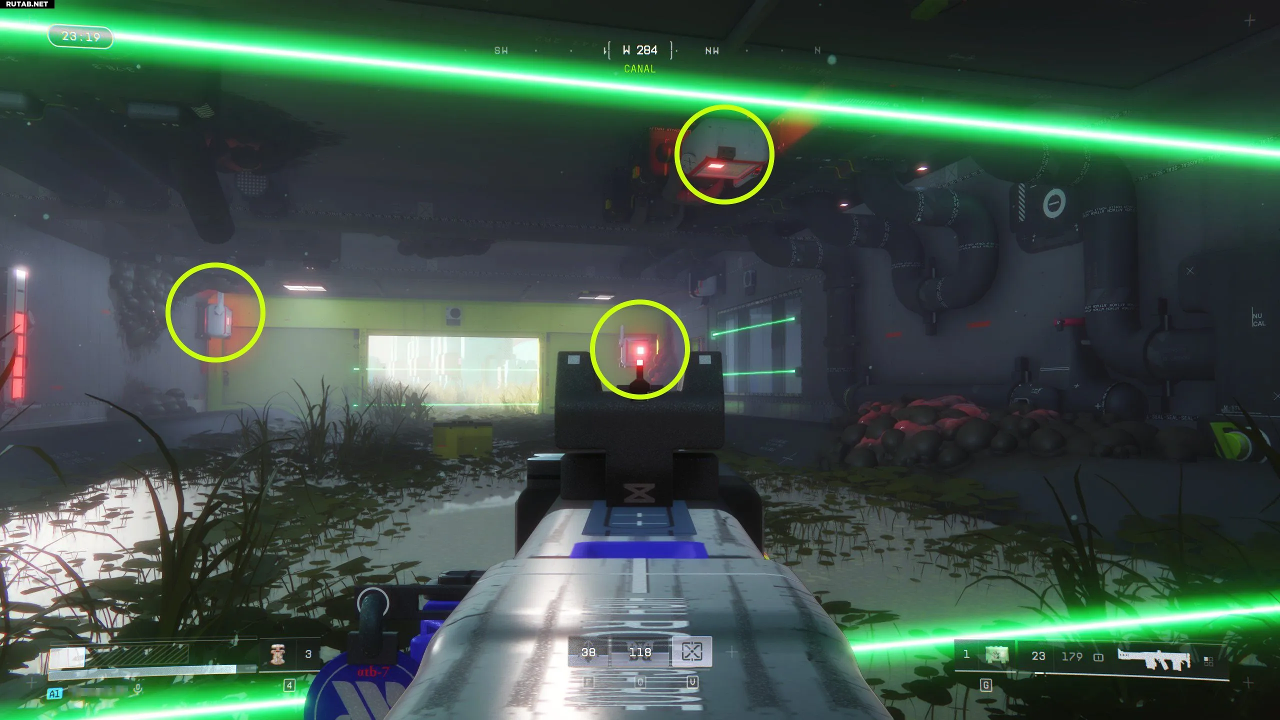 На карте «Гибельные топи» направляйтесь в район Канала к востоку от Техобслуживания и к югу от Водорослевых прудов. Вы увидите тоннель с желтой окраской и зелеными лазерами безопасности по бокам. Подойдите к лазерам, но не проходите сквозь них.