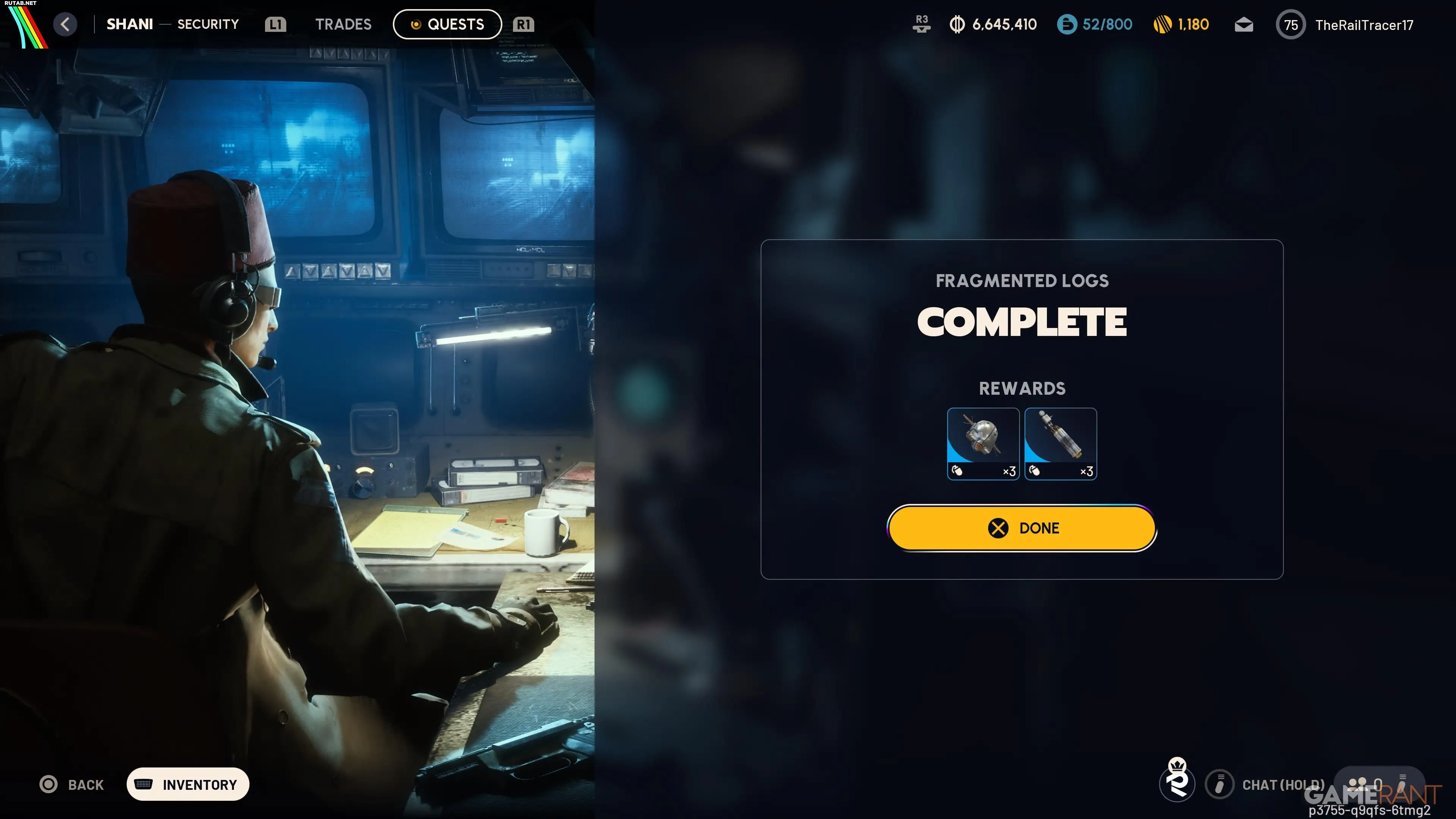 После эвакуации через лифт и возвращения в Эсперансу перейдите во вкладку «Торговцы» и поговорите с Шани, чтобы сдать квест и получить награды: