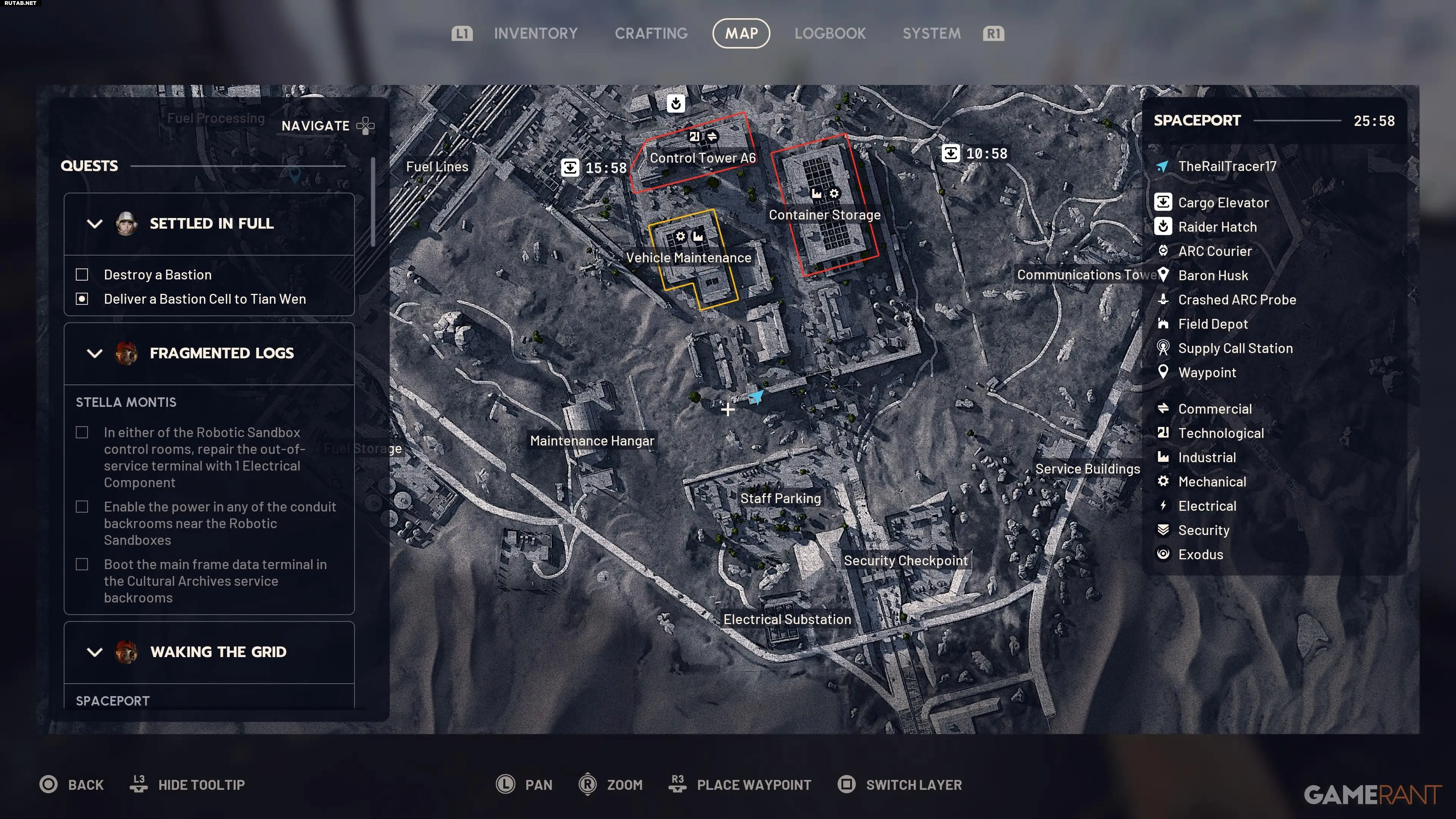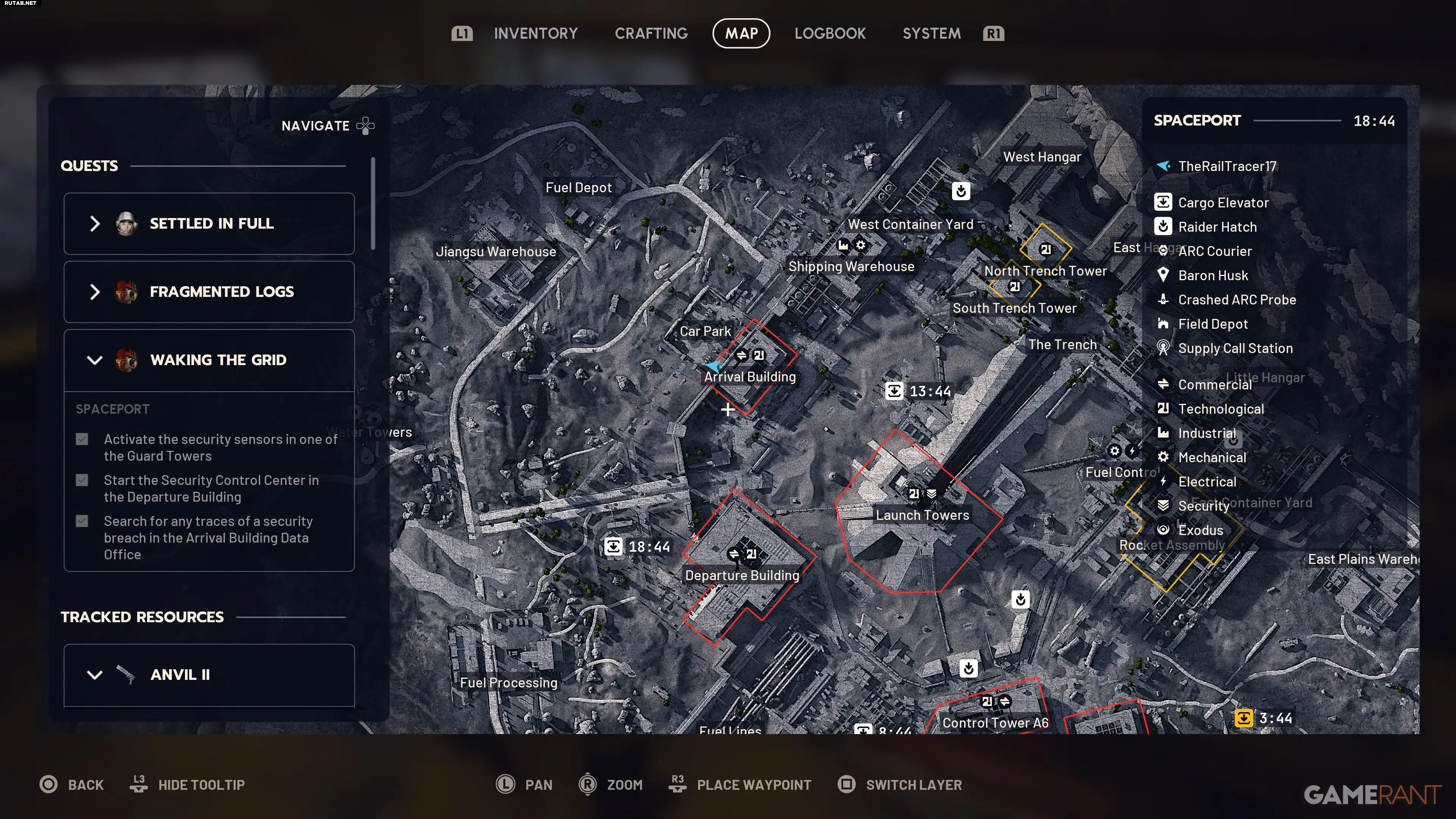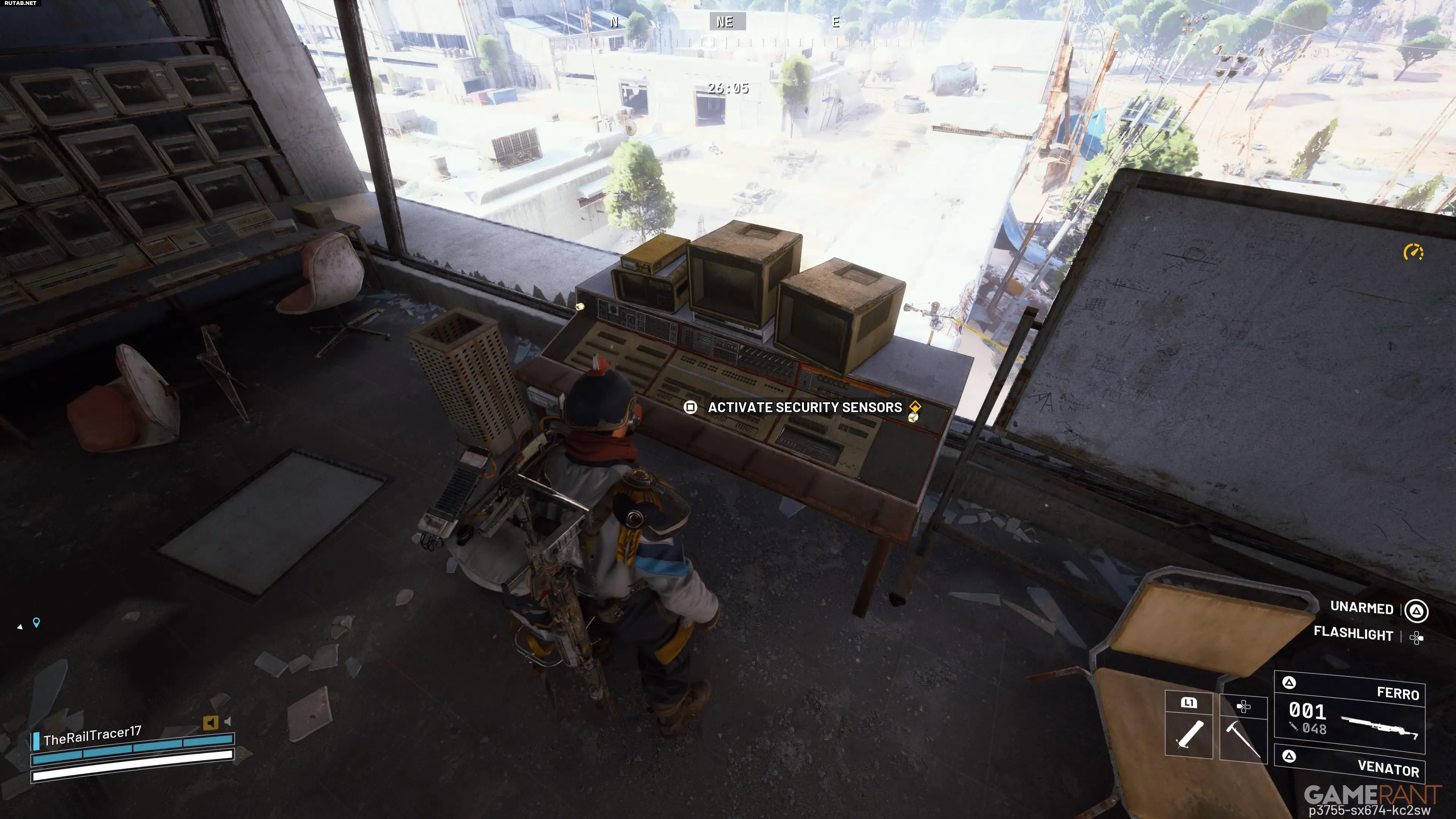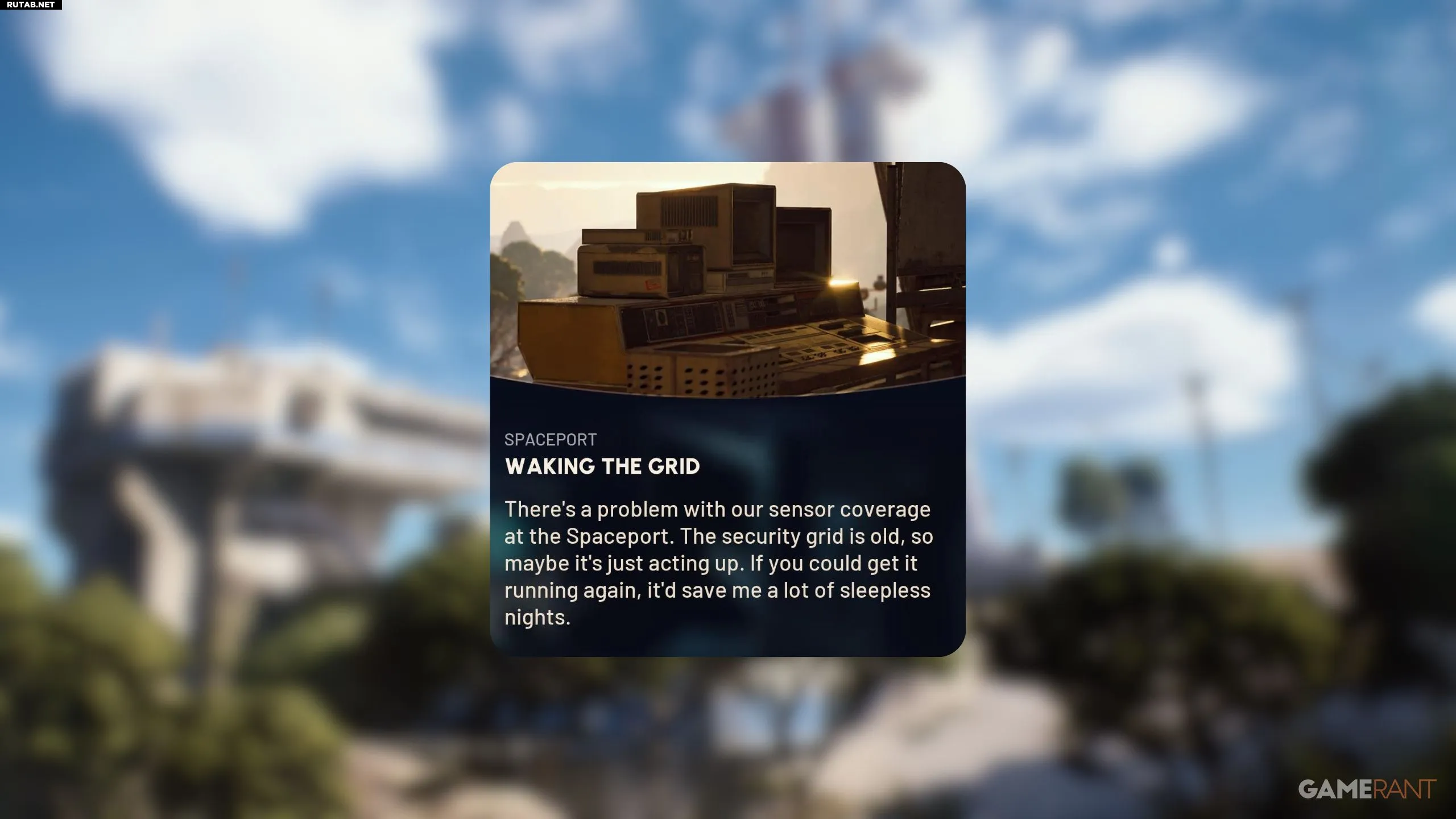Первая часть задания — активация охранных сенсоров. Это можно сделать на любой из сторожевых башен по периметру Космопорта. Поскольку следующая цель находится в Здании вылета, логично отправиться туда и найти ближайшую башню. Поднявшись по тросу, взаимодействуйте с компьютером для активации сенсоров.