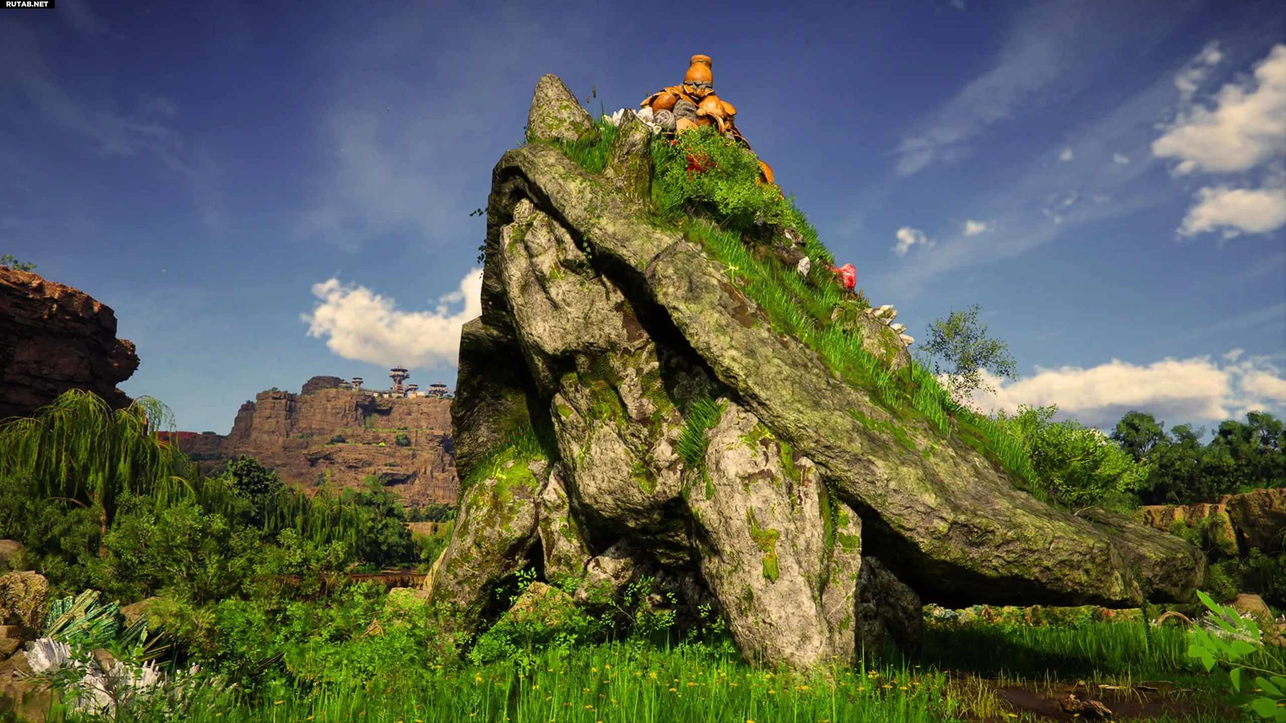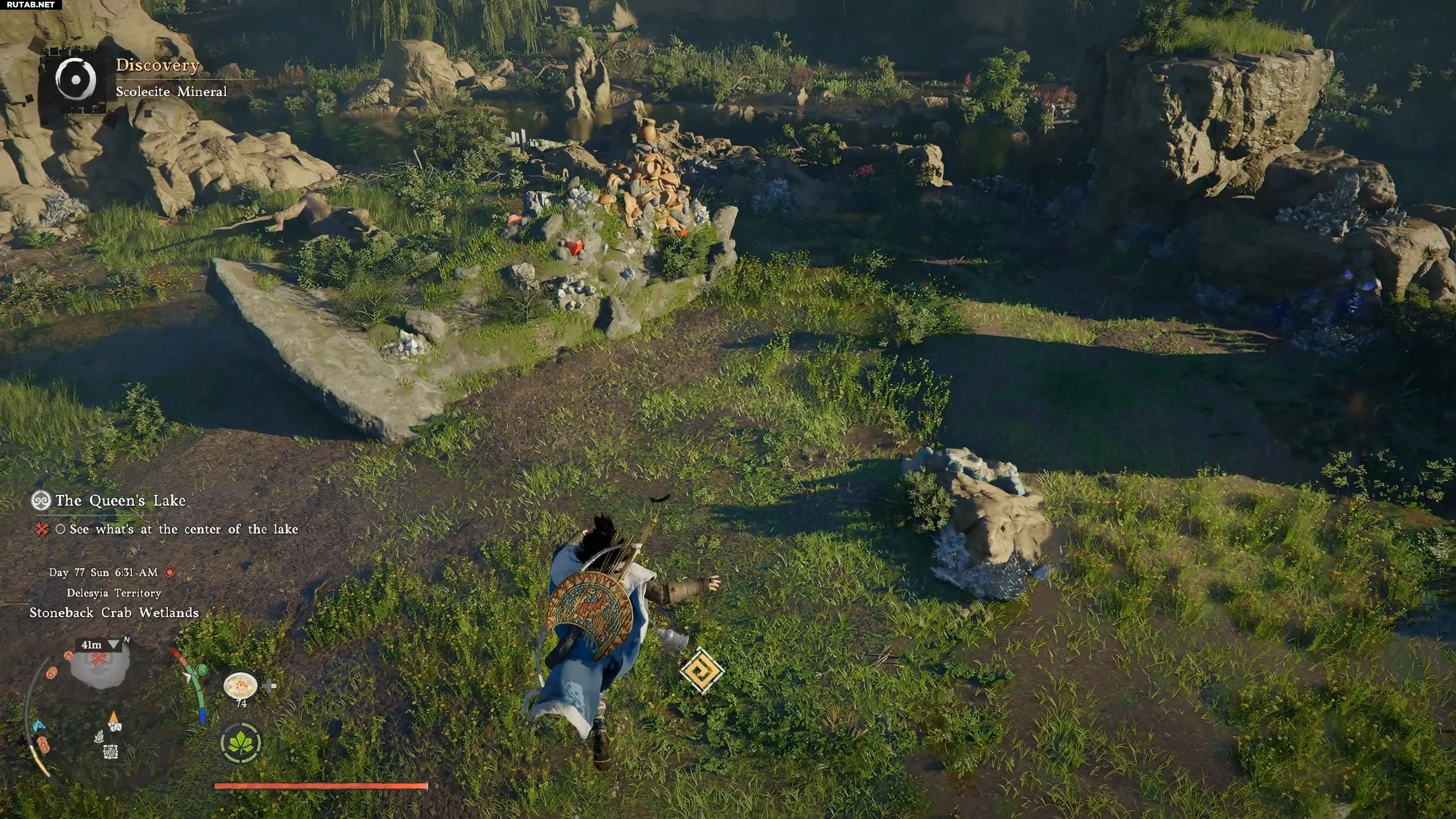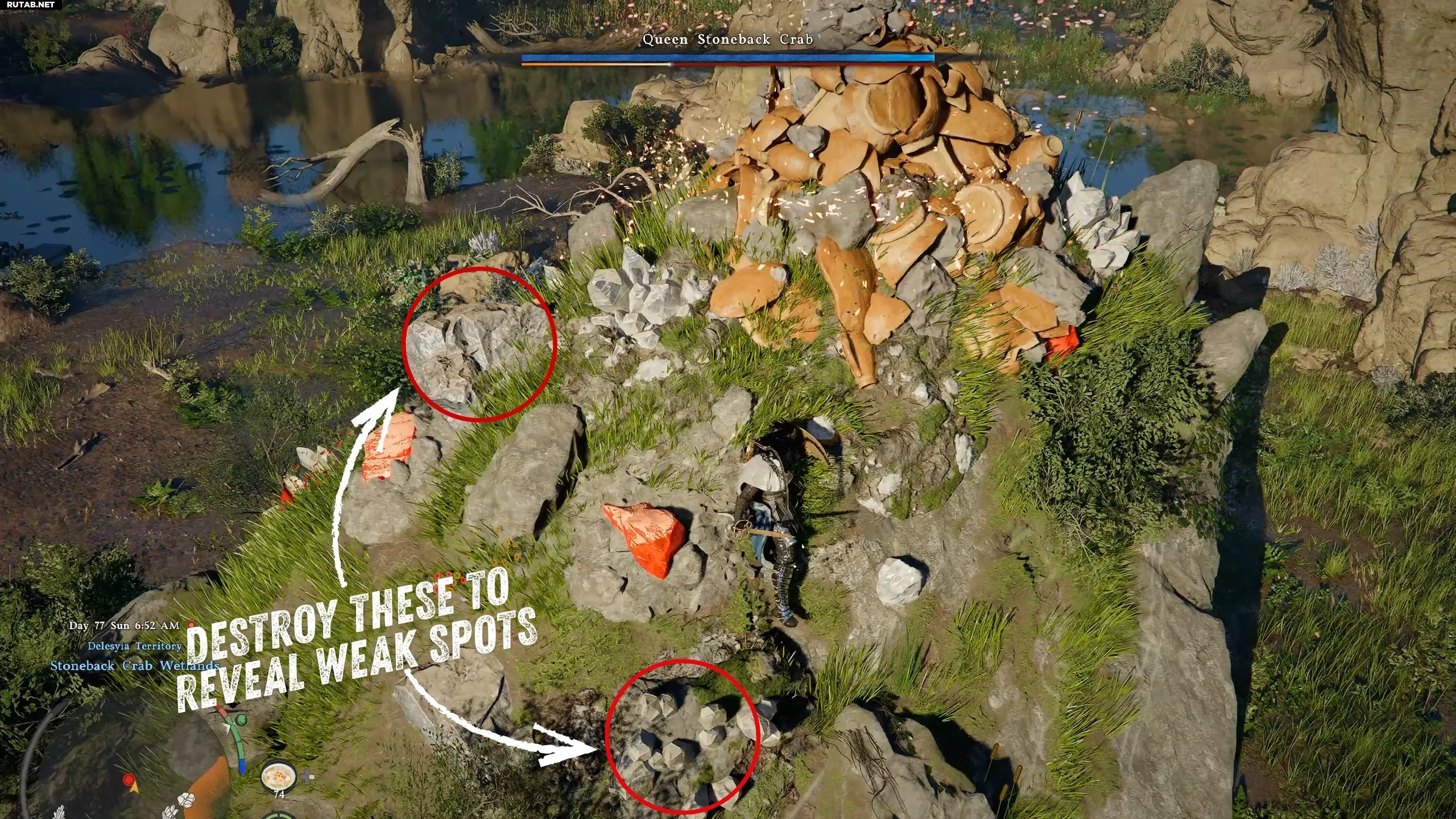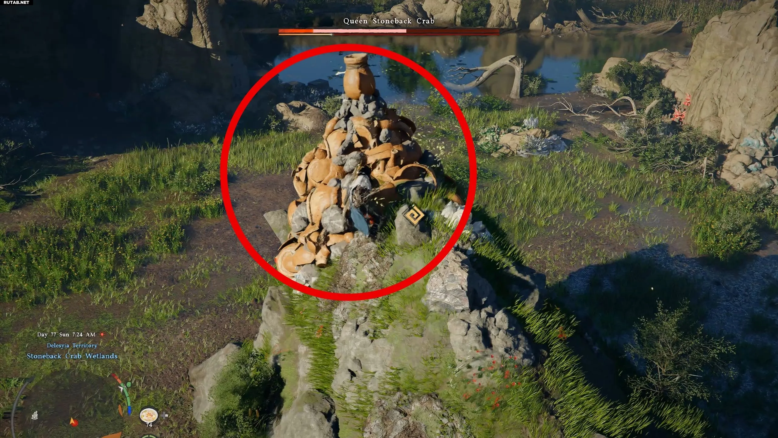 Начав задание, следуйте маркеру к близлежащей долине, полной минеральных жил. В центре поля вы увидите странный каменный выступ. Приближение к нему запустит битву с Королевским Каменным Крабом.