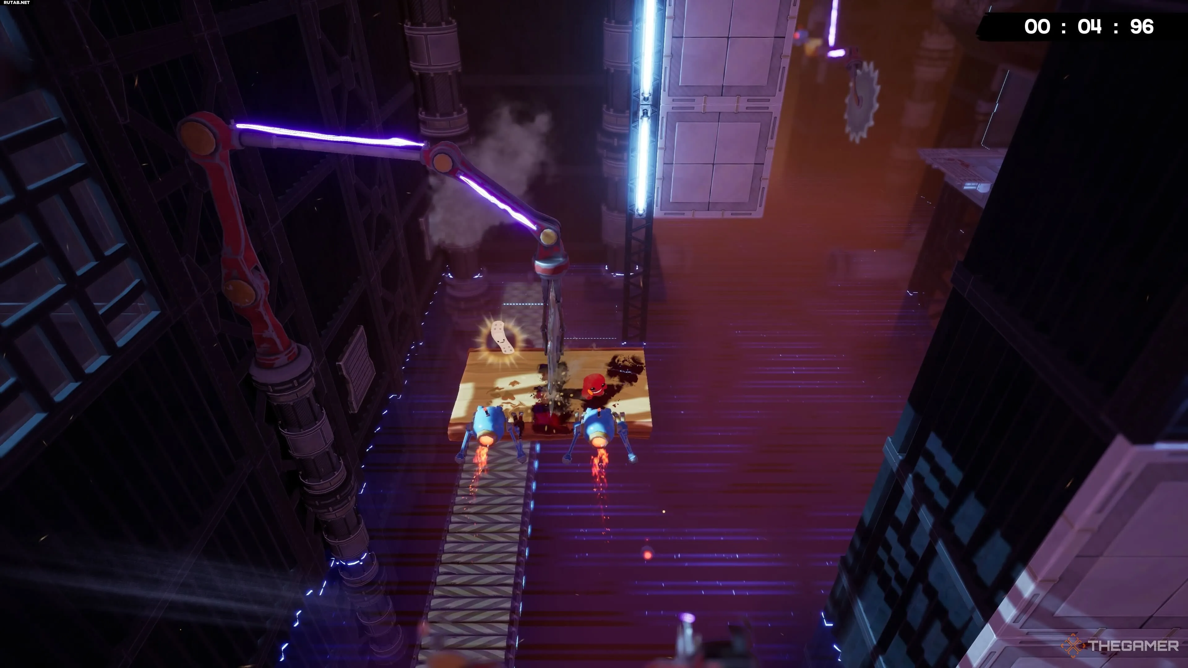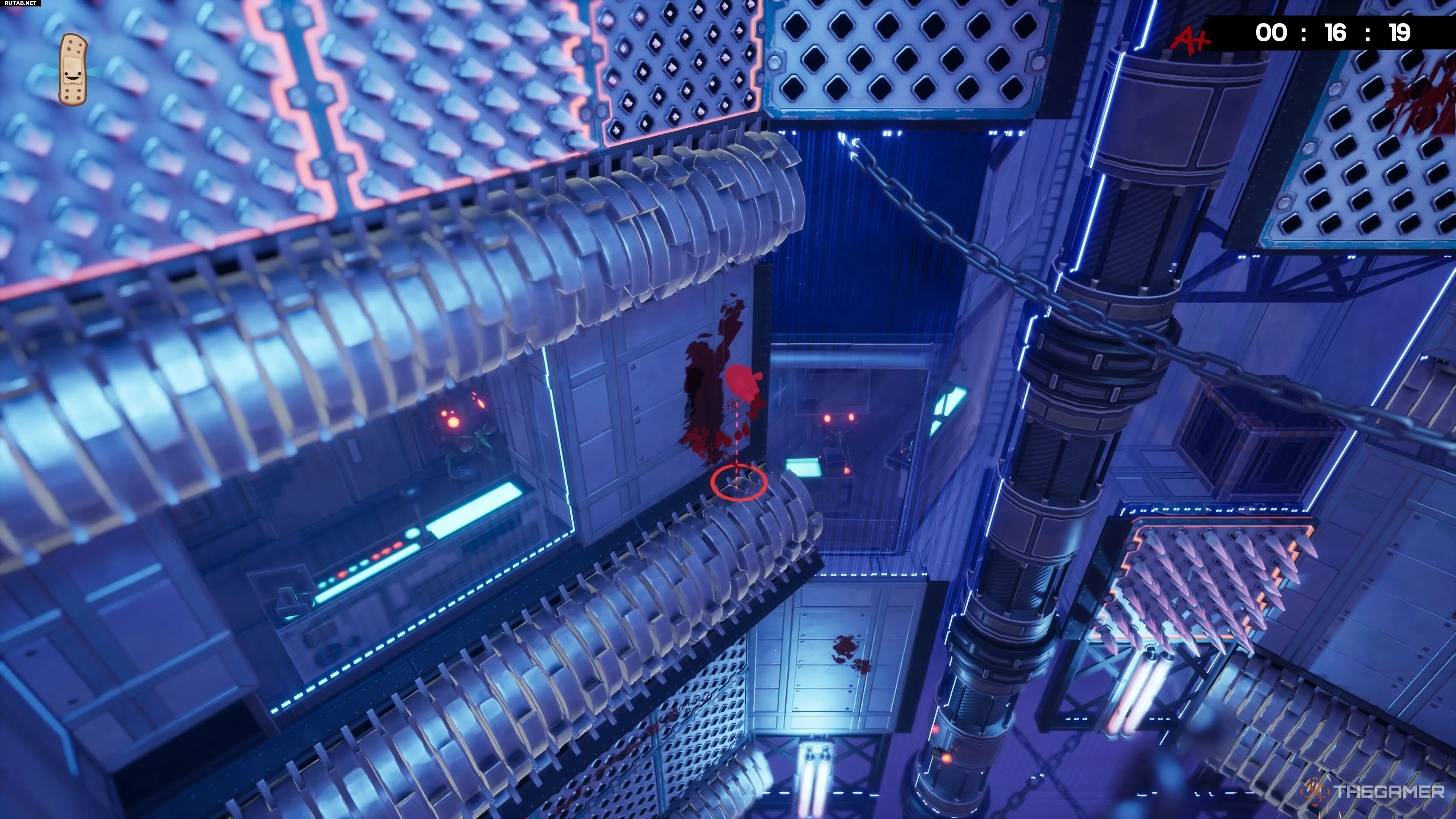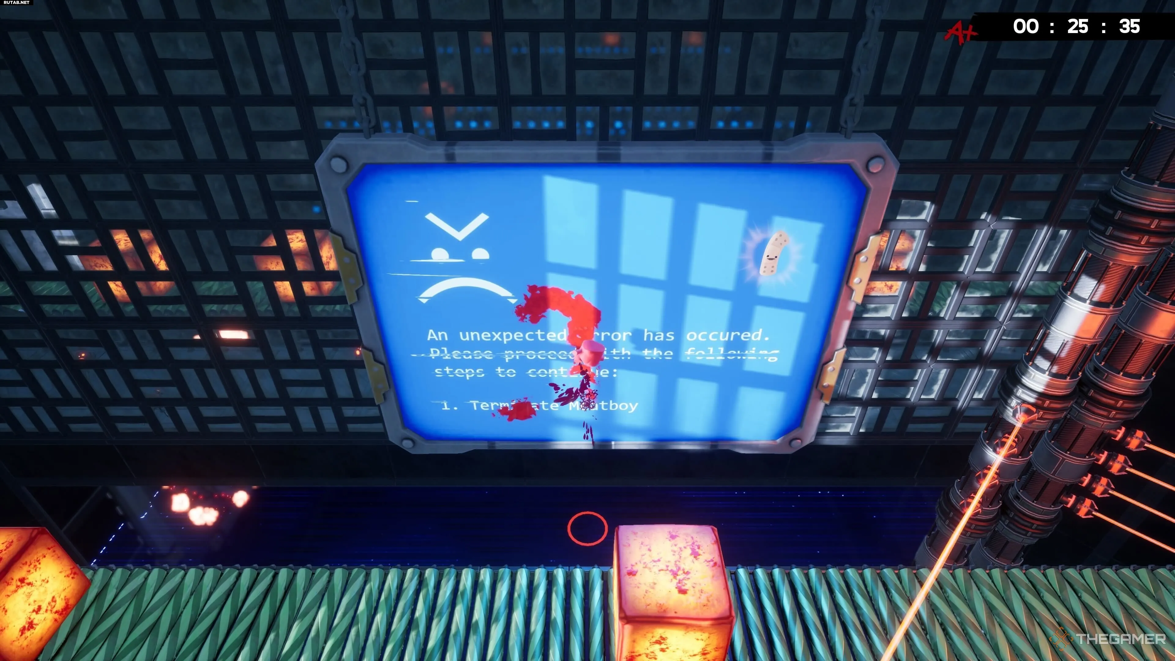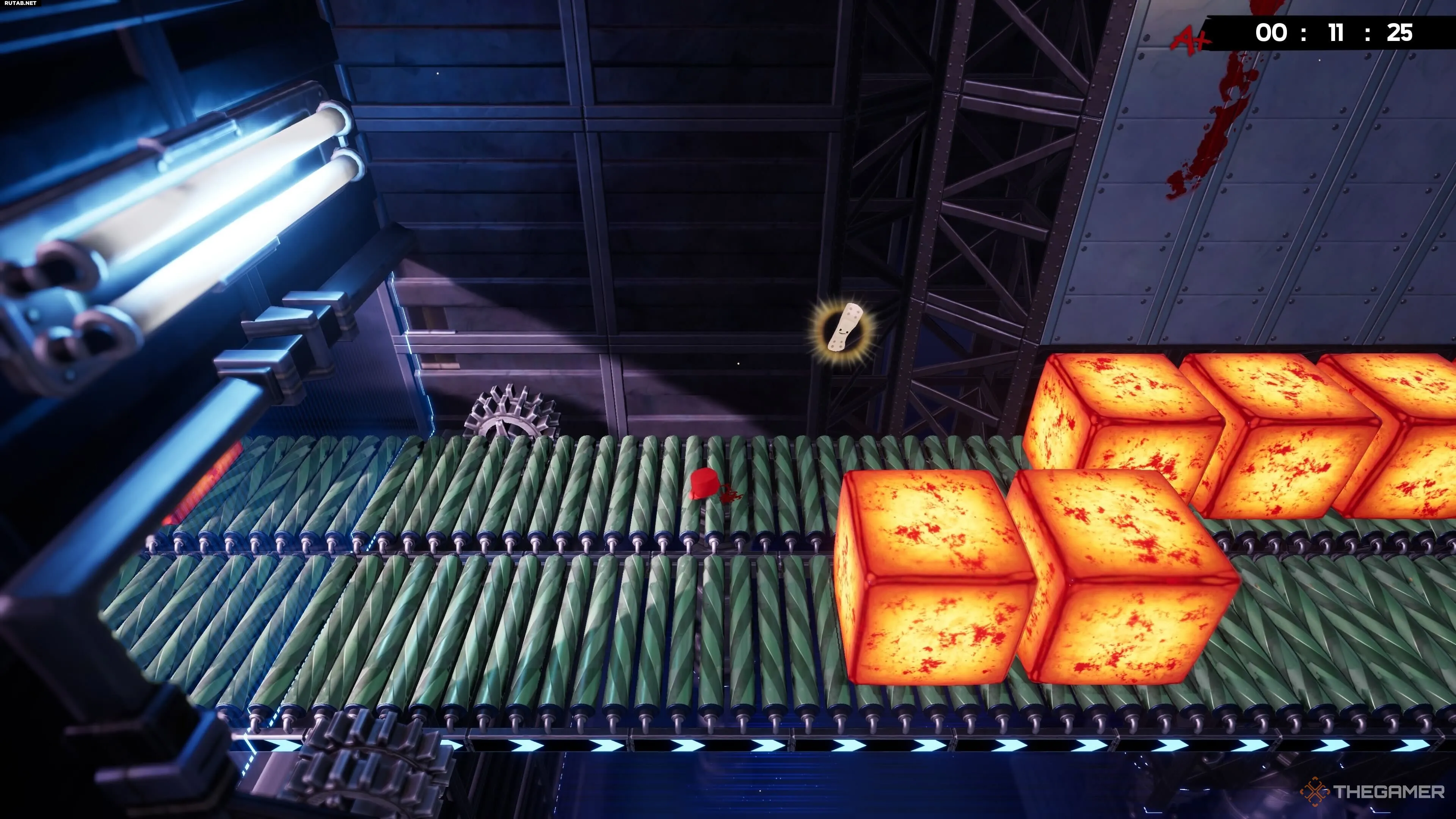 На уровне Hot Blocks найти бинт тоже довольно просто, хотя добраться с ним до конца уровня — это уже раздражающая часть. После вашего первого подъёма по конвейеру вы увидите другой конвейер, который ведёт вас дальше вверх.