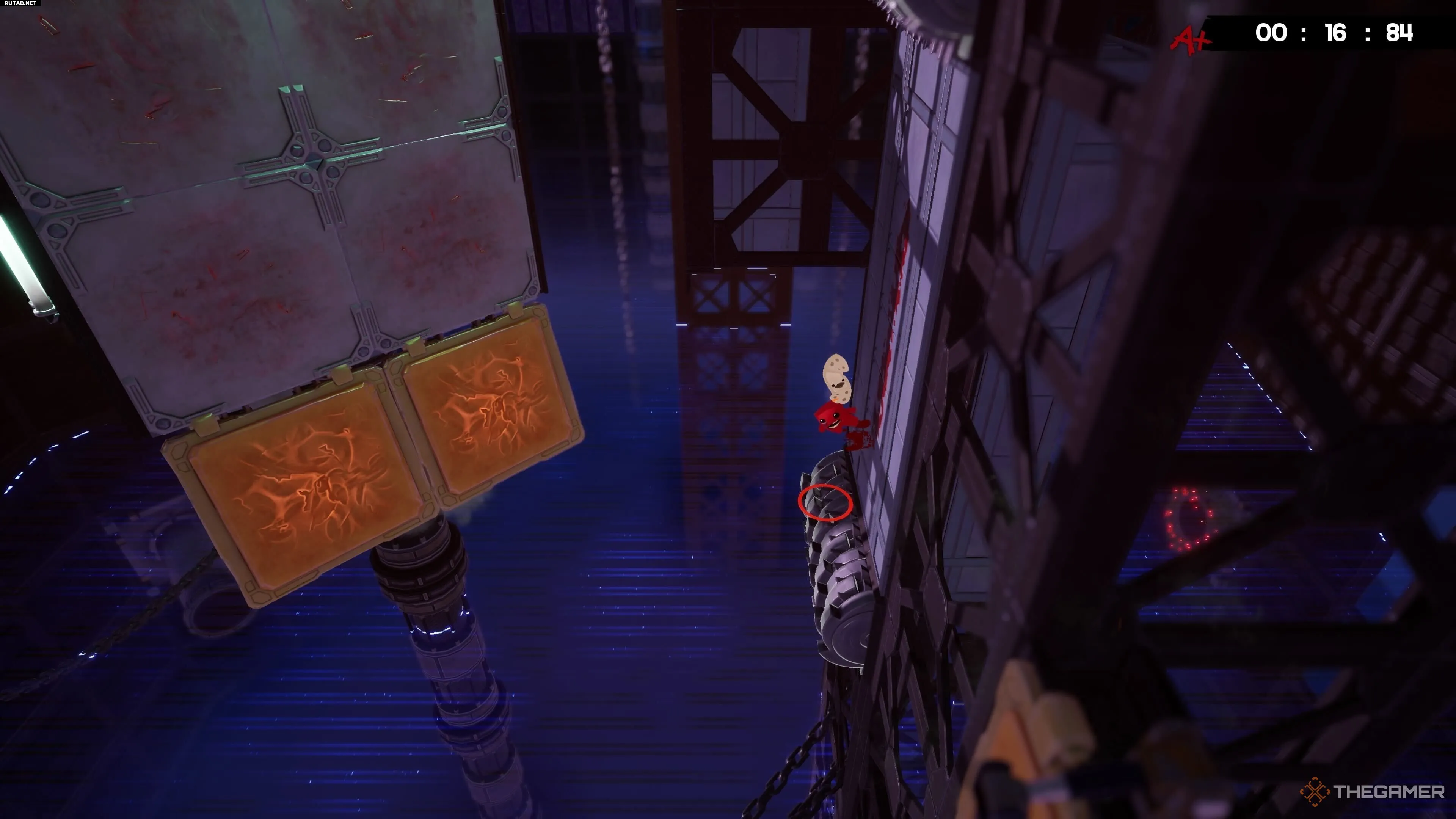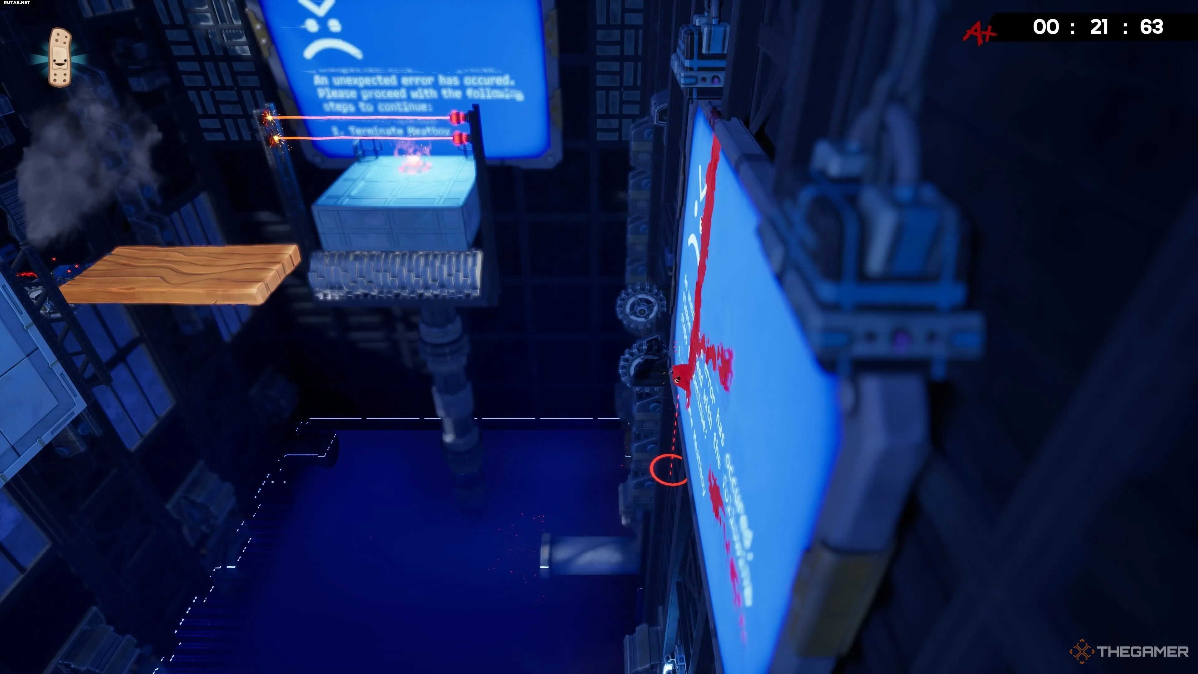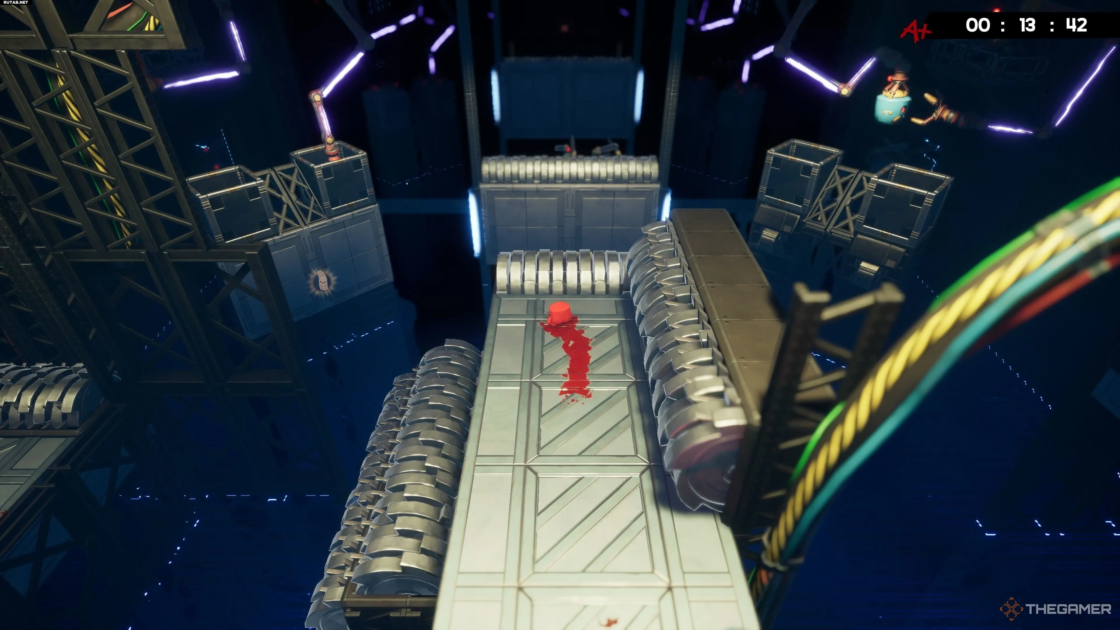 На уровне Hot Blocks найти бинт тоже довольно просто, хотя добраться с ним до конца уровня — это уже раздражающая часть. После вашего первого подъёма по конвейеру вы увидите другой конвейер, который ведёт вас дальше вверх.
