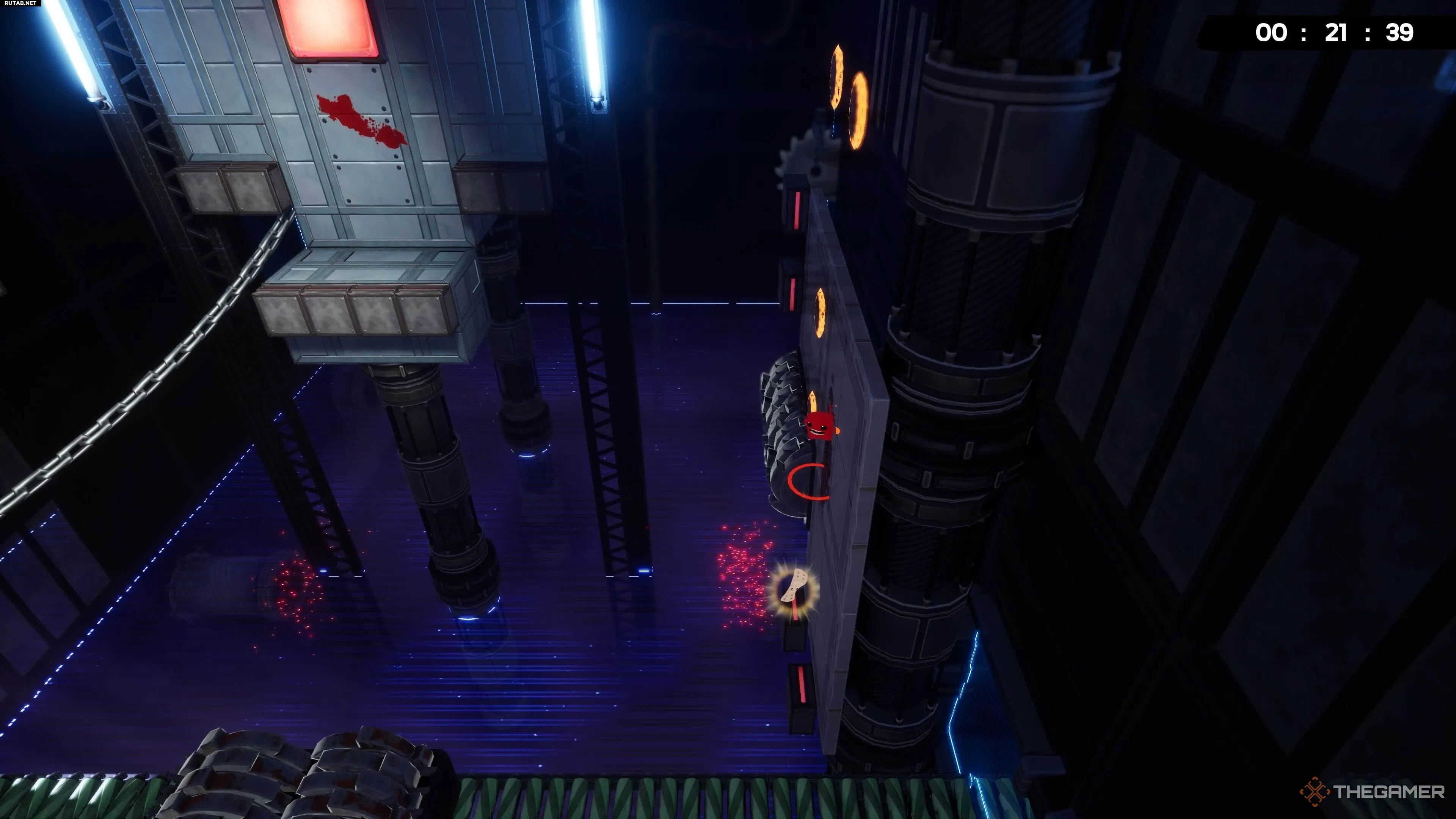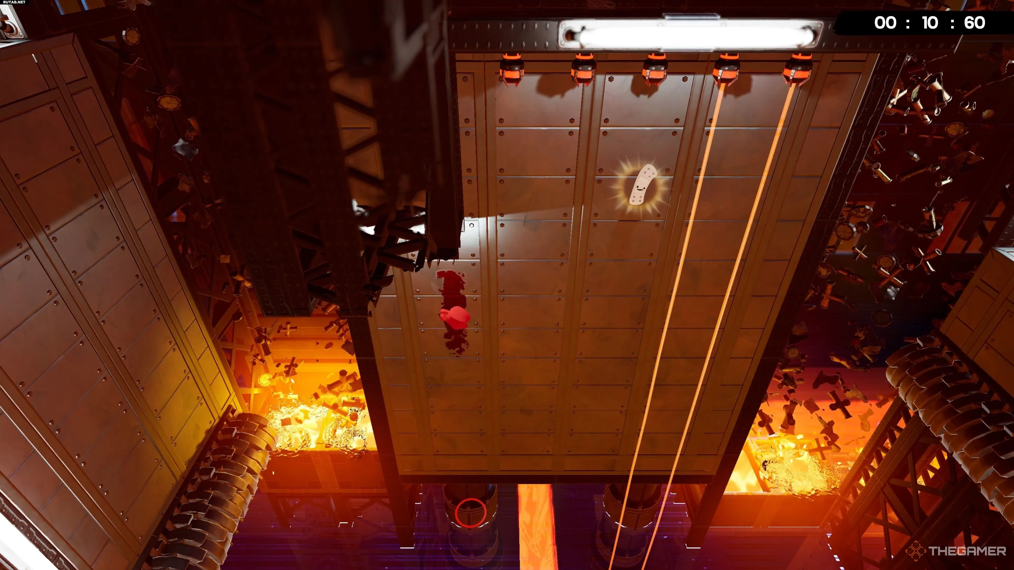 Добро пожаловать на один из моих самых нелюбимых уровней во всей Super Meat Boy 3D. Чтобы получить бинт здесь, доберитесь до конвейерной ленты в конце уровня и подождите, пока горячие блоки перекроют лазеры, открыв вам путь налево. После этого просто прыгайте вверх по экрану к бинту.