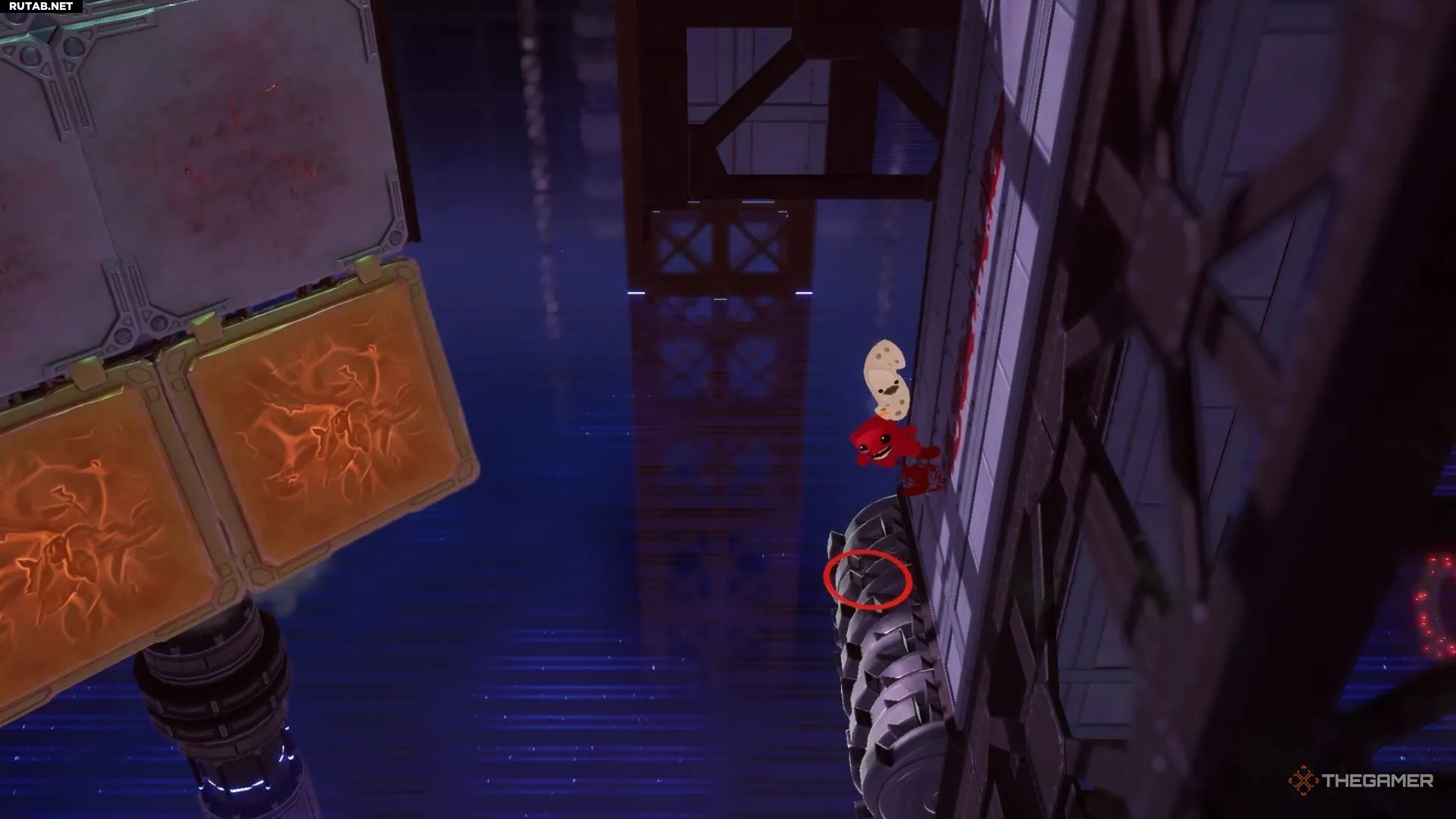 Вместо того чтобы подниматься, проедьте на нём и прыгните влево, чтобы добраться до бинта. Просто будьте осторожны с теми самыми горячими блоками, которые будут проезжать мимо, а затем используйте стену, чтобы перепрыгнуть обратно.