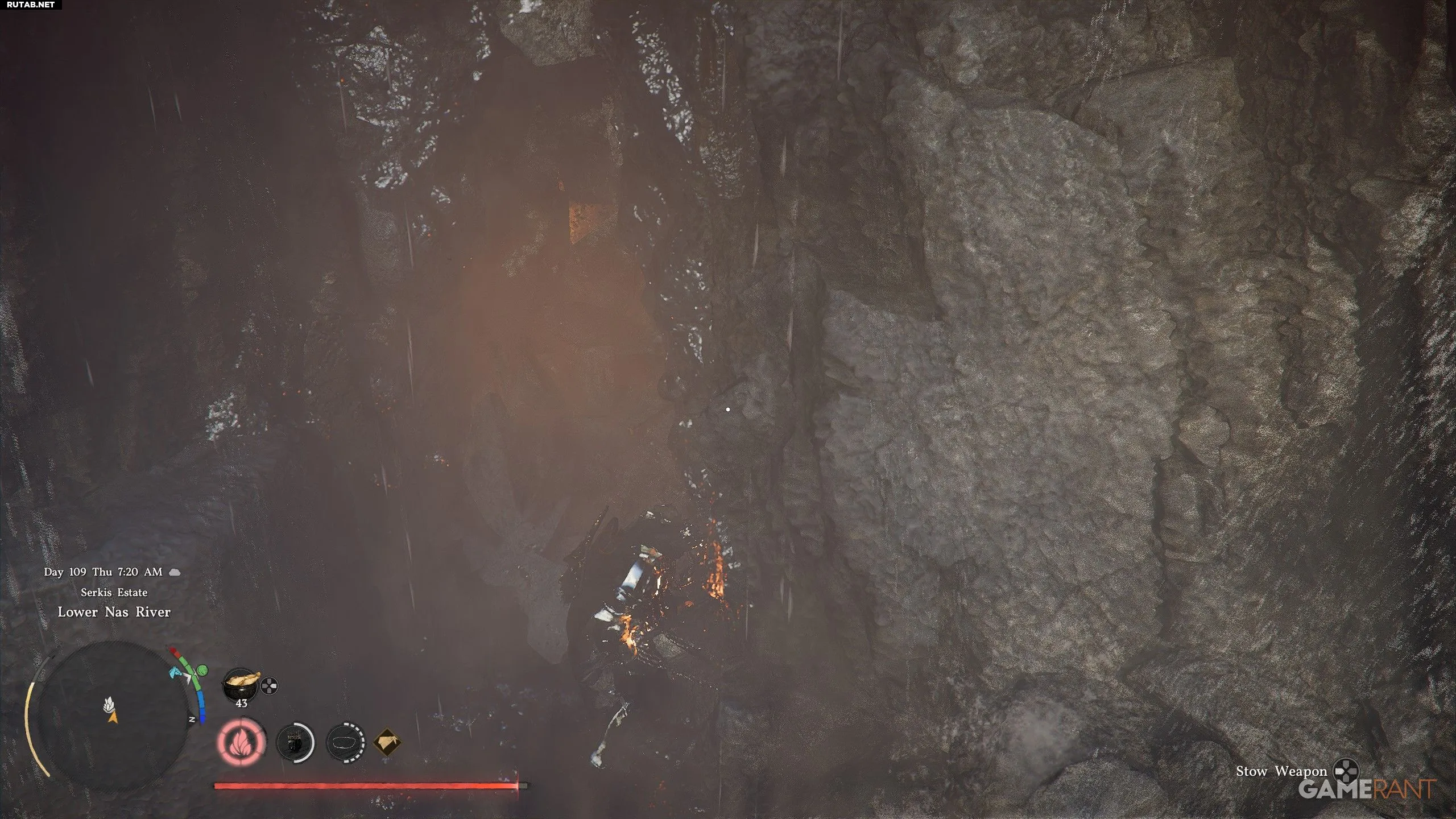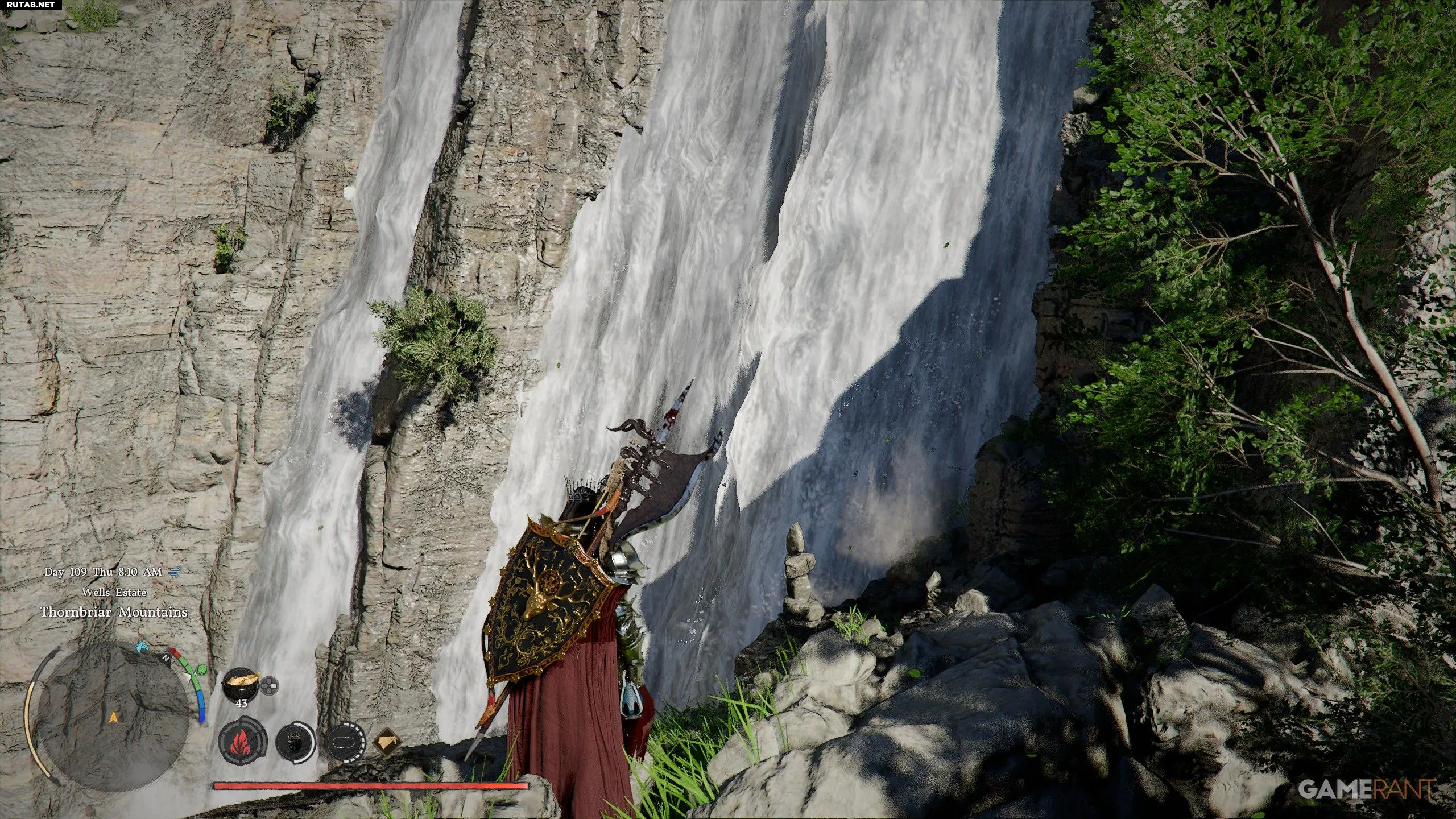 - Посмотрите на водопад слева — там вы увидите груду камней, указывающую на скрытую пещеру. Войти в водопад можно с помощью навыка «Удар» (R1+Треугольник).