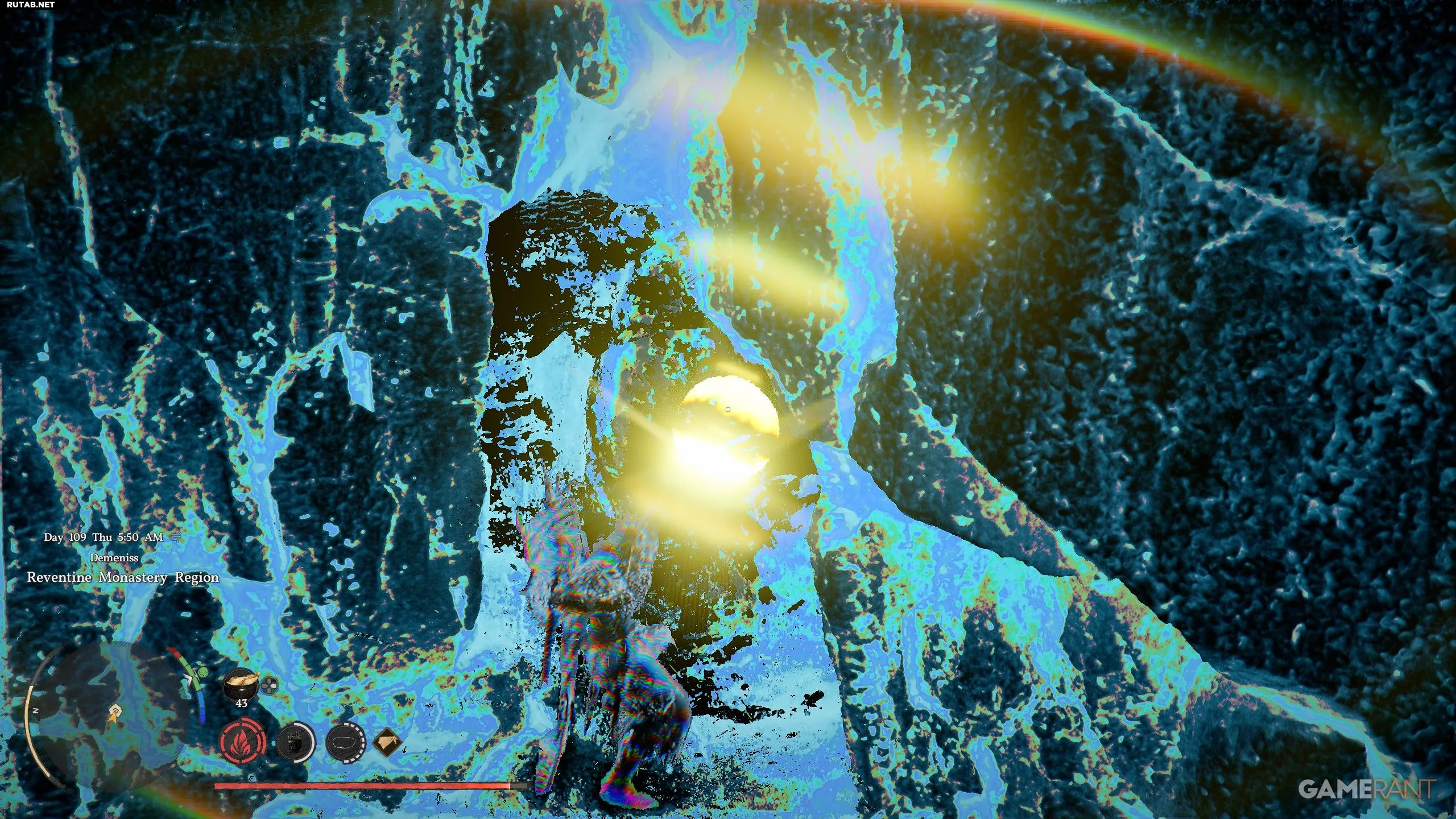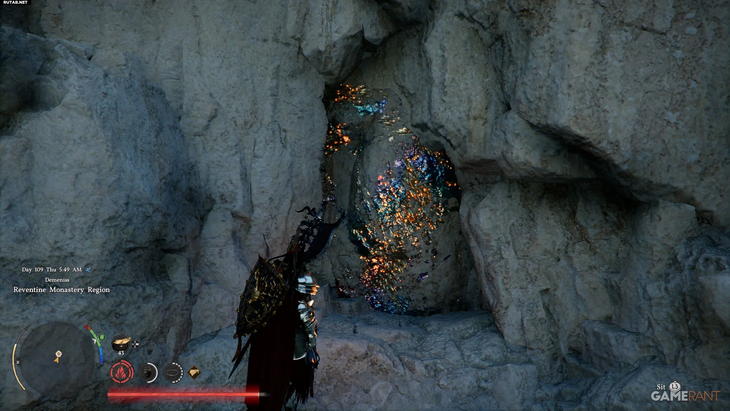 - Двигайтесь на запад от буквы «D» в названии «Demeniss», и вы найдёте скальную стену, покрытую странным металлом, если смотреть на восток.
