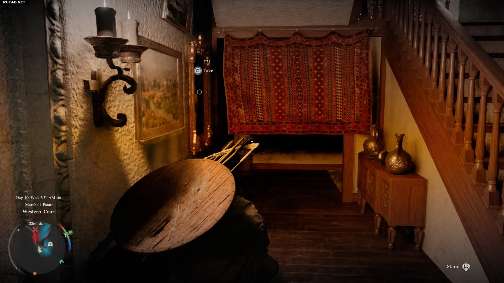 Попасть в здание можно разными способами (например, через окно на первом этаже с юго-запада). Внутри нужно спуститься по лестнице и найти занавес под её нижним пролётом.