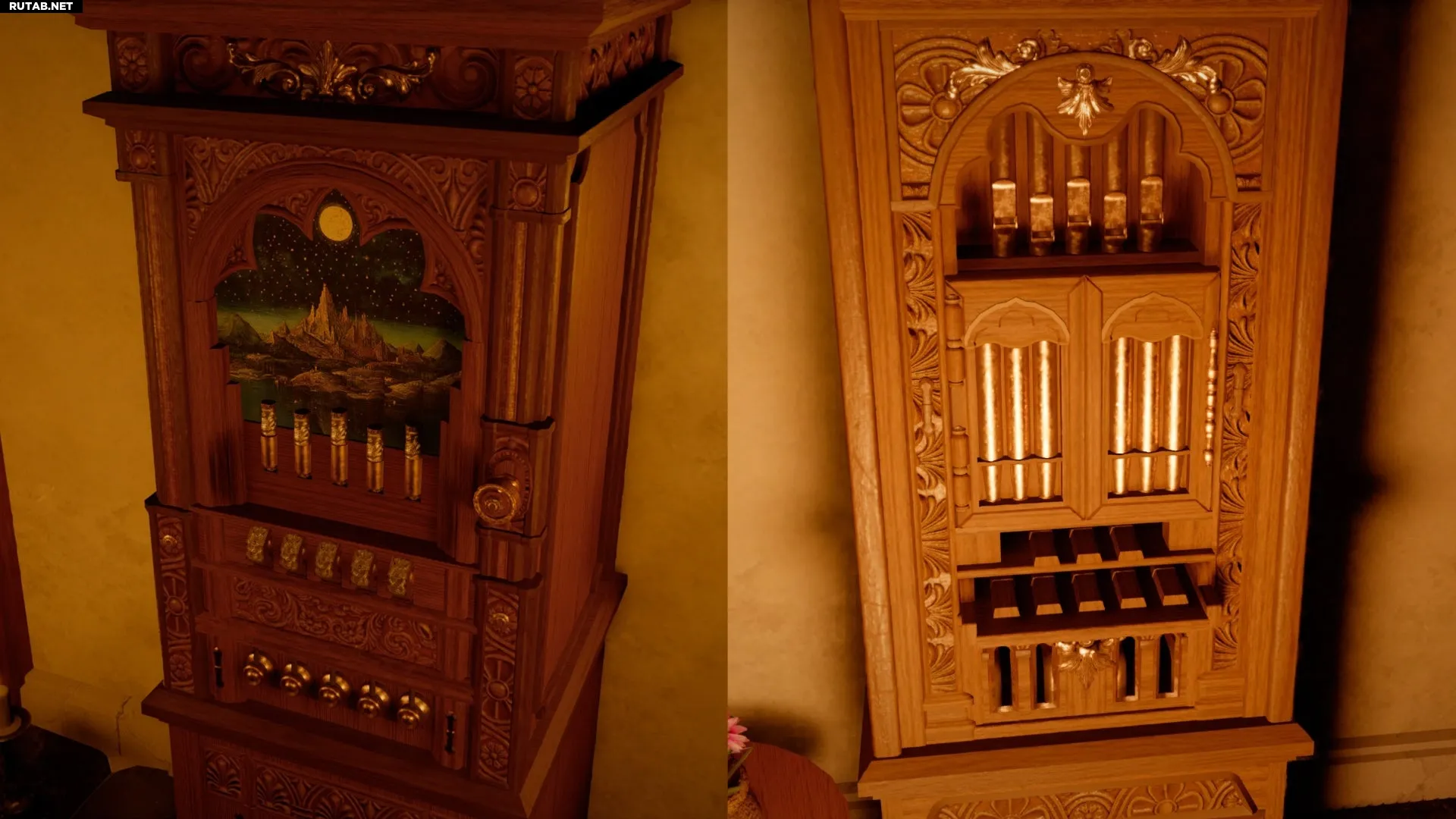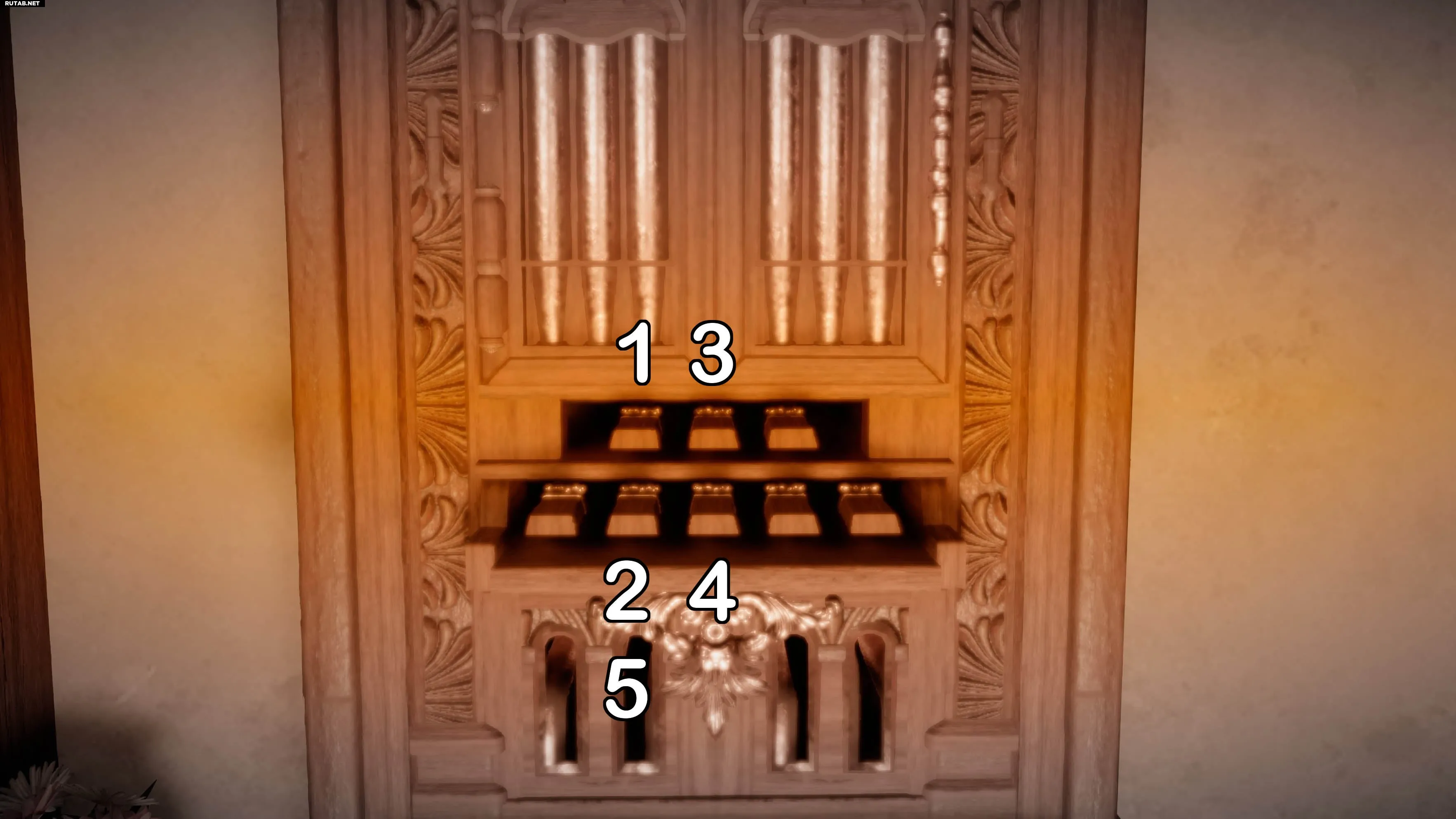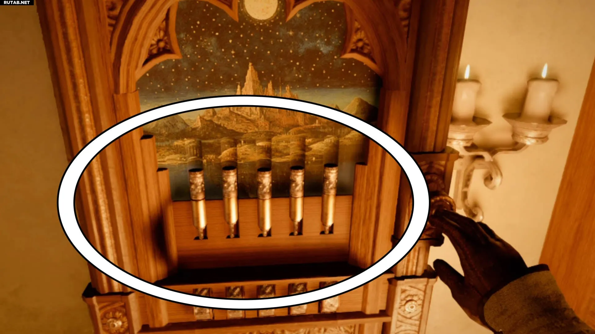 Это музыкальная головоломка. Нужно сыграть на клавишах мелодию, которую задаёт рукоятка с правой стороны сундука.