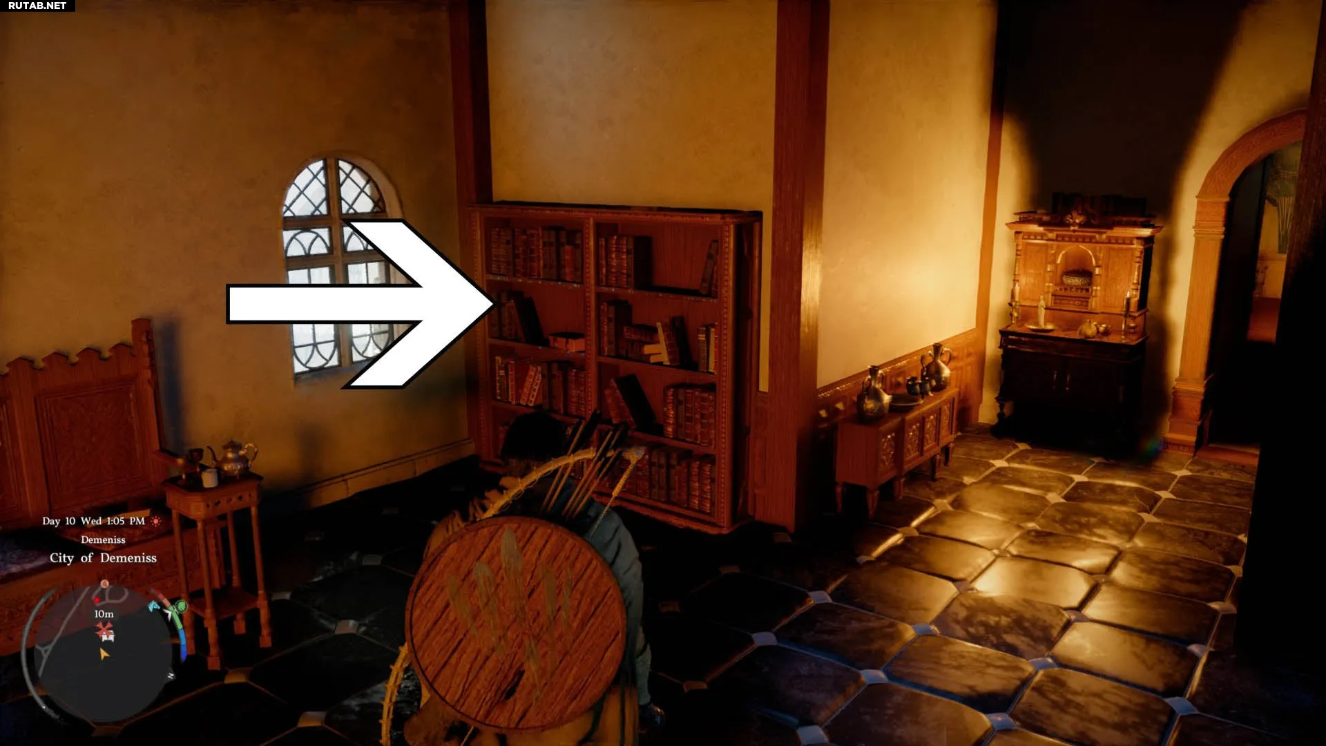 Как и в первом случае, спуститесь на нижний этаж, найдите книжный шкаф у стены и взаимодействуйте с ним, чтобы попасть в тайную комнату.