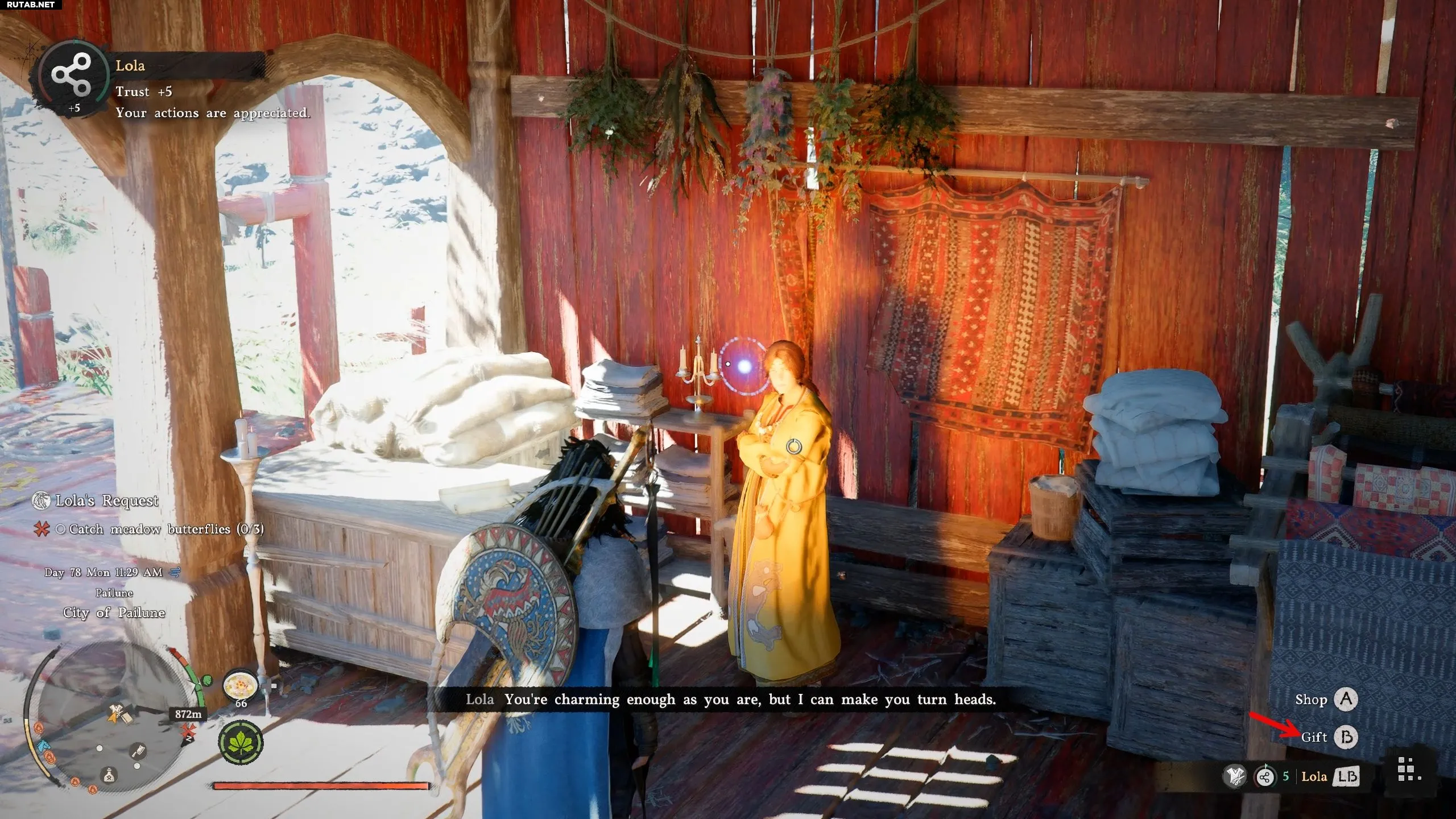 Чтобы повысить уровень доверия Лолы, можно взаимодействовать с ней и зайти в меню подарков. Лола принимает в подарок медные кошельки, которые можно получить, побеждая мелких врагов, бродящих по землям Пайвела. Каждый подаренный медный кошелёк повышает доверие Лолы на 5%, поэтому вам потребуется подарить ей как минимум 18–19 медных кошельков, чтобы достичь 100%.