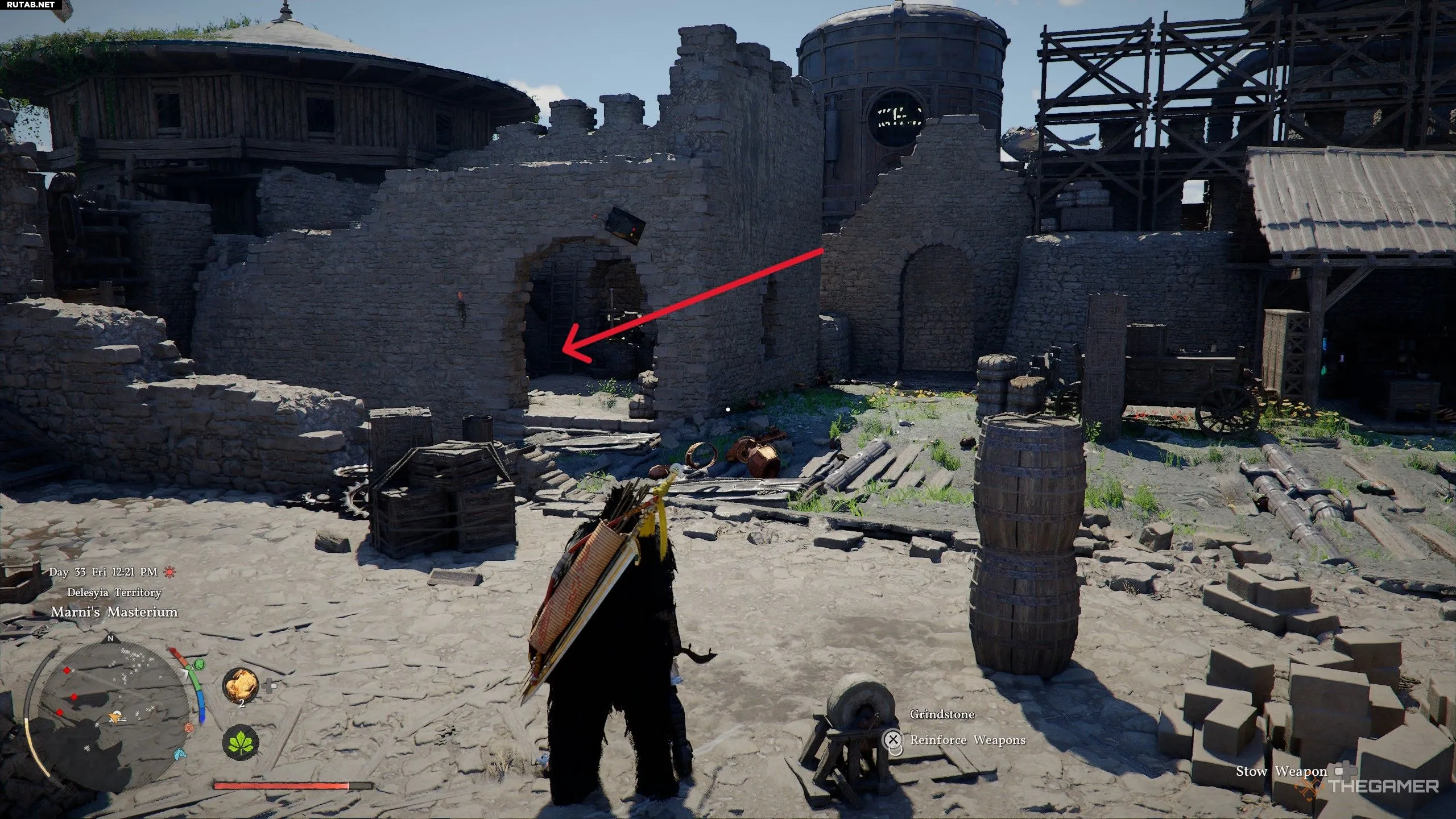 Во внутреннем дворе находится большой голем, который может нанести и выдержать много урона. Попробуйте попасть в мастерскую через разрушенную крышу, чтобы избежать встречи с ним.