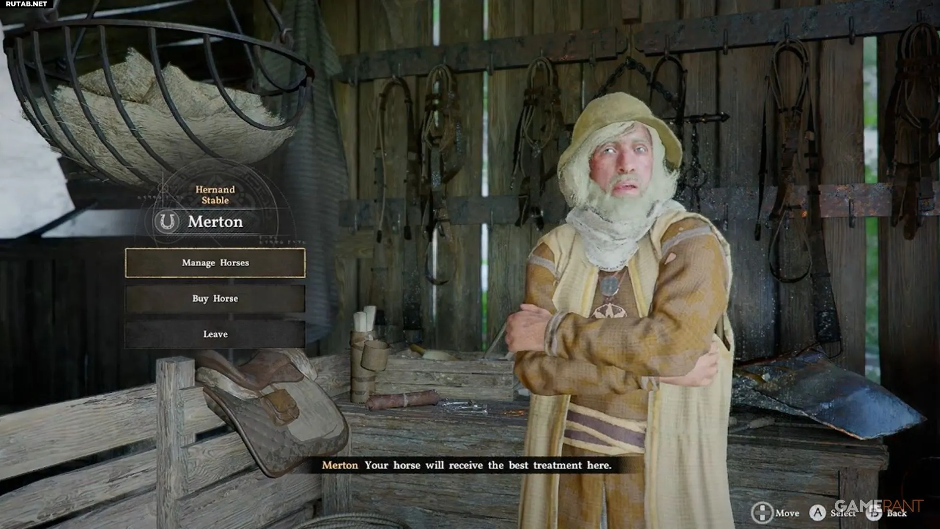 Поговорите с NPC, отмеченным иконкой подковы (в Хернанде его зовут Мертон), чтобы купить лошадь или управлять имеющимися. После взаимодействия с ним здоровье вашего скакуна автоматически восстановится до максимума.