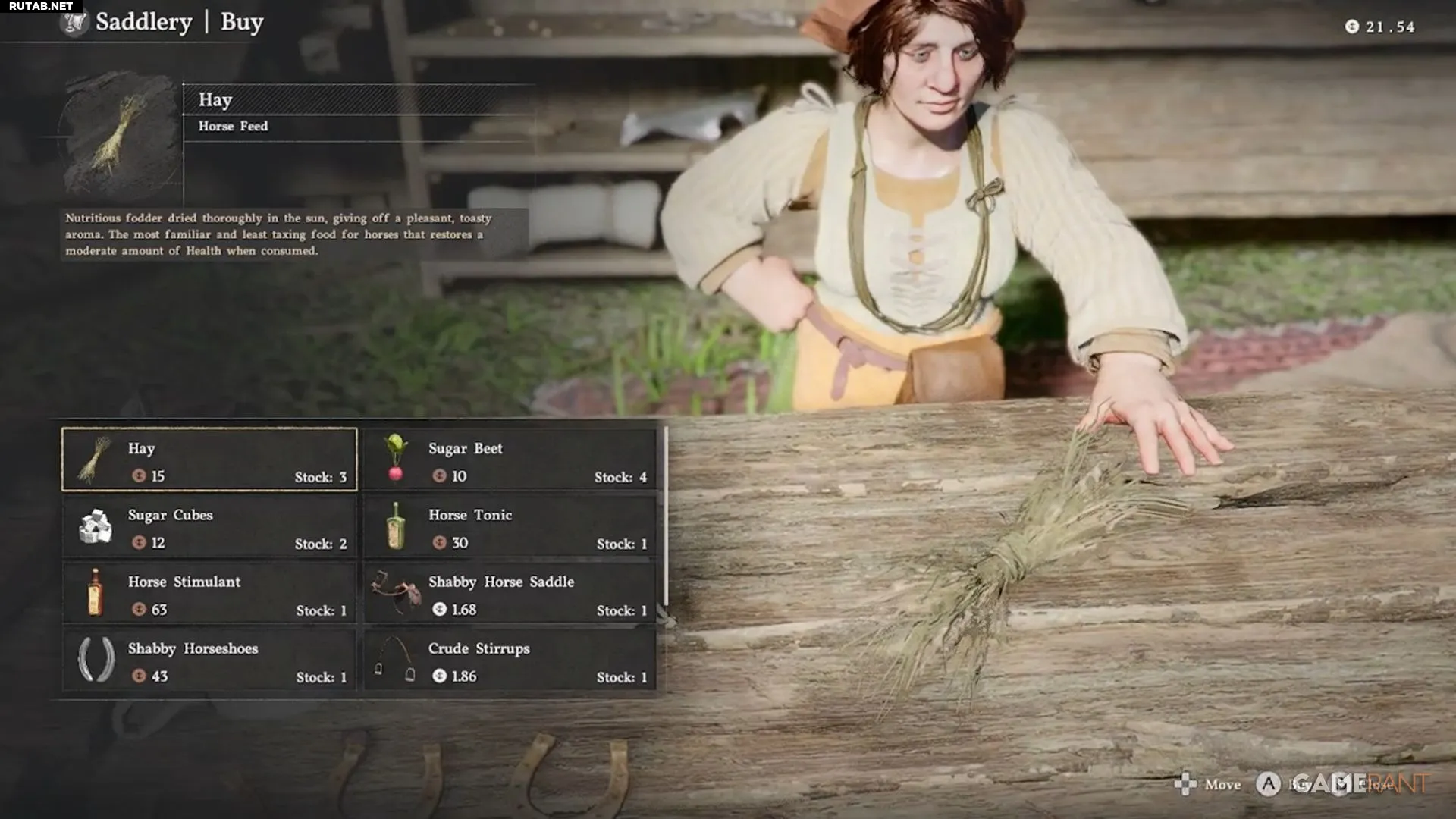 Рядом с конюшней находится Седловарня, где можно купить корм: сено, кубики сахара или сахарную свёклу. Купив еду, возьмите её из инвентаря и положите на землю перед своей лошадью, чтобы та поела. Будьте осторожны: если поблизости есть другие лошади, они могут перехватить угощение.