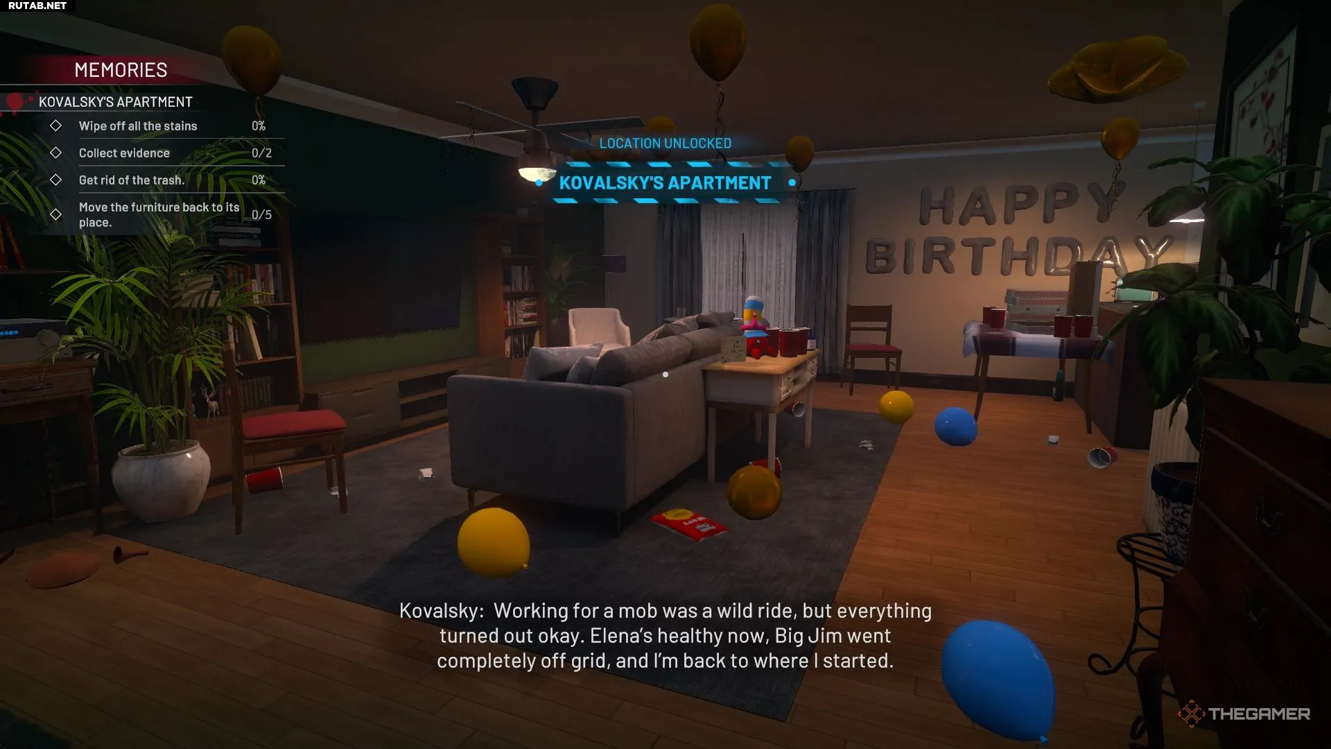 В квартире видно, что здесь проходил день рождения: повсюду разбросаны шарики и мусор. Начните с уборки мусора, включая гирлянды, свисающие с вентилятора над диваном. Поправьте картину на стене справа от кухни.