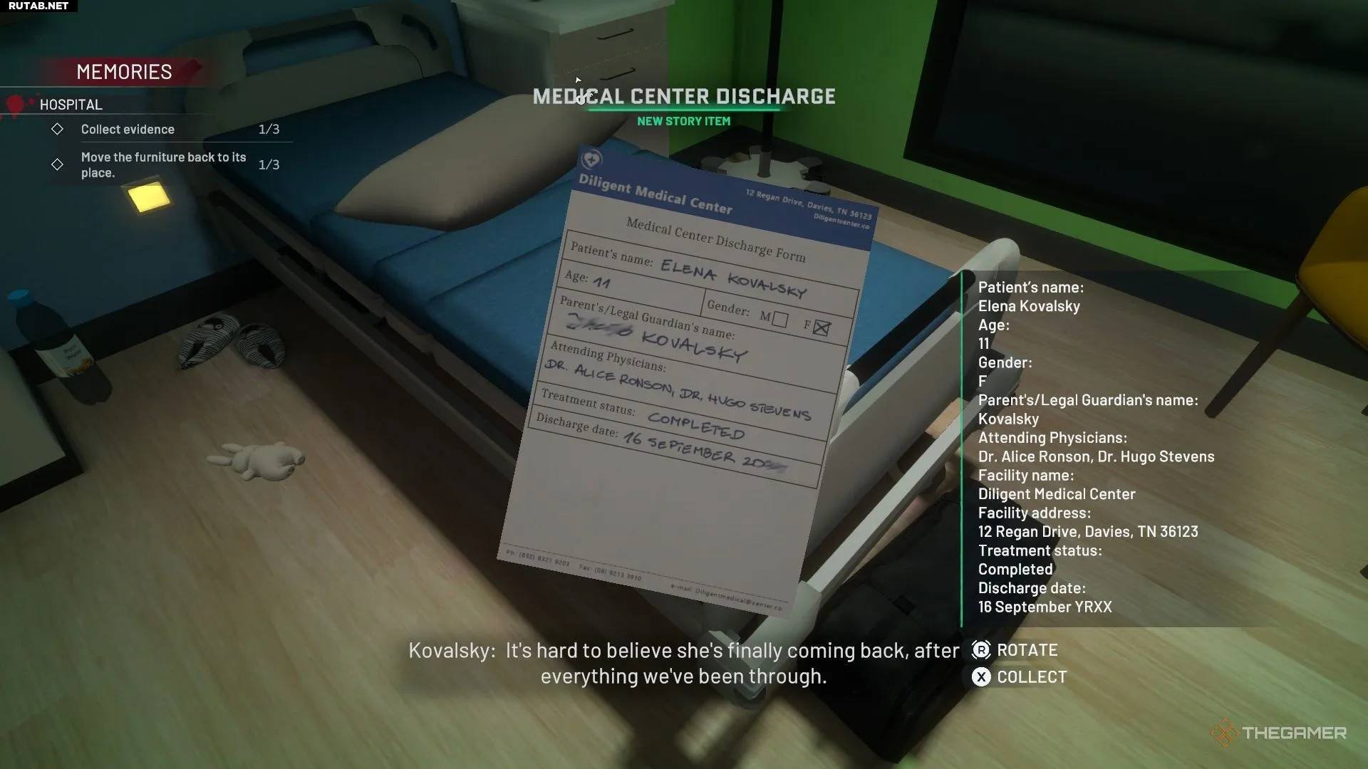 В этой палате находилась дочь Ковальски, Елена, за которой ухаживали. Здесь нужно вернуть на место синий стул у больничной койки и собрать лежащие на кровати выписные документы (доказательство).