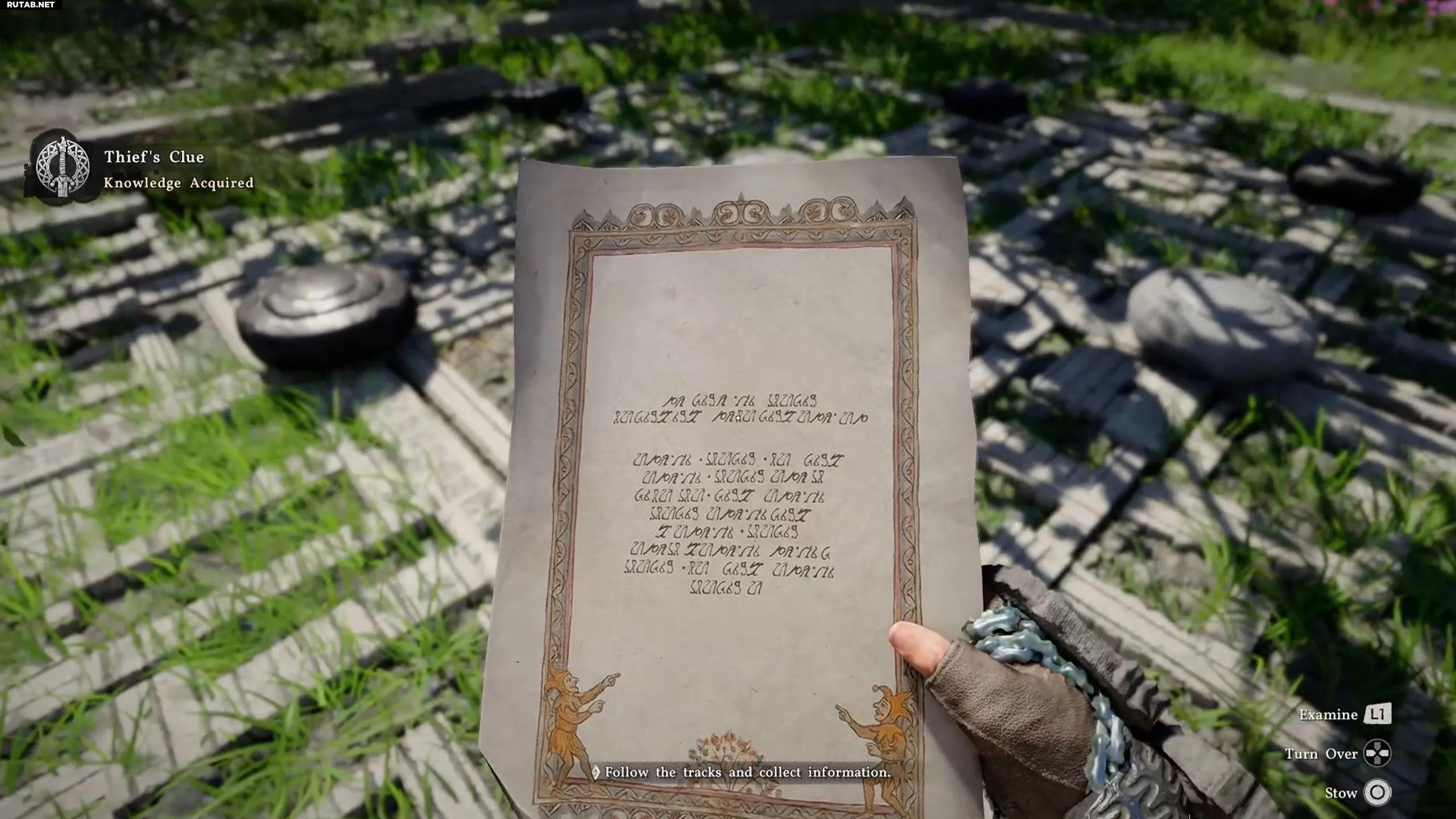 На месте развернитесь на юго-восток, подойдите к последним двум рядам и возьмите белую фигуру. Под ней вы найдете следующую записку вора и «Фрагмент из Сумеречного Леса». Снова не забудьте прочитать записку из инвентаря.