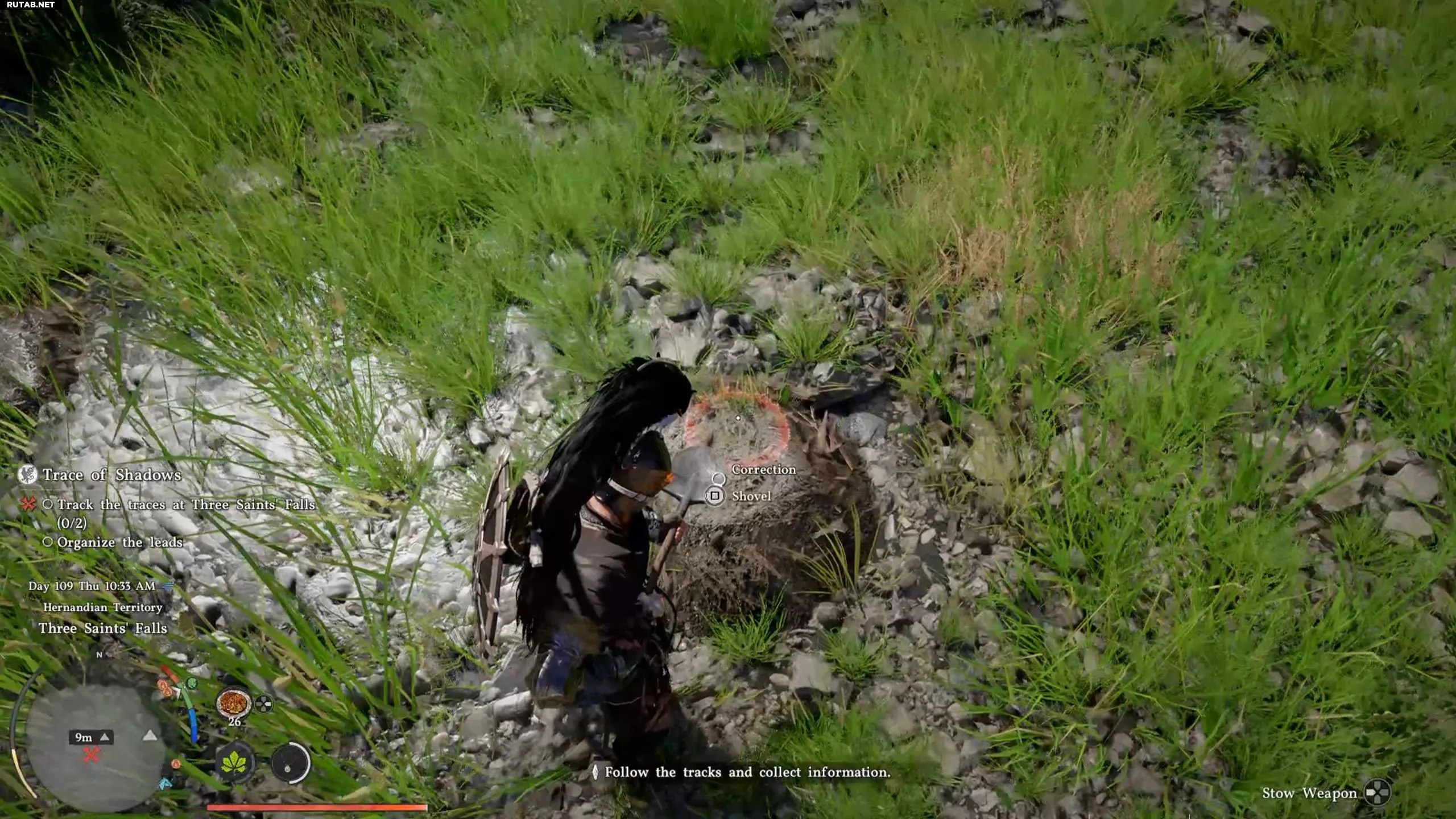 Отправляйтесь к Трем Святым Водопадам. Под мостом вы найдете несколько земляных холмиков. Вам нужно обыскать их с помощью лопаты. Подойдите к холмику и дождитесь появления подсказки для копания.