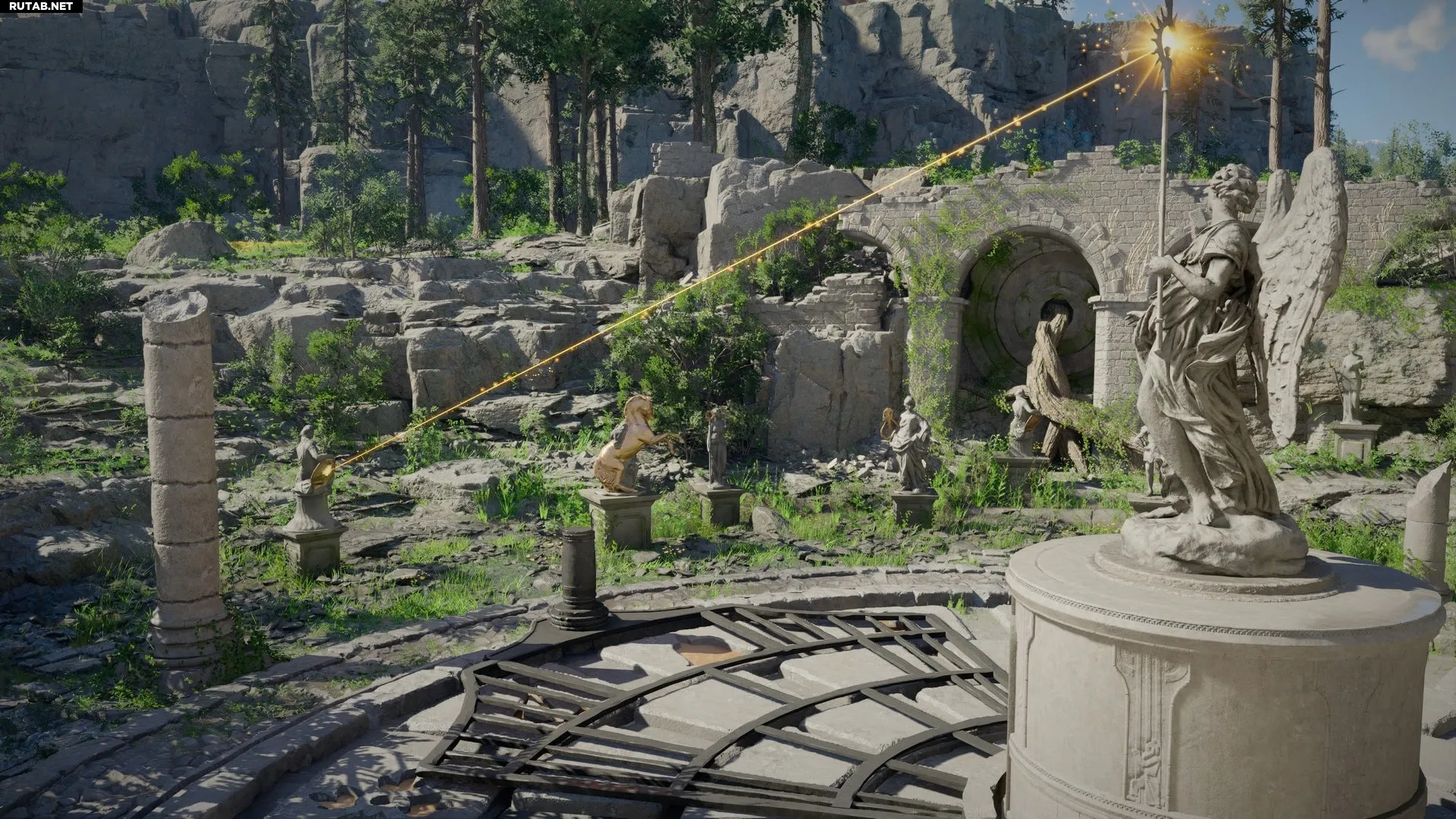 Прибыв на место, вы увидите большую статую ангела, окруженную каменным полом с высеченными символами и металлической решеткой. Вокруг также расположены меньшие статуи, держащие золотые предметы.